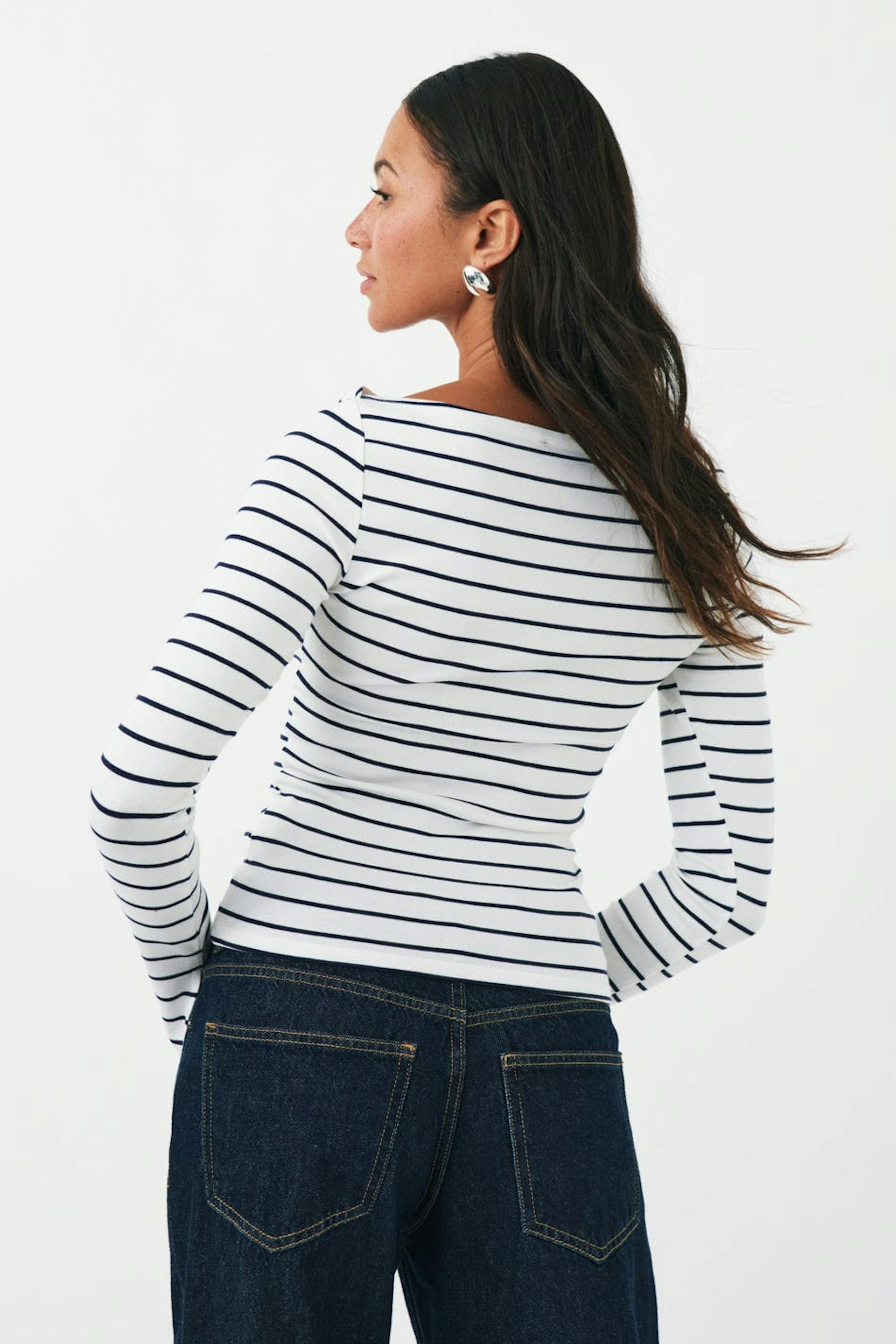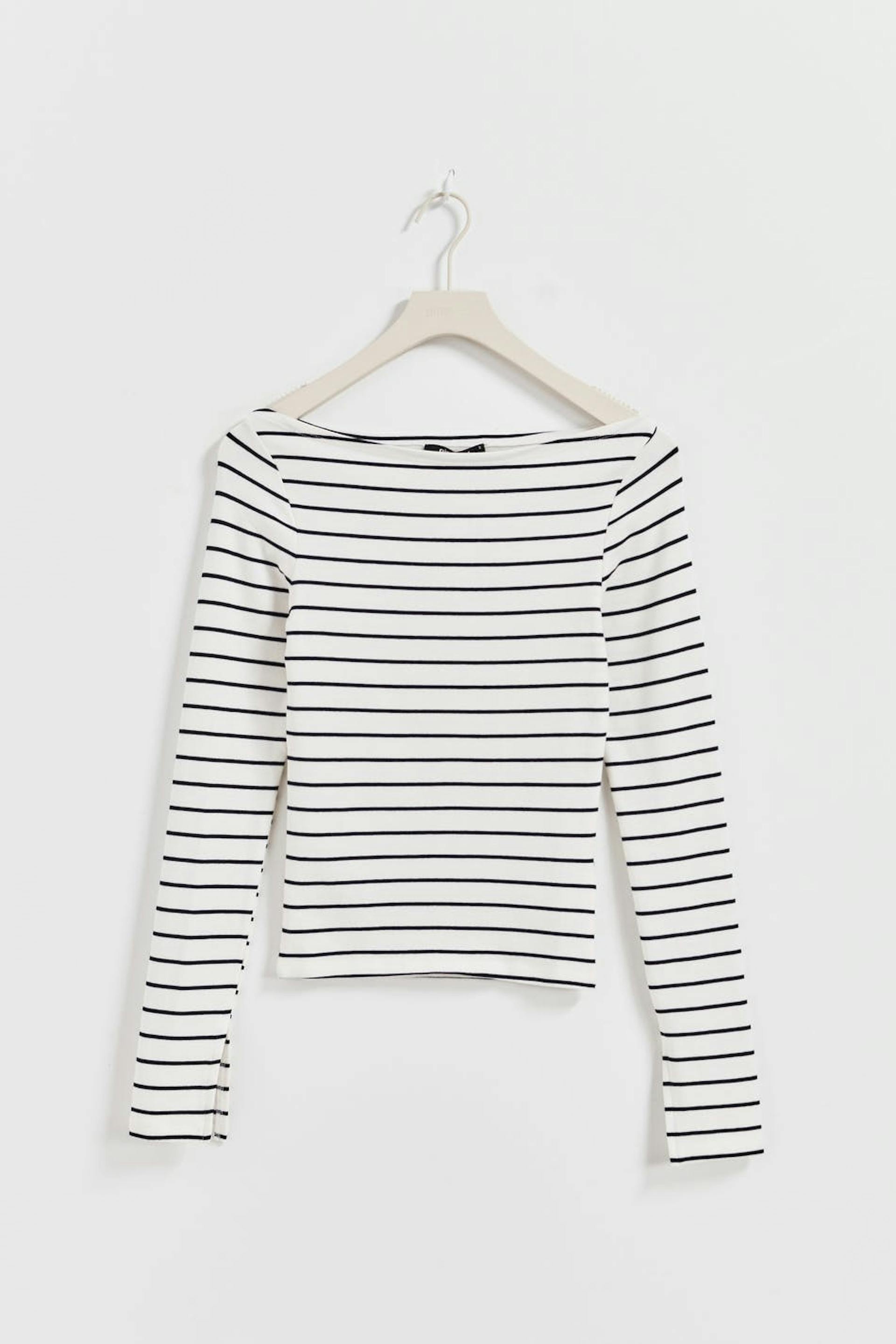 Gestreept topje met boot halslijn. Het topje is met lange mouwen, wit en zwart. Het heeft spleet aan de uiteinden van de mouwen en nauwsluitende pasvorm.
