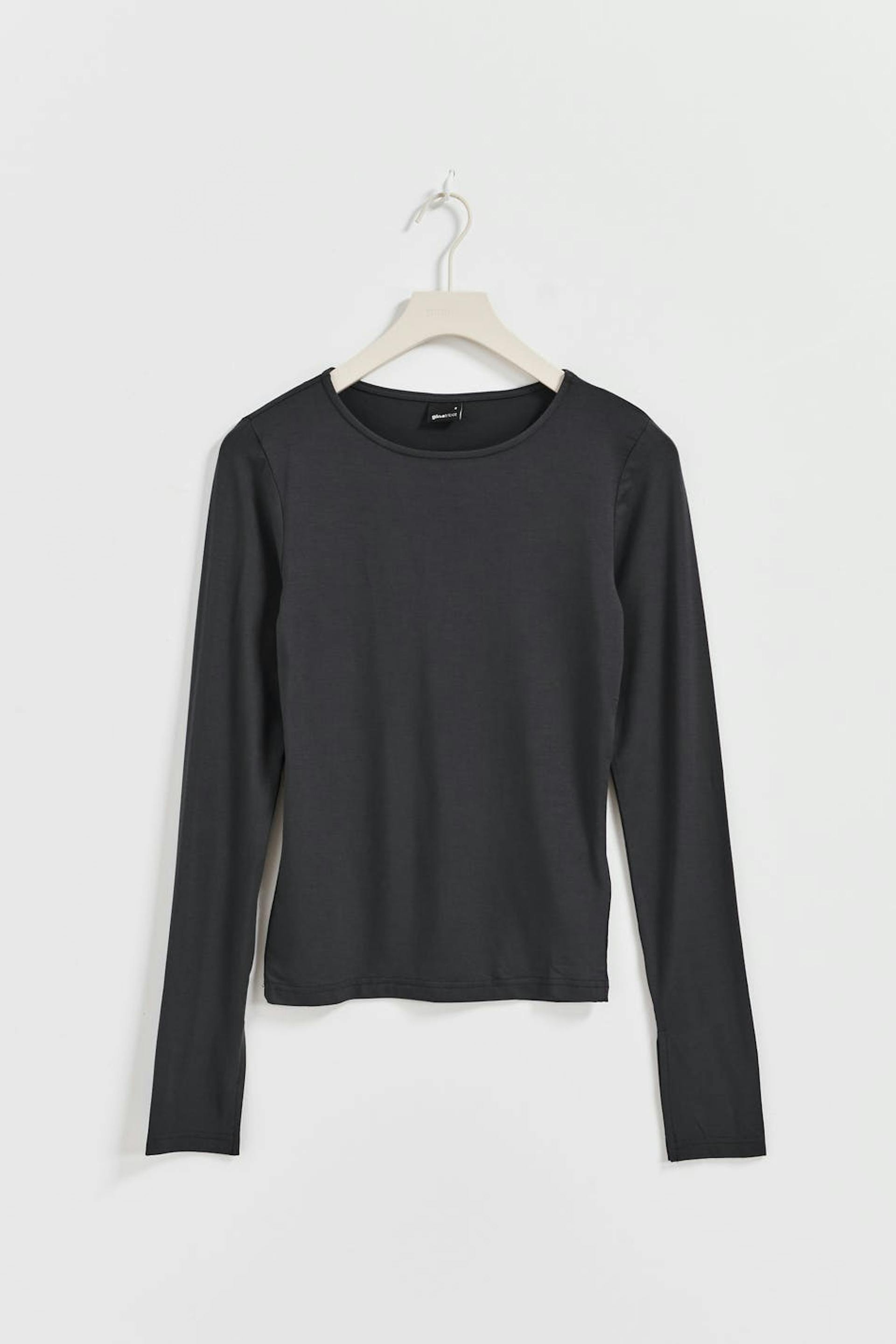 Soft touch – second skin comfort. Topje met lange mouwen van zacht viscose met nauwsluitende pasvorm. Het topje is grijs en heeft ronde halslijn. Het heeft spleet aan de uiteinden van de mouwen.