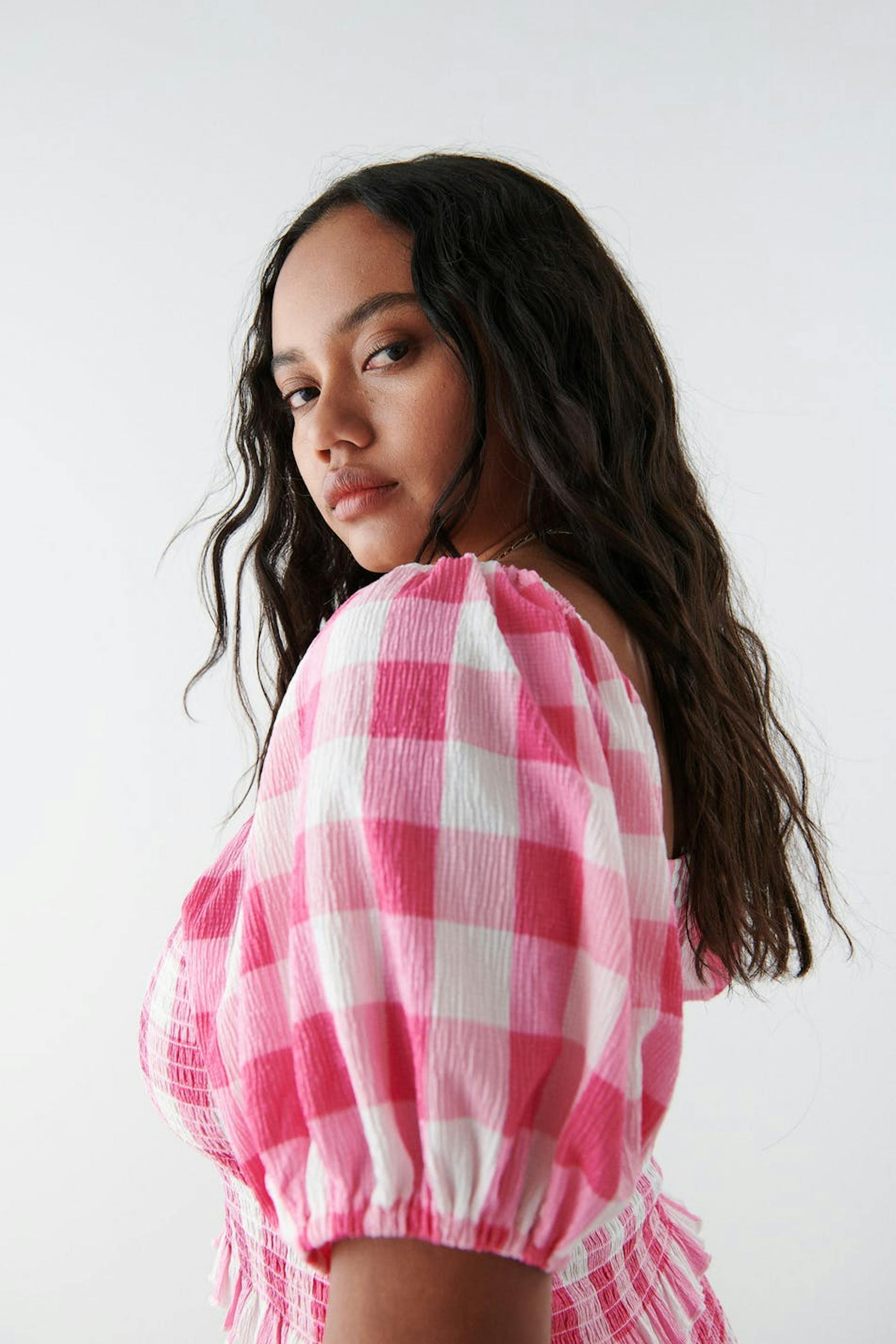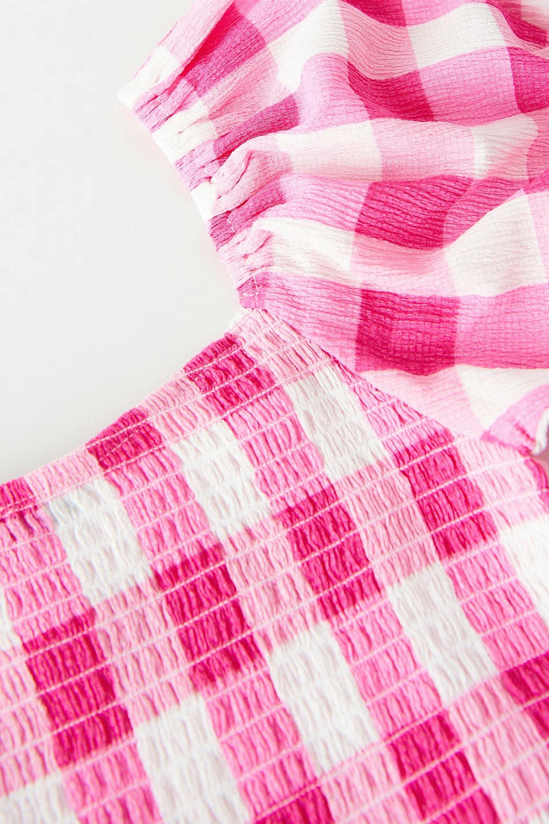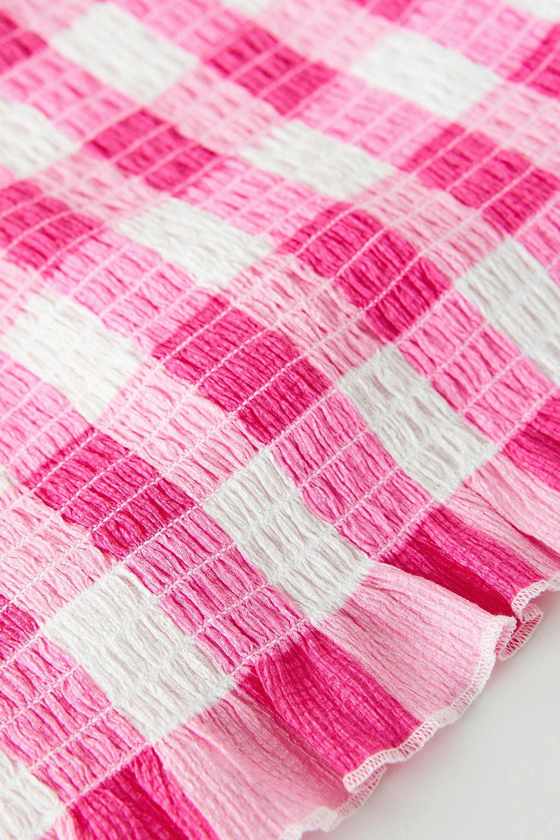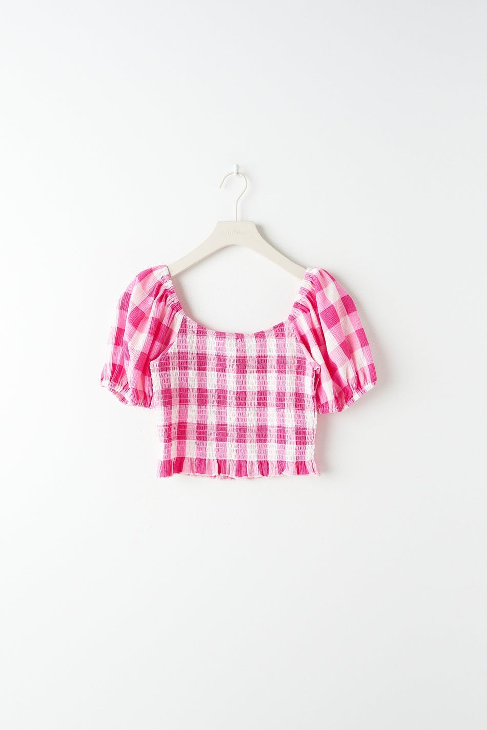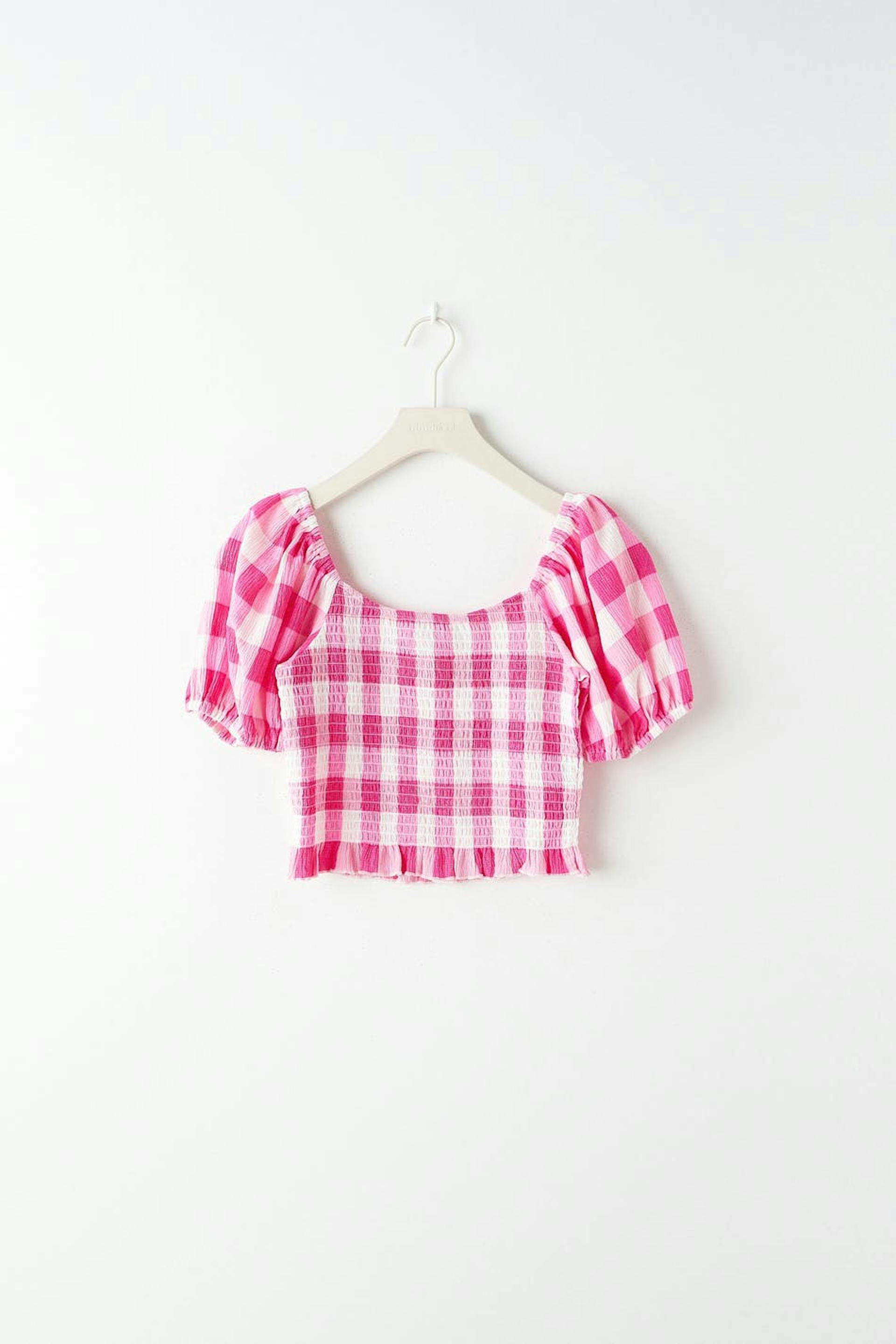 Gesmockt topje met een nauwsluitende pasvorm. Het topje is roze en heeft een afgesneden pasvorm. Het heeft korte pofmouwen.