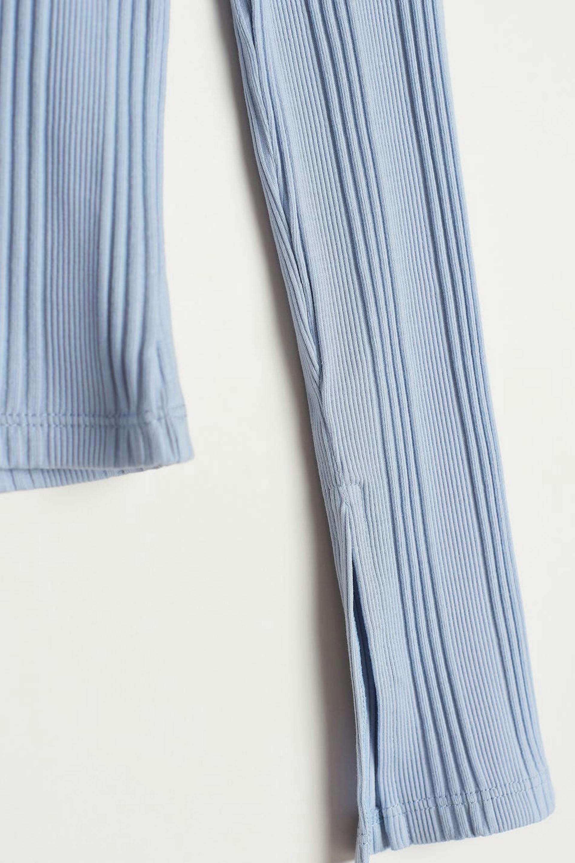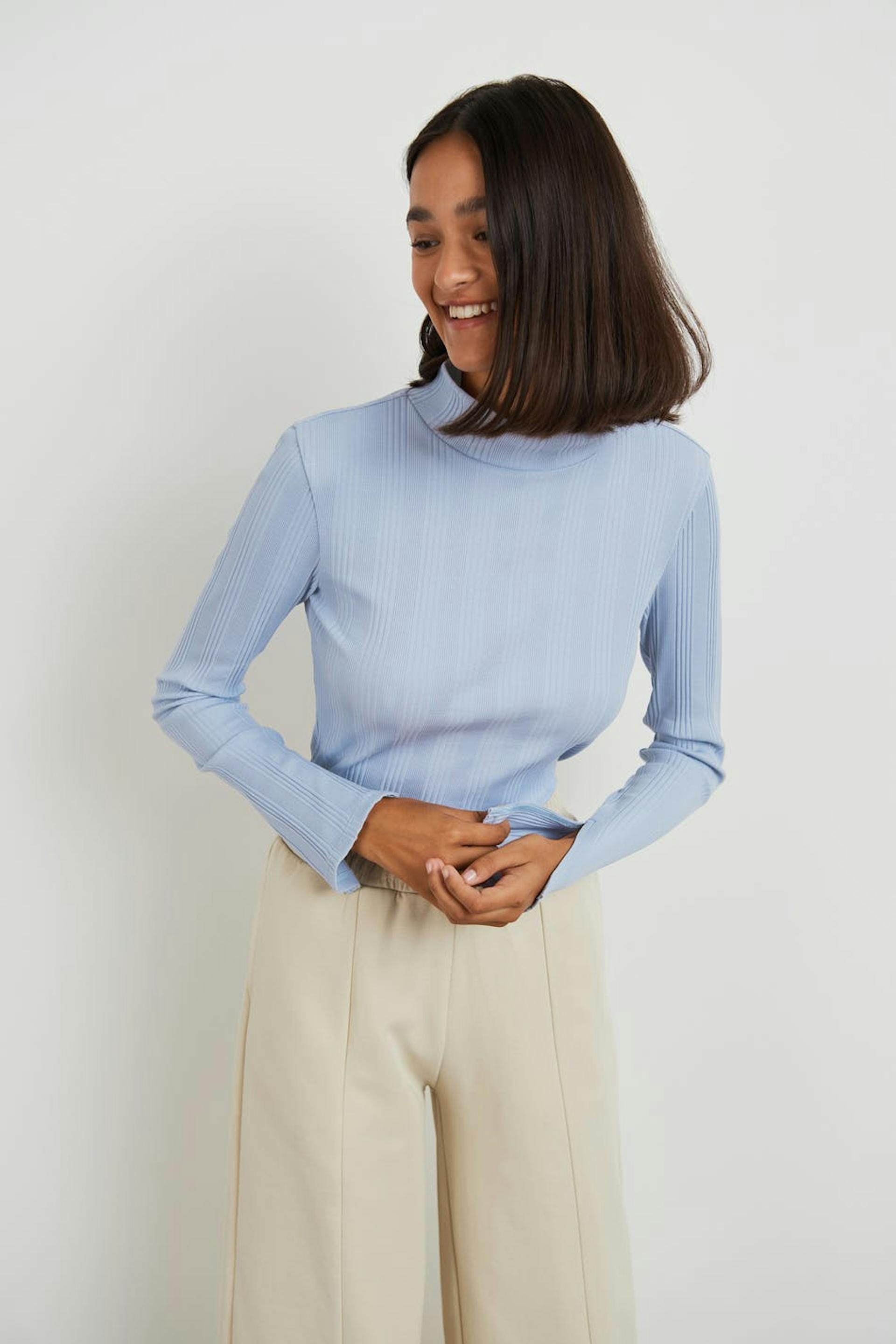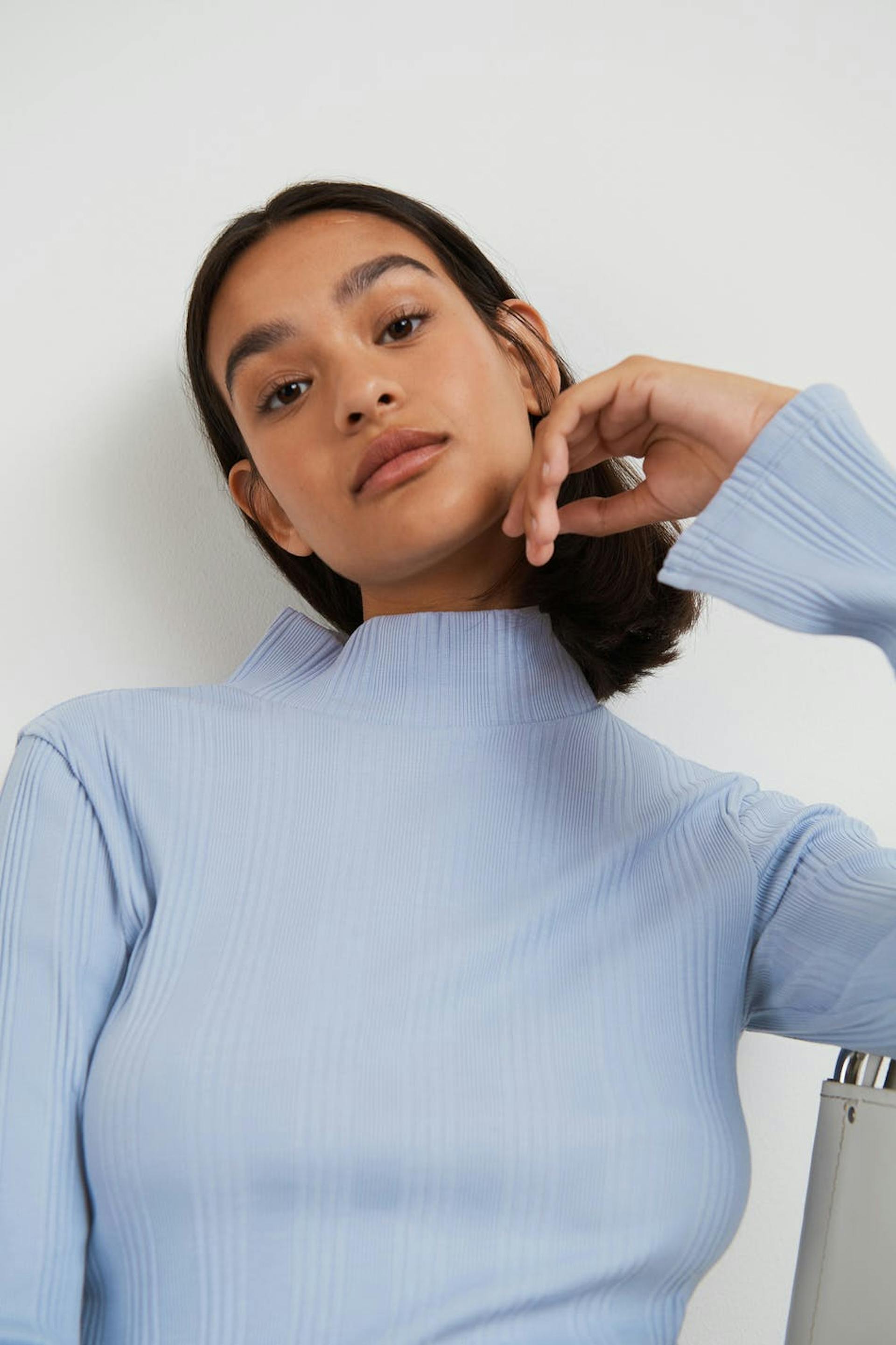 Geribbelde coltrui met een normale pasvorm. De sweater is blauw en heeft een coltrui. Het heeft lange mouwen met een detail met split aan de uiteinden van de mouwen.