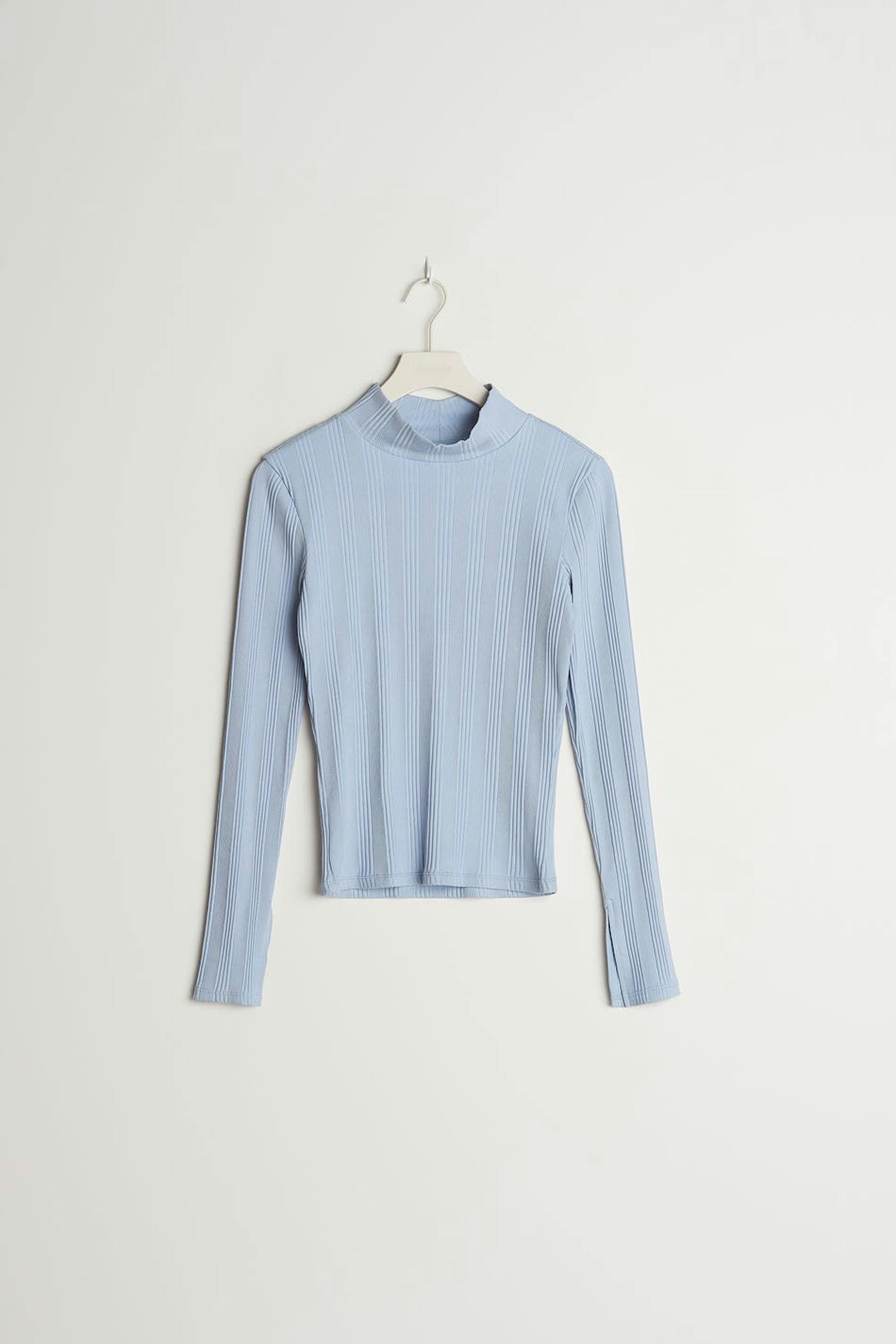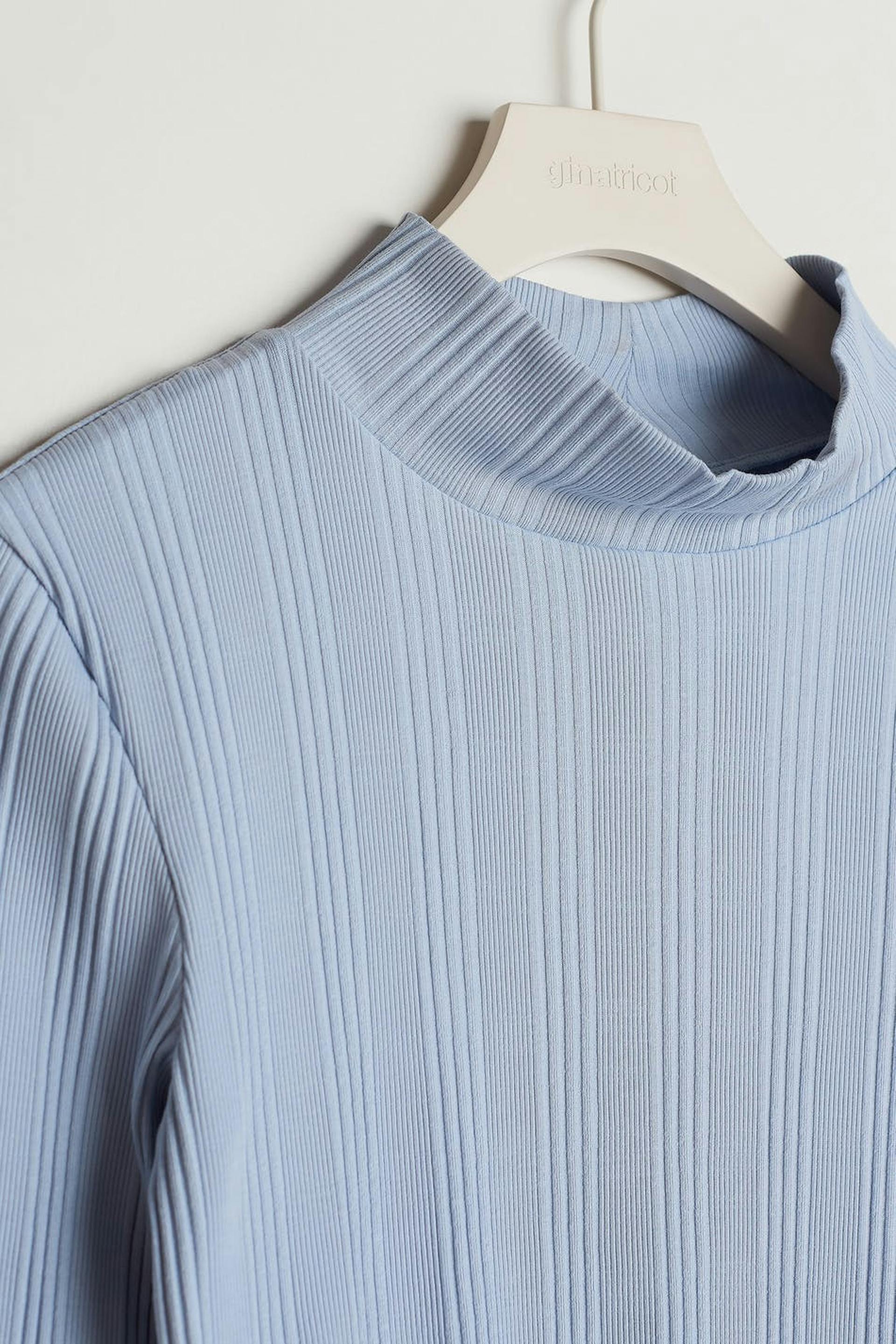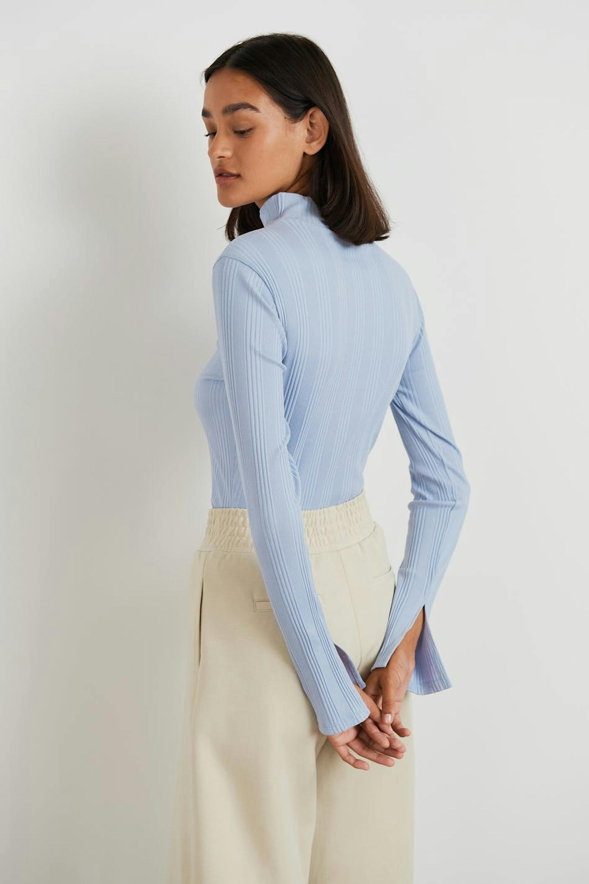 Geribbelde coltrui met een normale pasvorm. De sweater is blauw en heeft een coltrui. Het heeft lange mouwen met een detail met split aan de uiteinden van de mouwen.