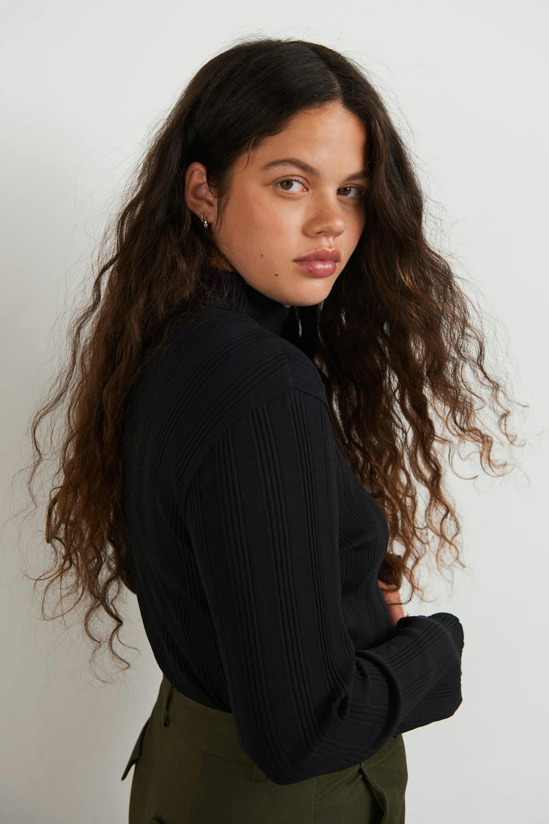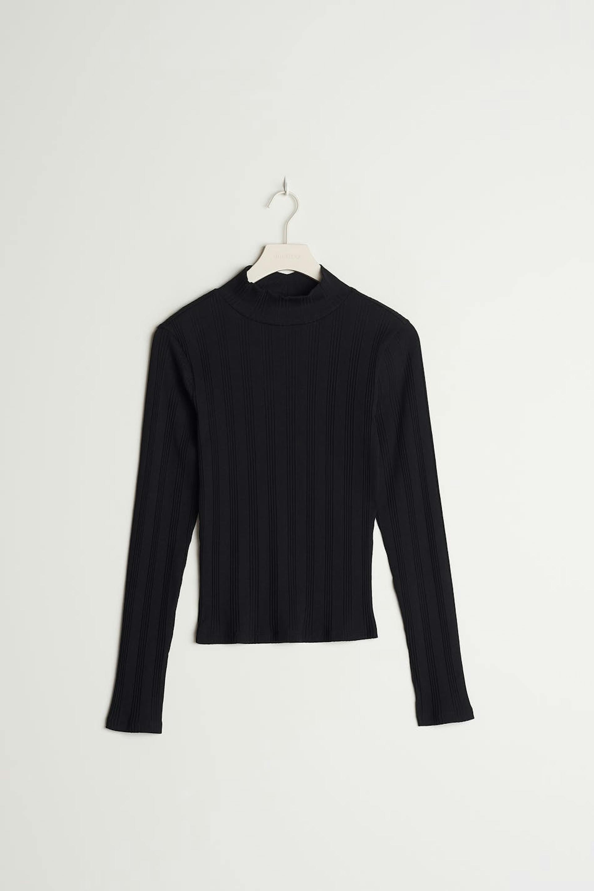 Geribbeld topje met een normale pasvorm. Het topje is zwart en heeft een coltrui. Het heeft lange mouwen met een detail met split aan de uiteinden van de mouwen.