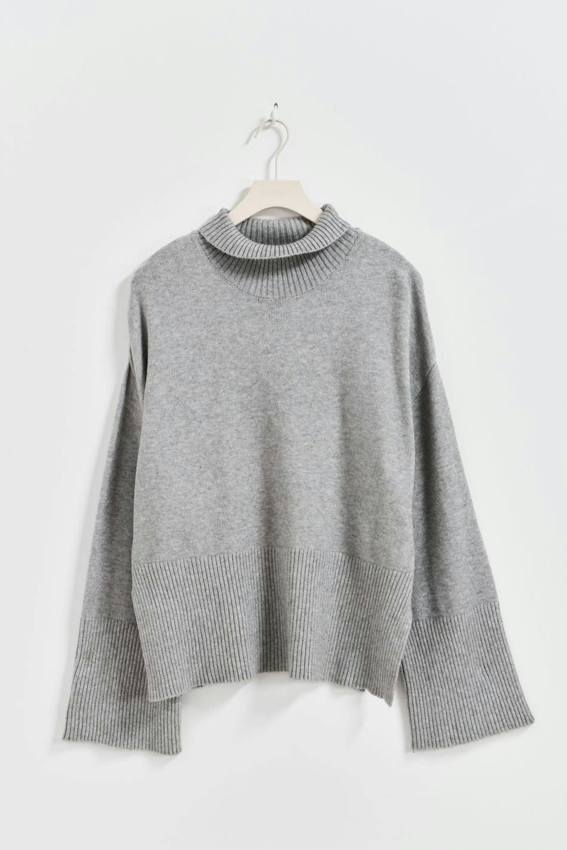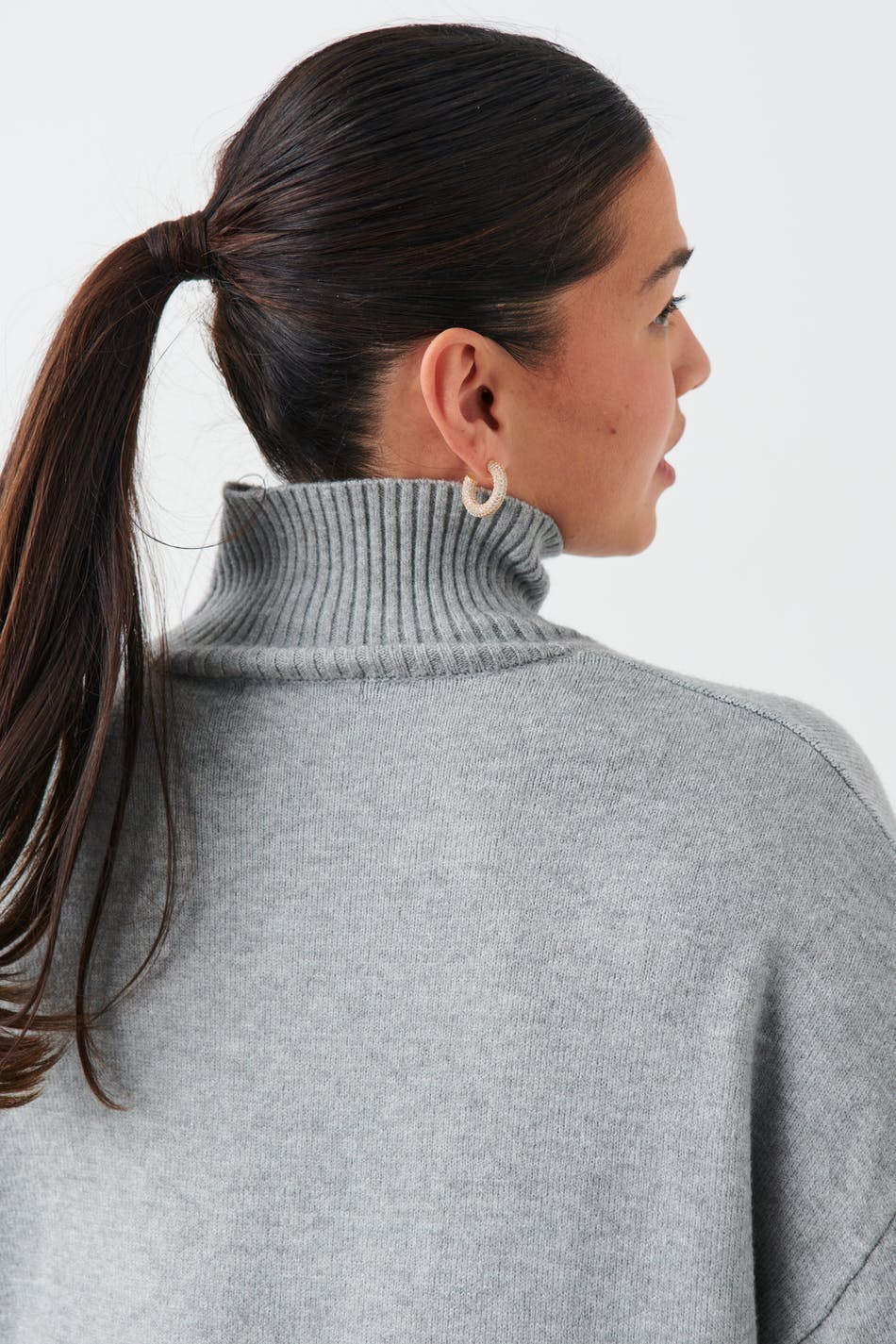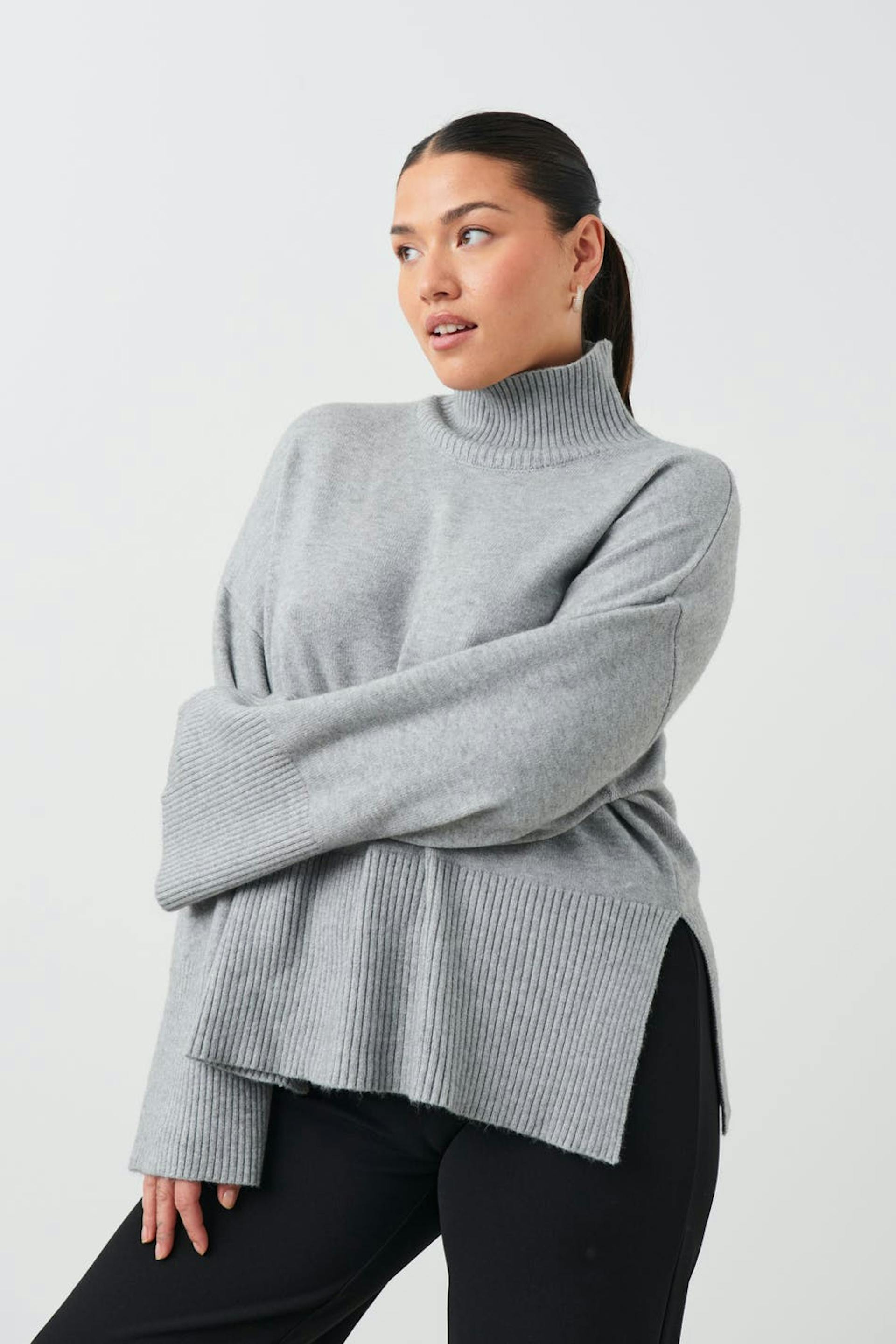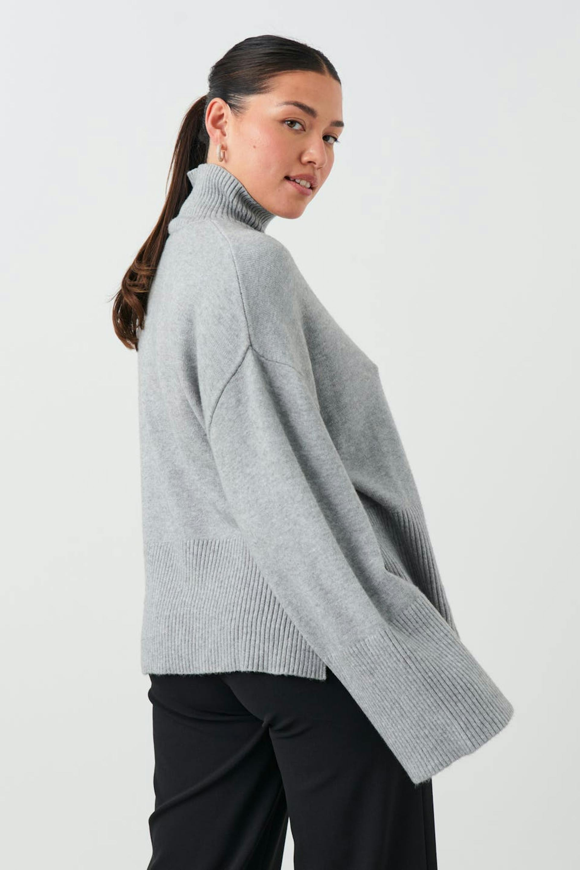 Gebreide coltrui met boxy pasvorm. De sweater is grijs en heeft zachte kwaliteit. Het heeft hoge hals, spleet in de zijden en hoog geribd gebreid materiaal aan de mouwuiteinden en aan de onderkant.