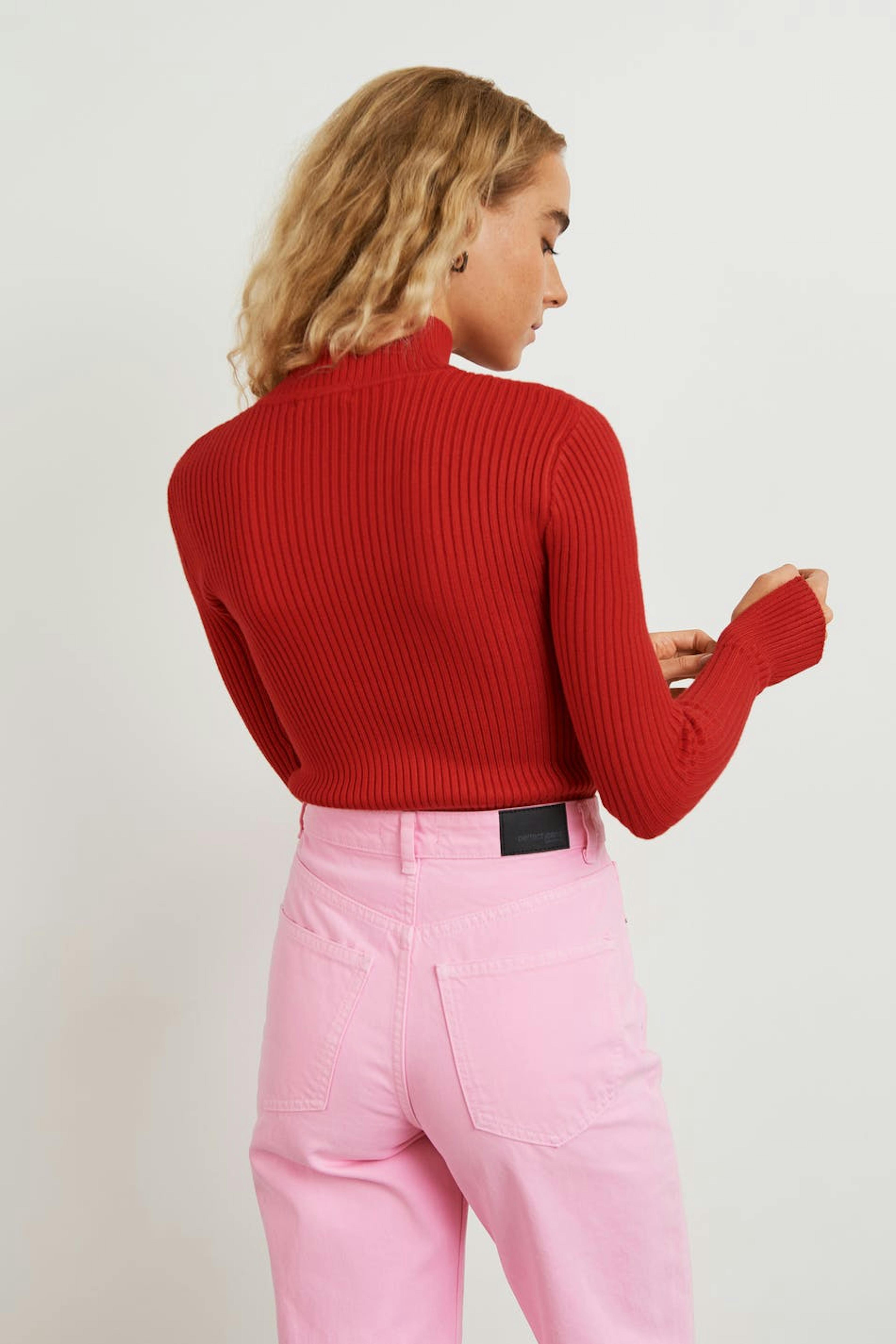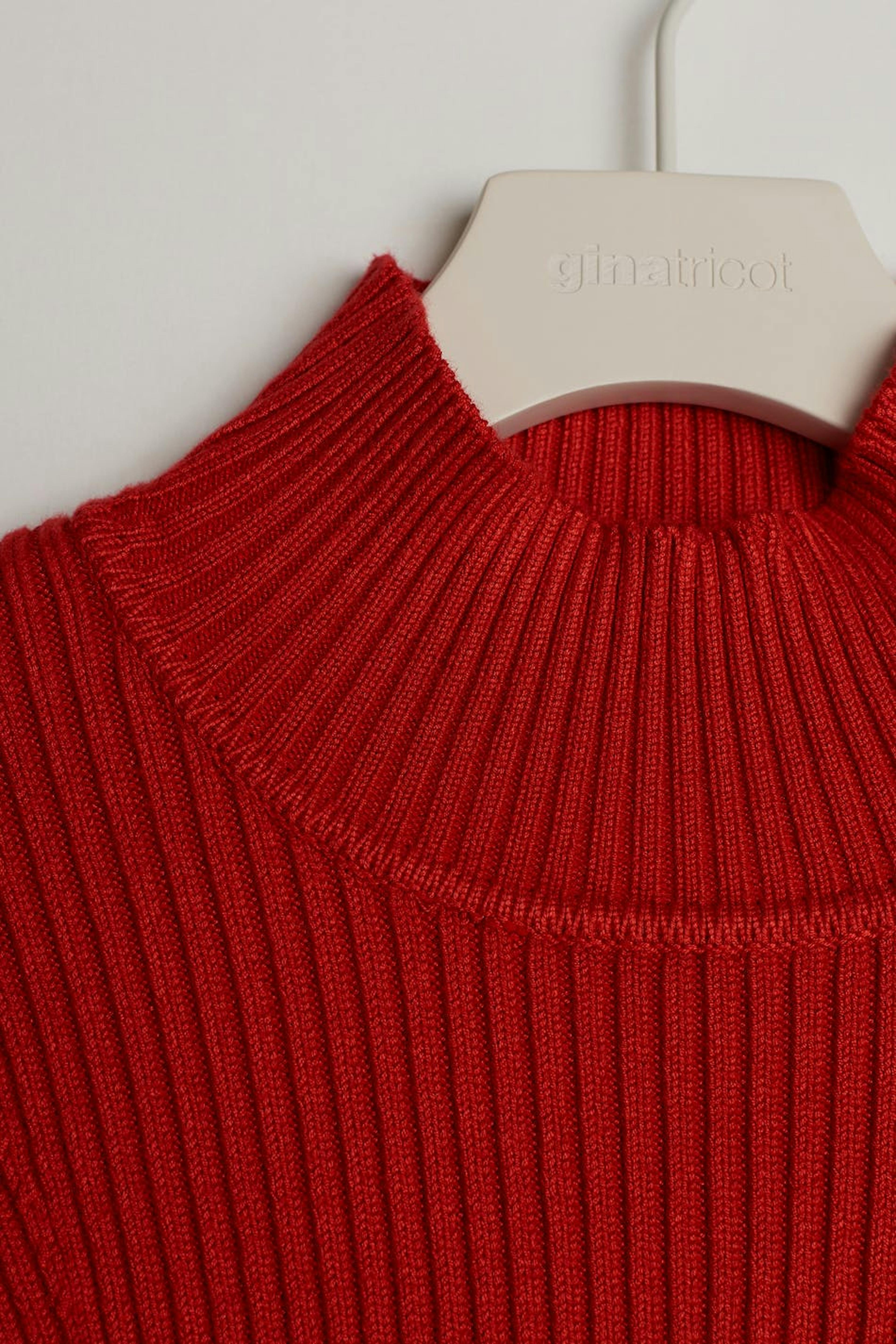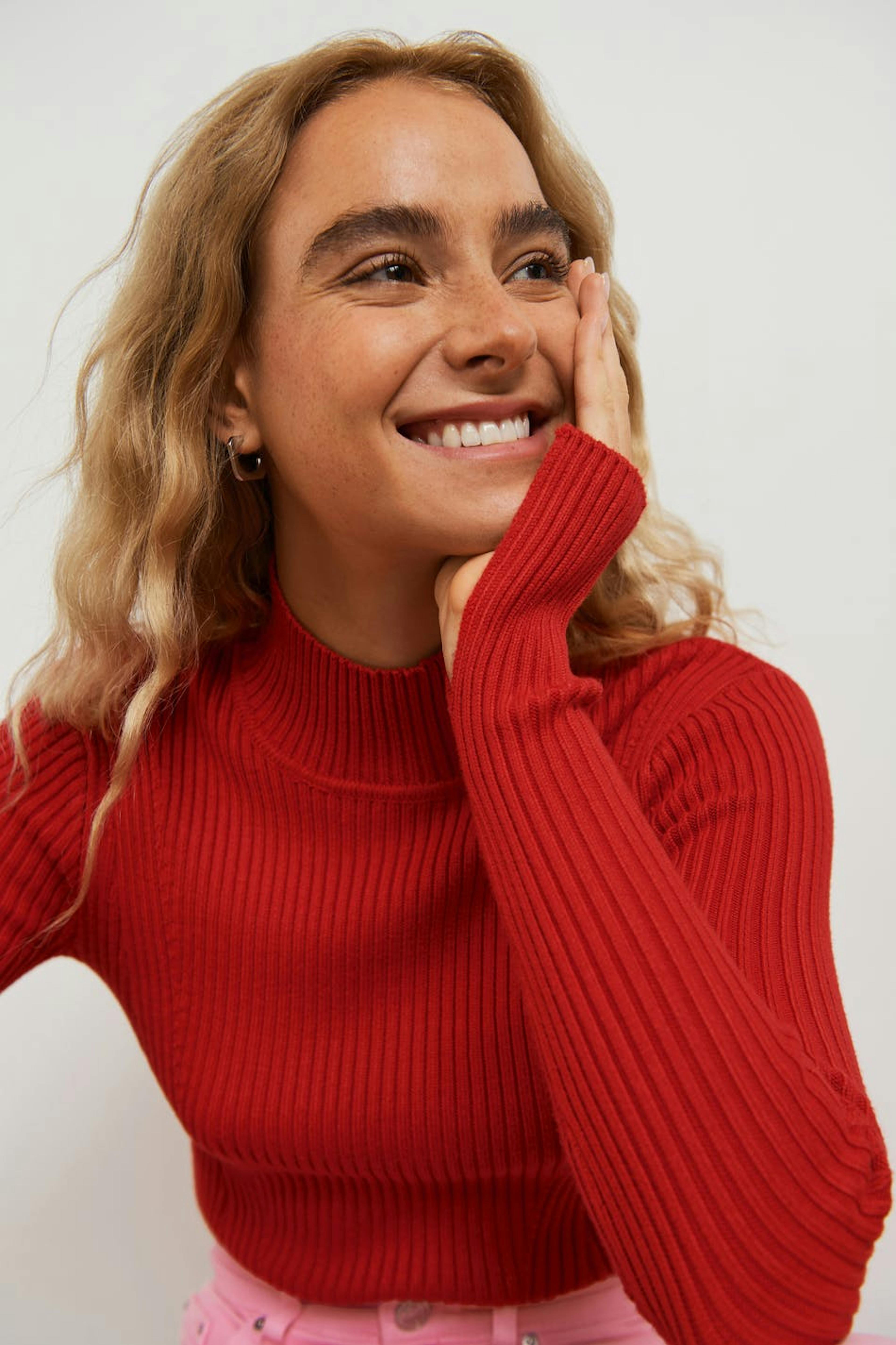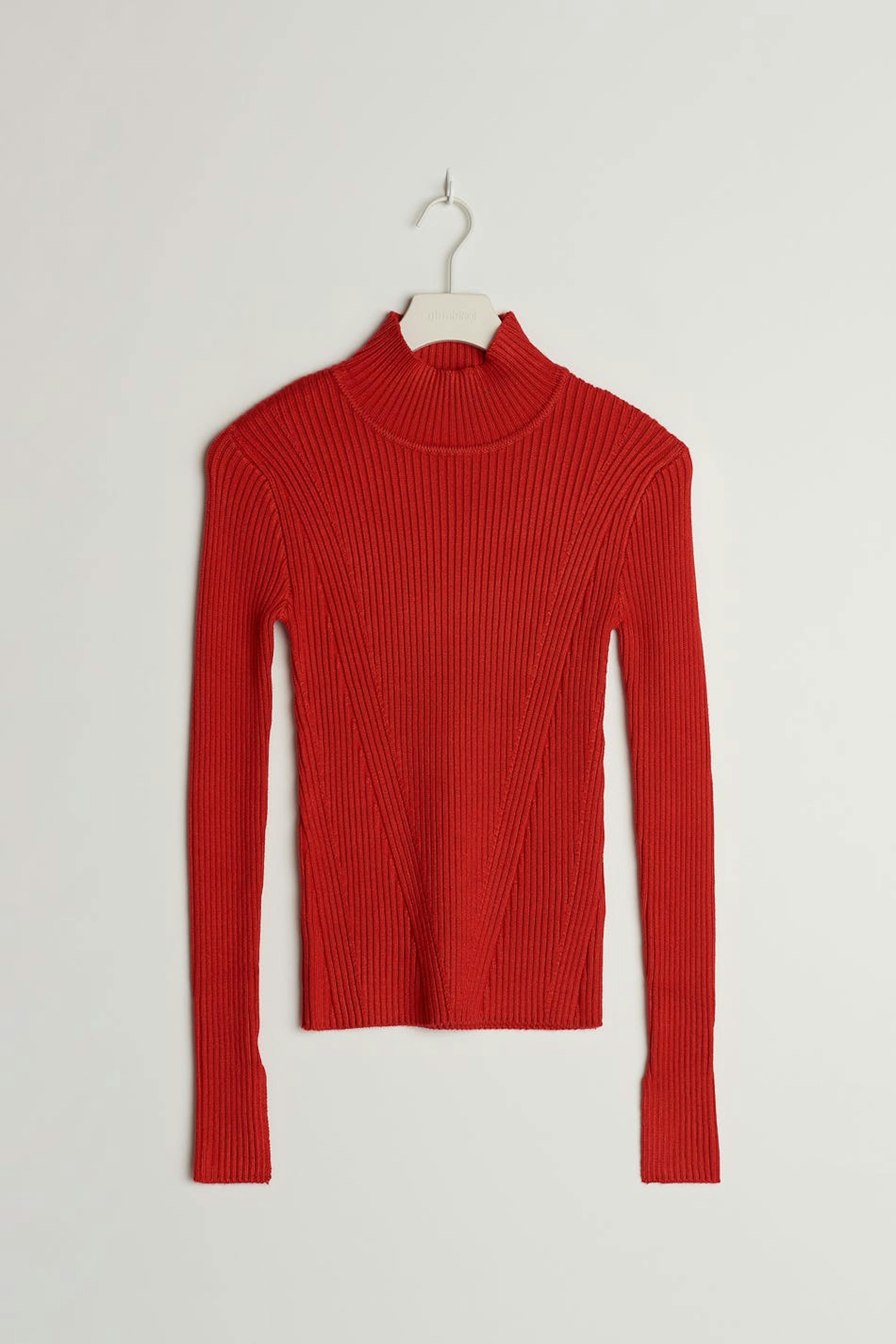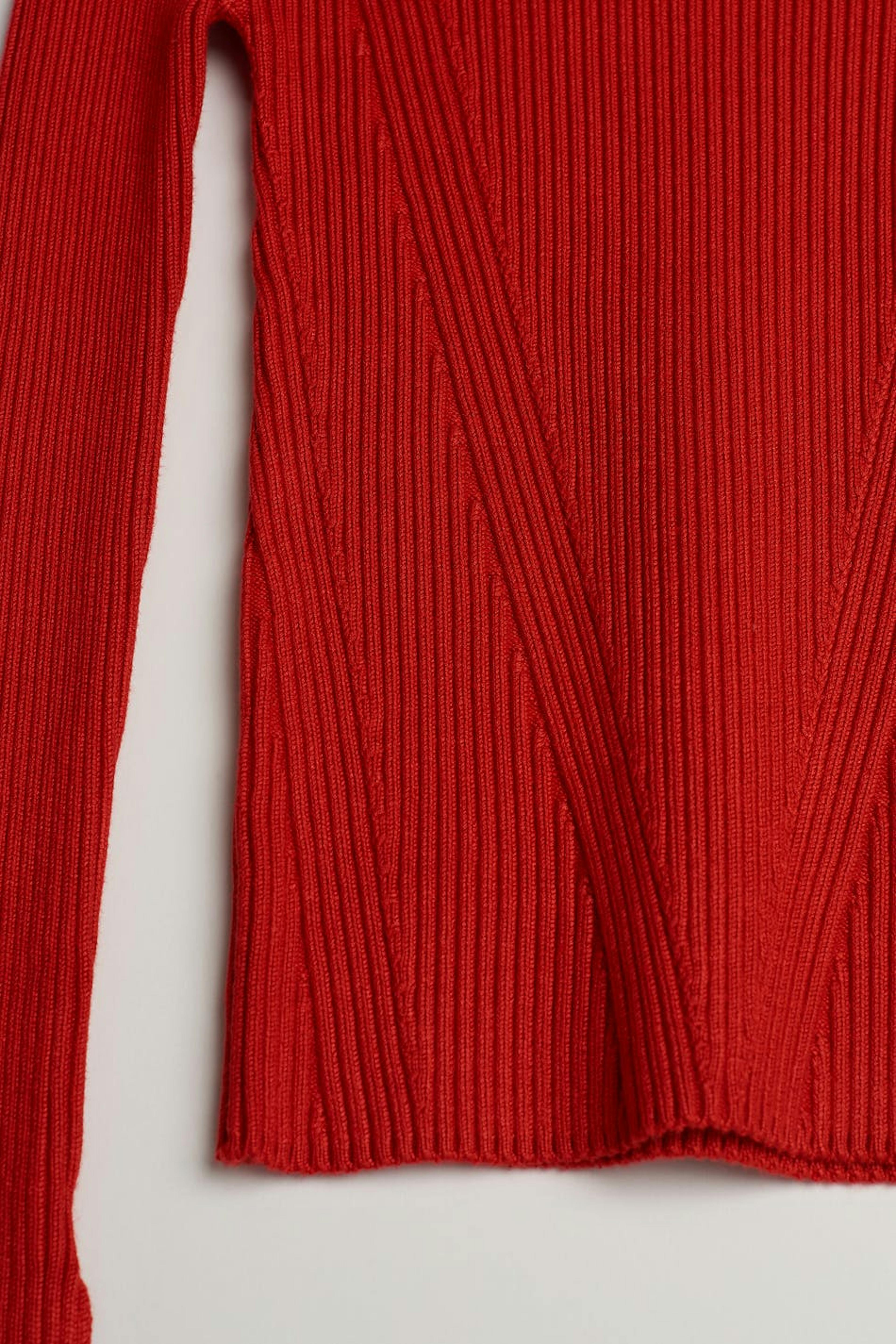 Gebreide sweater met een nauwsluitende pasvorm. De sweater is rood en heeft lange mouwen. Het heeft een coltrui en een spleet aan de uiteinden van de mouwen.