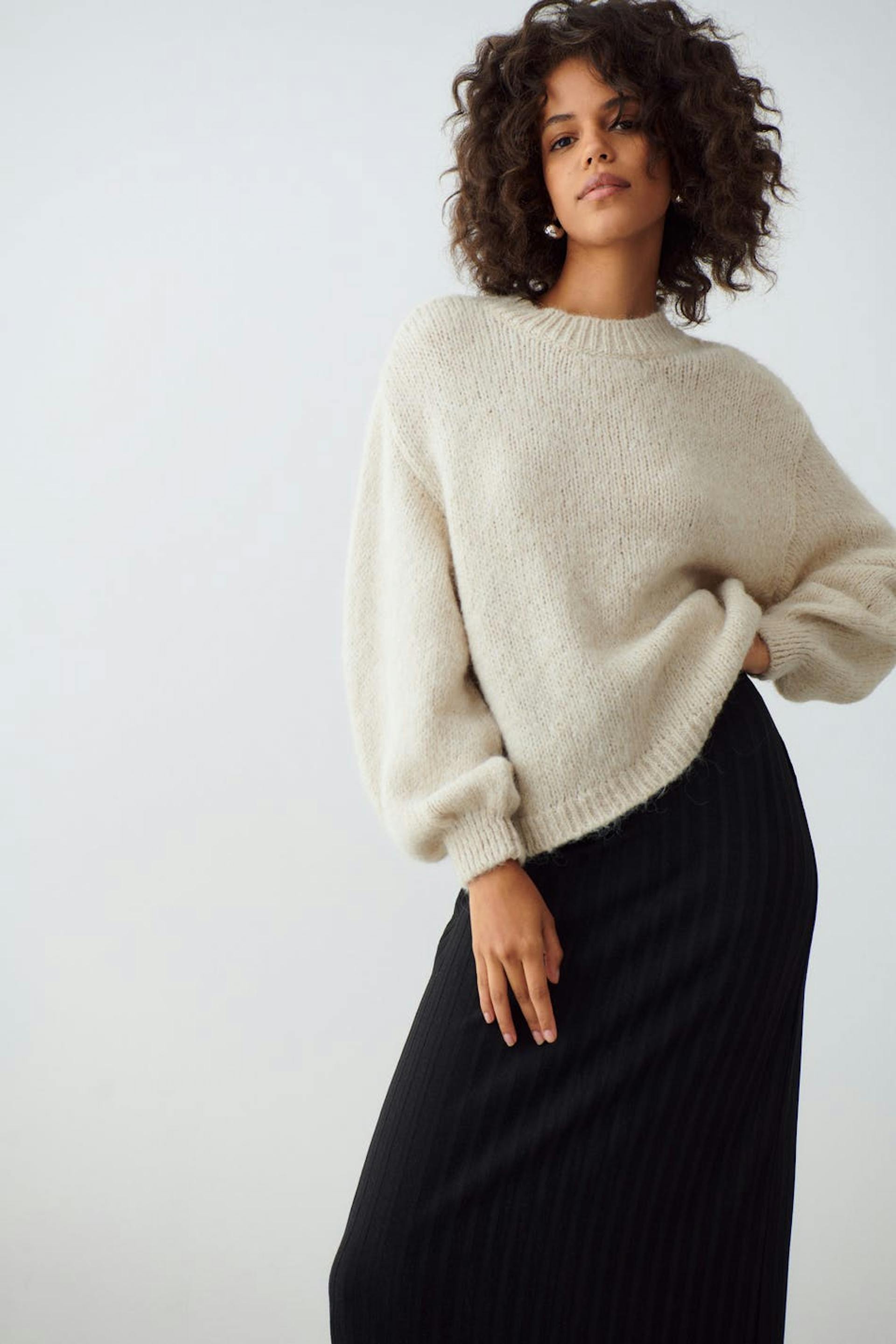 Gebreide trui met ruimvallende stijl. De trui is beige en heeft ronde halslijn.