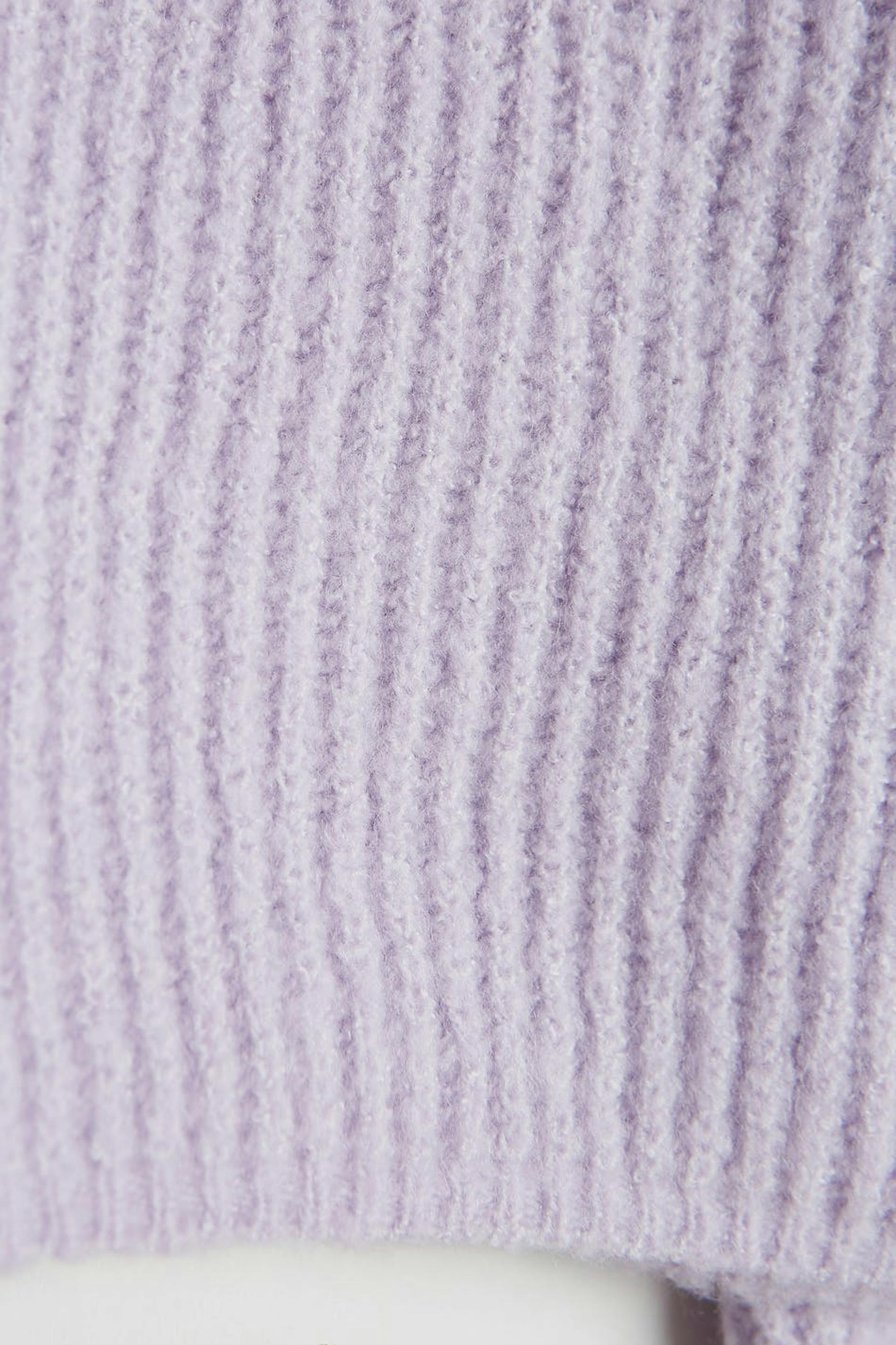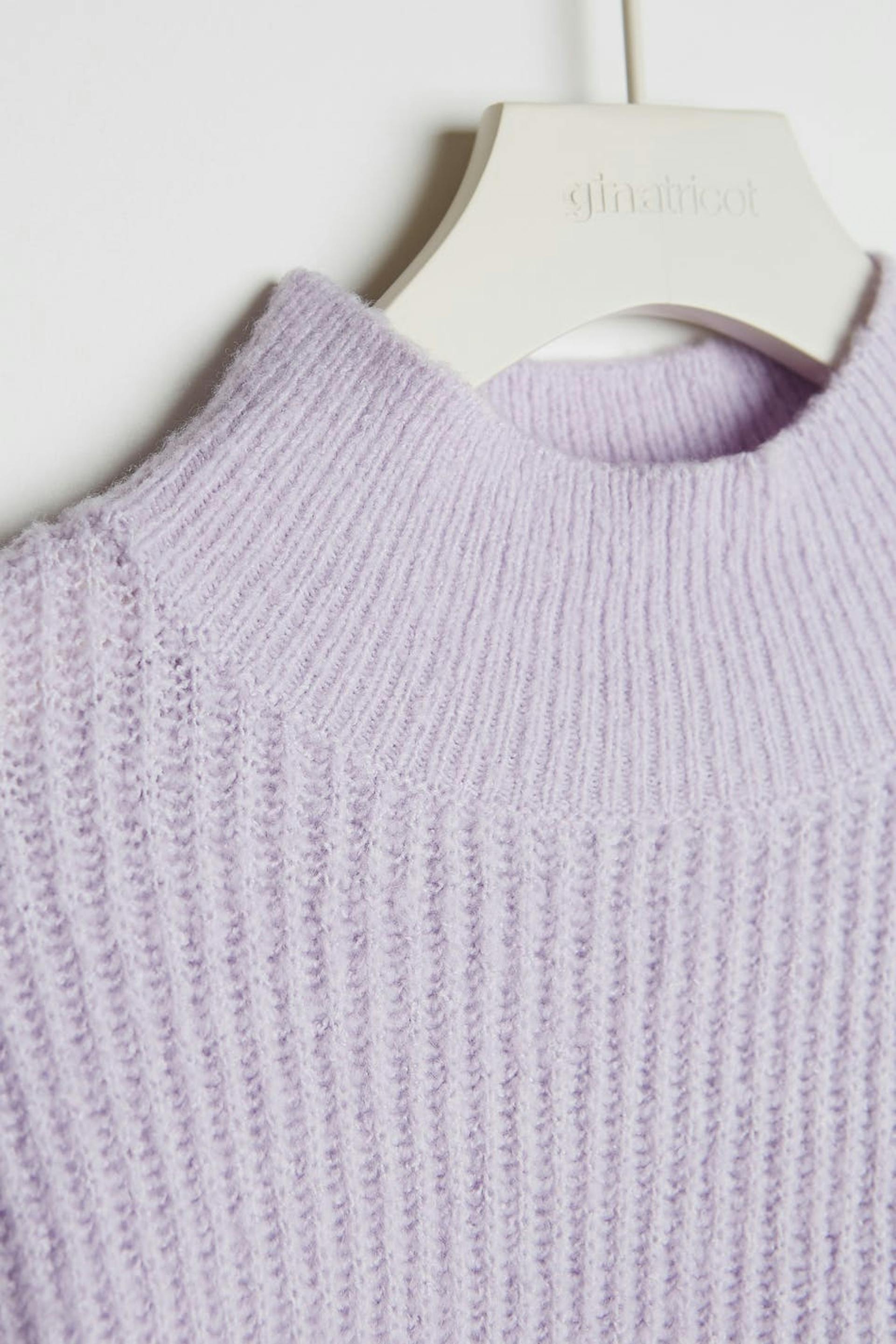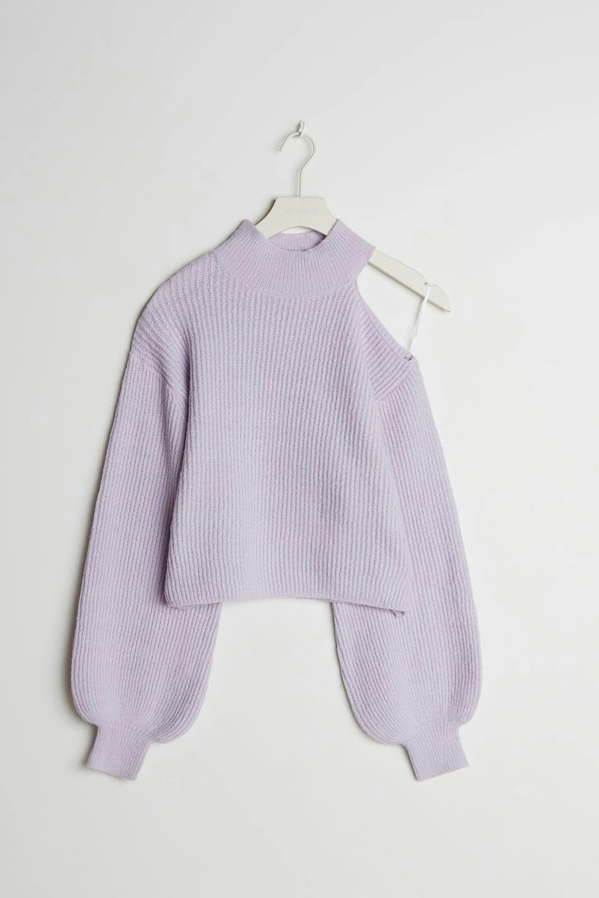 Gebreide sweater met ruime mouwen. De sweater is paars en geribbeld en heeft een onbedekte schouder. Het heeft een hoge halslijn.