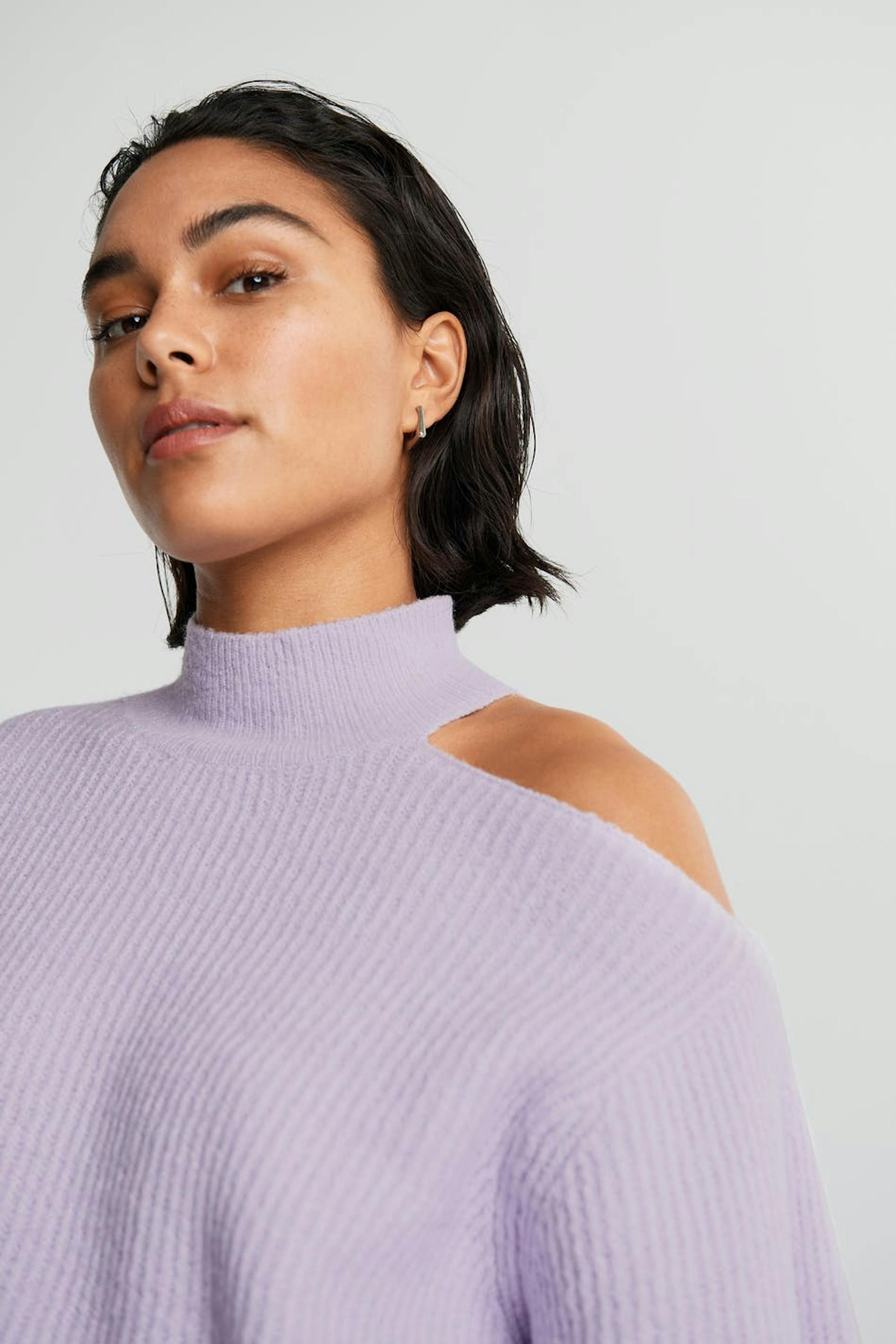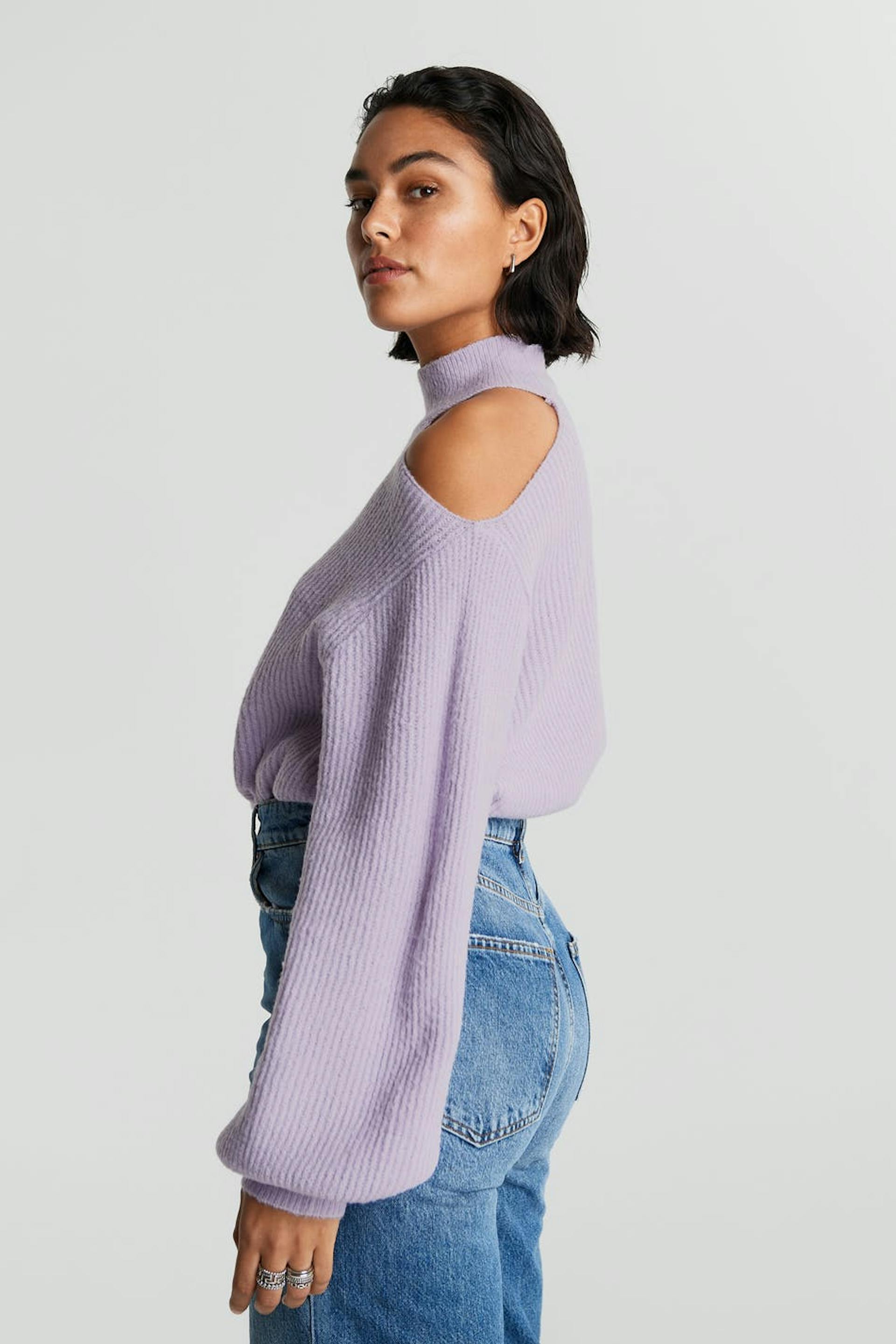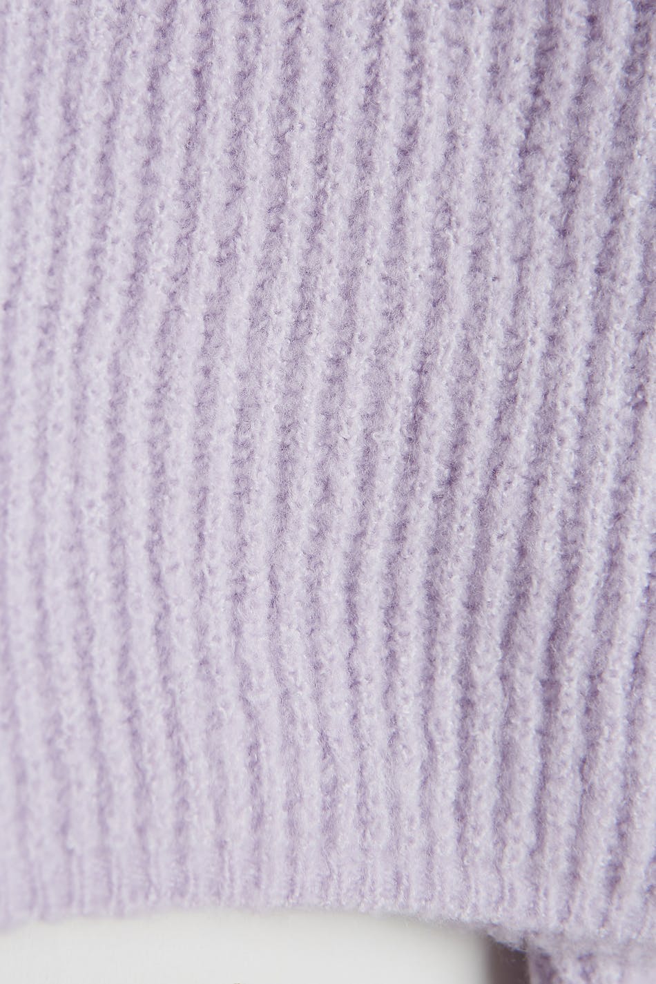 Gebreide sweater met ruime mouwen. De sweater is paars en geribbeld en heeft een onbedekte schouder. Het heeft een hoge halslijn.