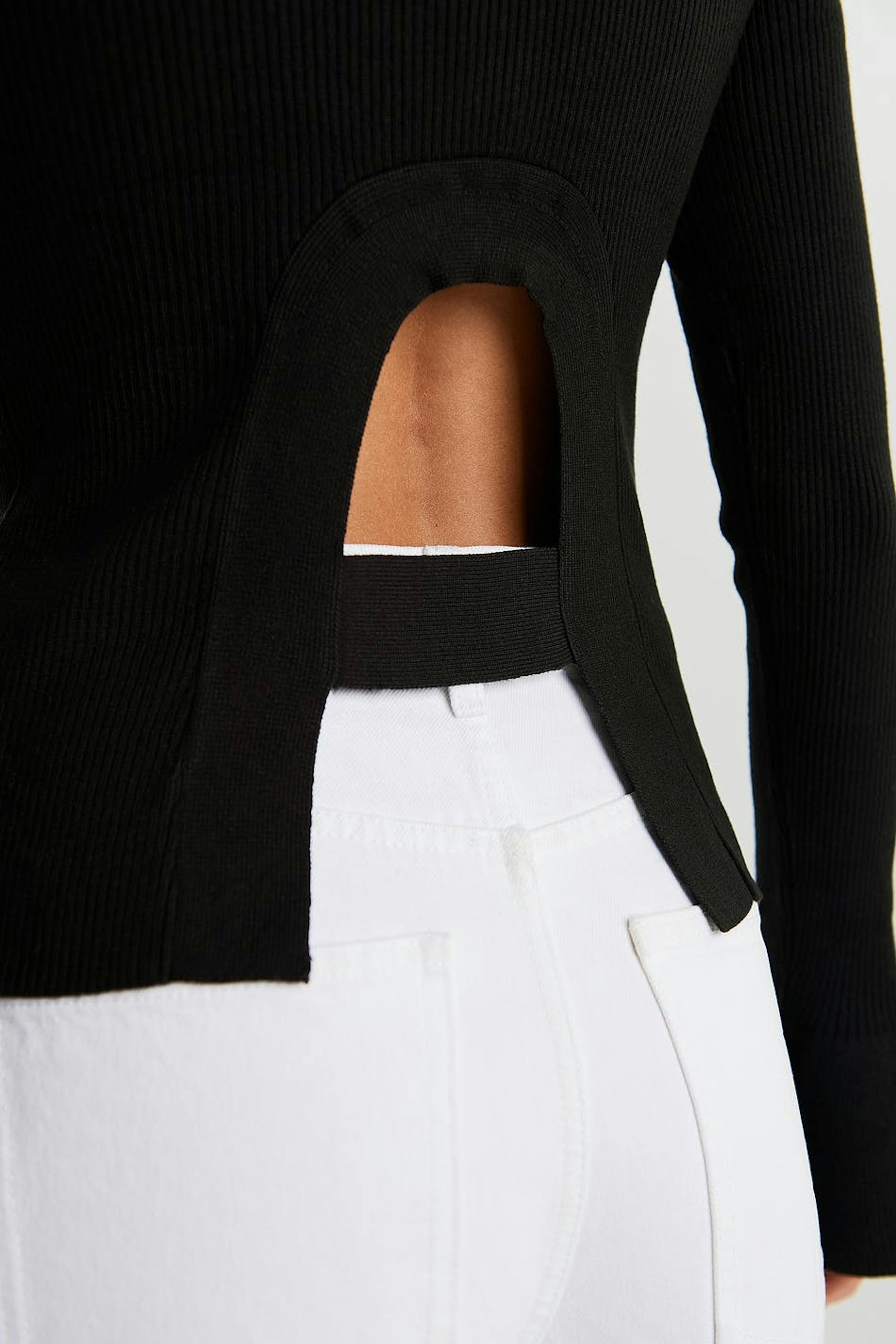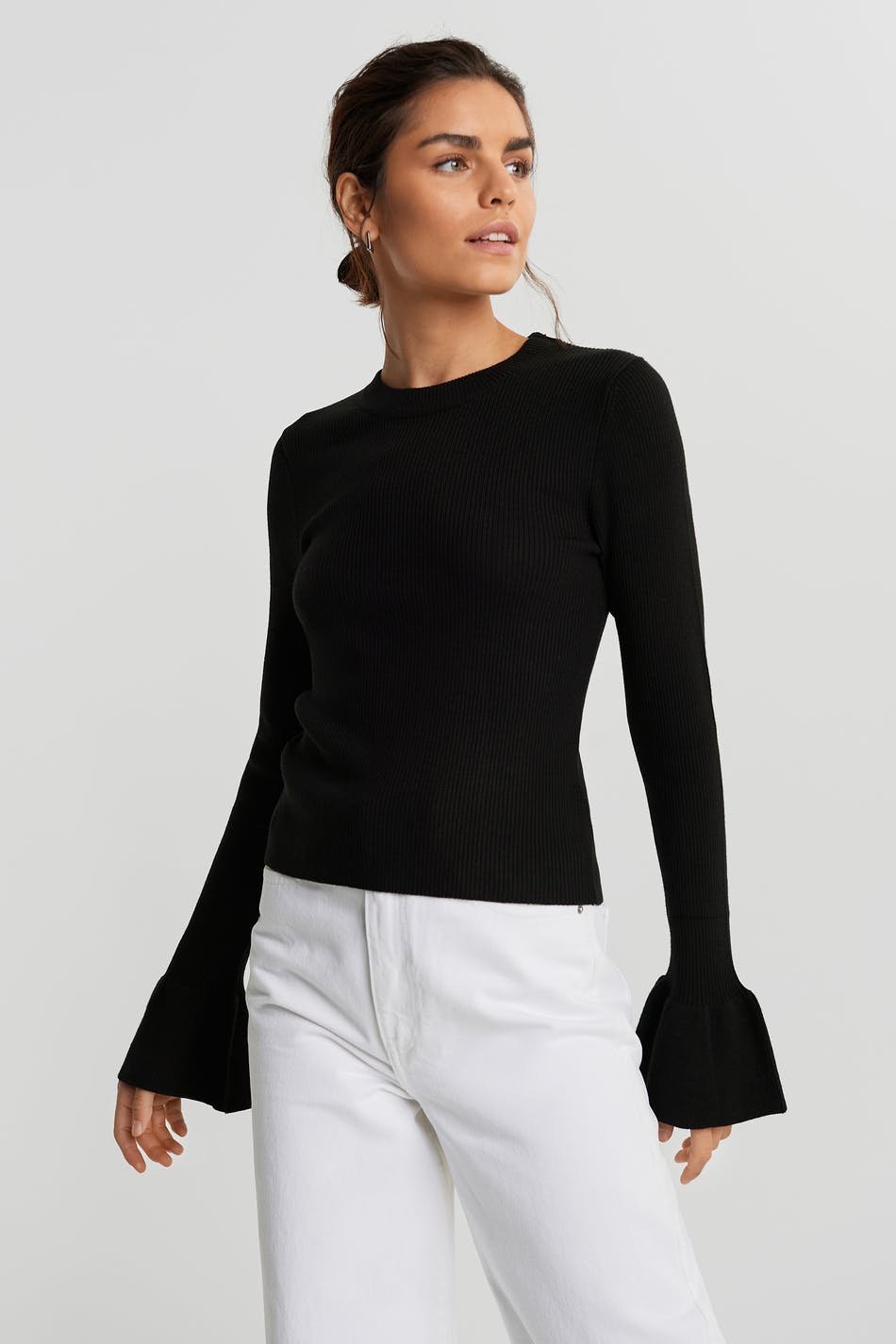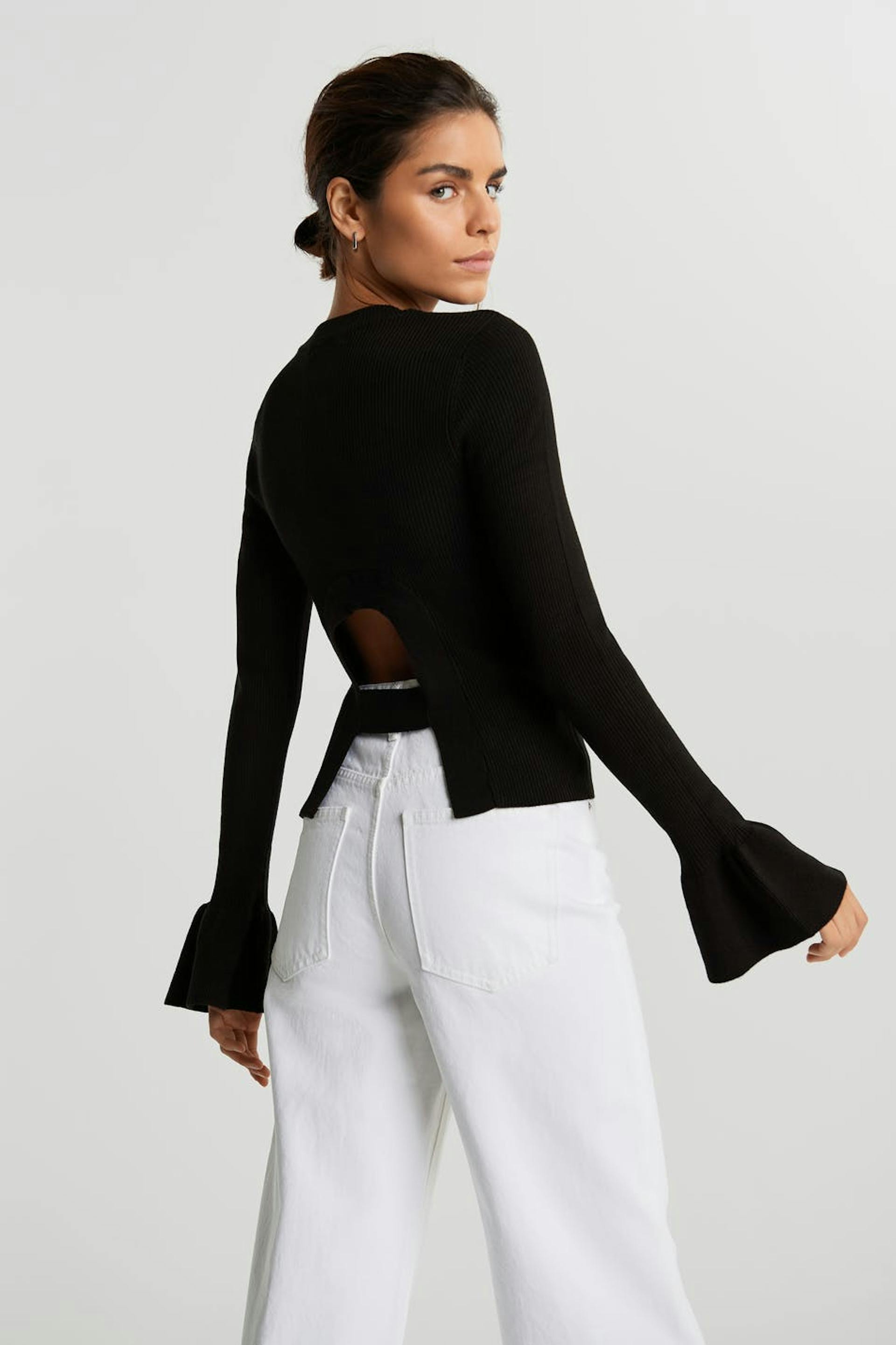 Tight knitted rib top with open back detail and frills at sleeve ends. Supplier: J.L Sweaters Ltd. Production unit: J.L Sweaters Ltd