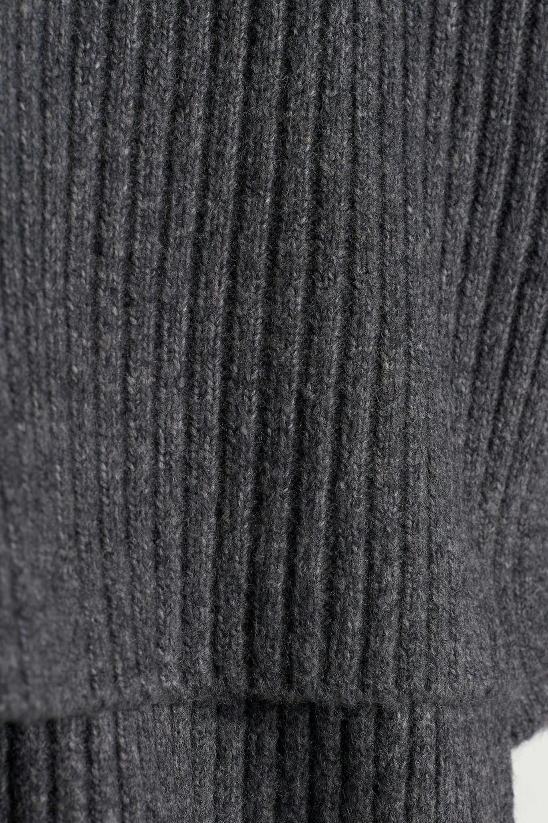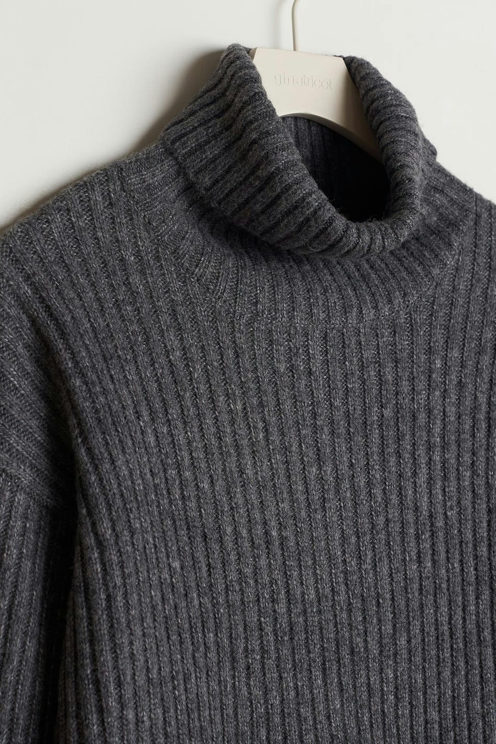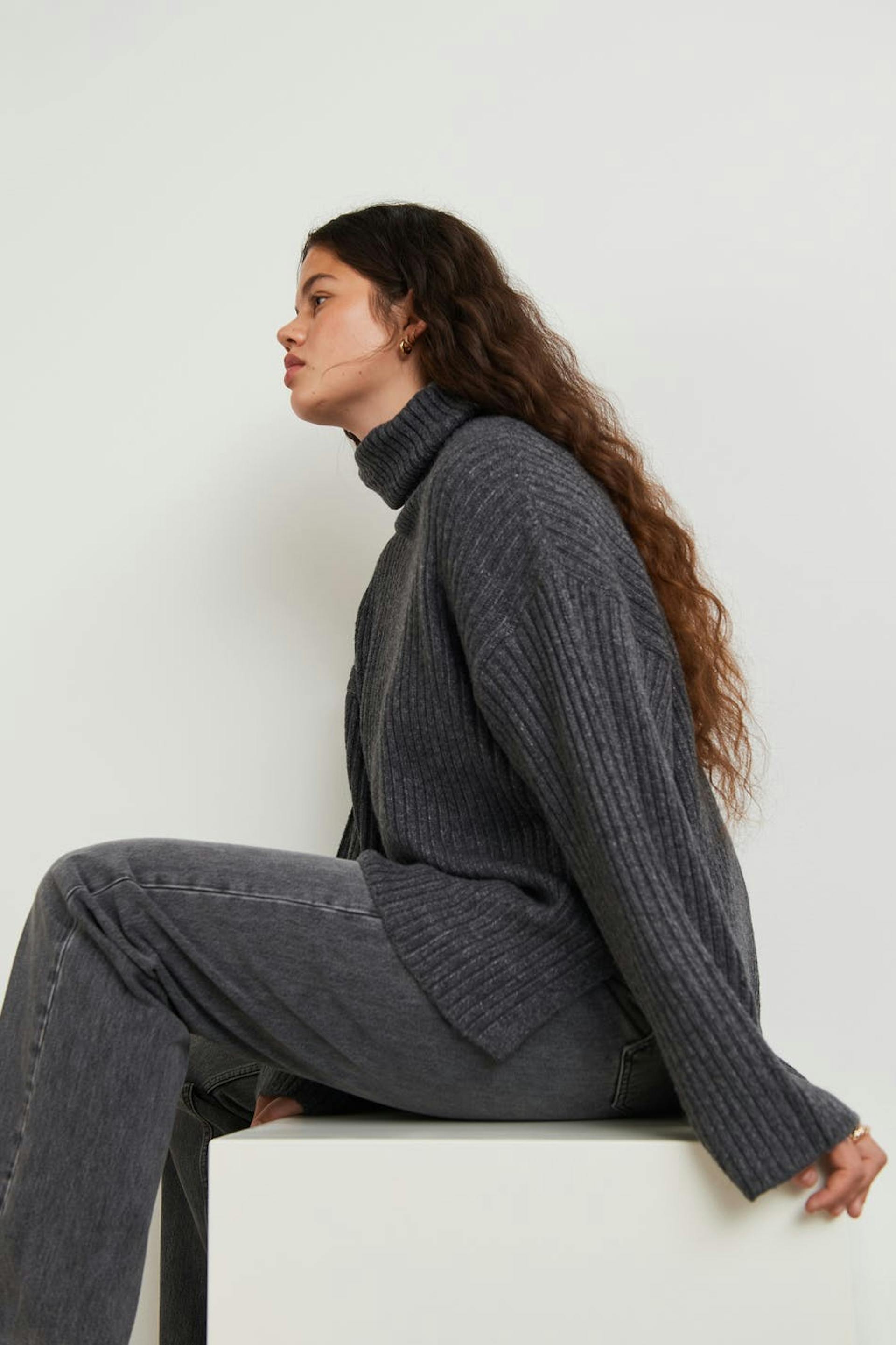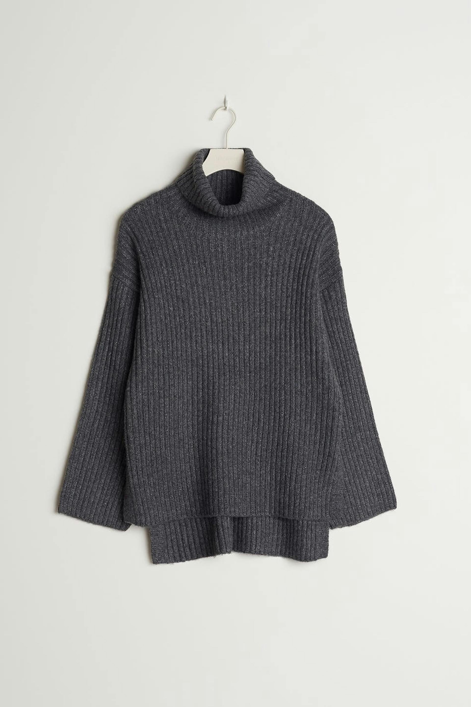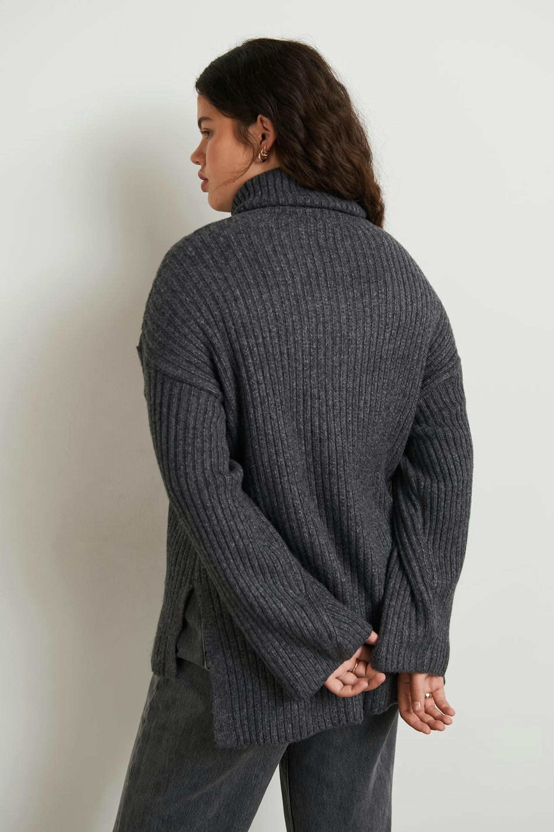 Gebreide coltrui met een normale pasvorm. De sweater is grijs, met lange mouwen en lichtjes langer aan de achterkant. Het heeft een coltrui, ruime mouwen en een spleet aan de zijkanten.