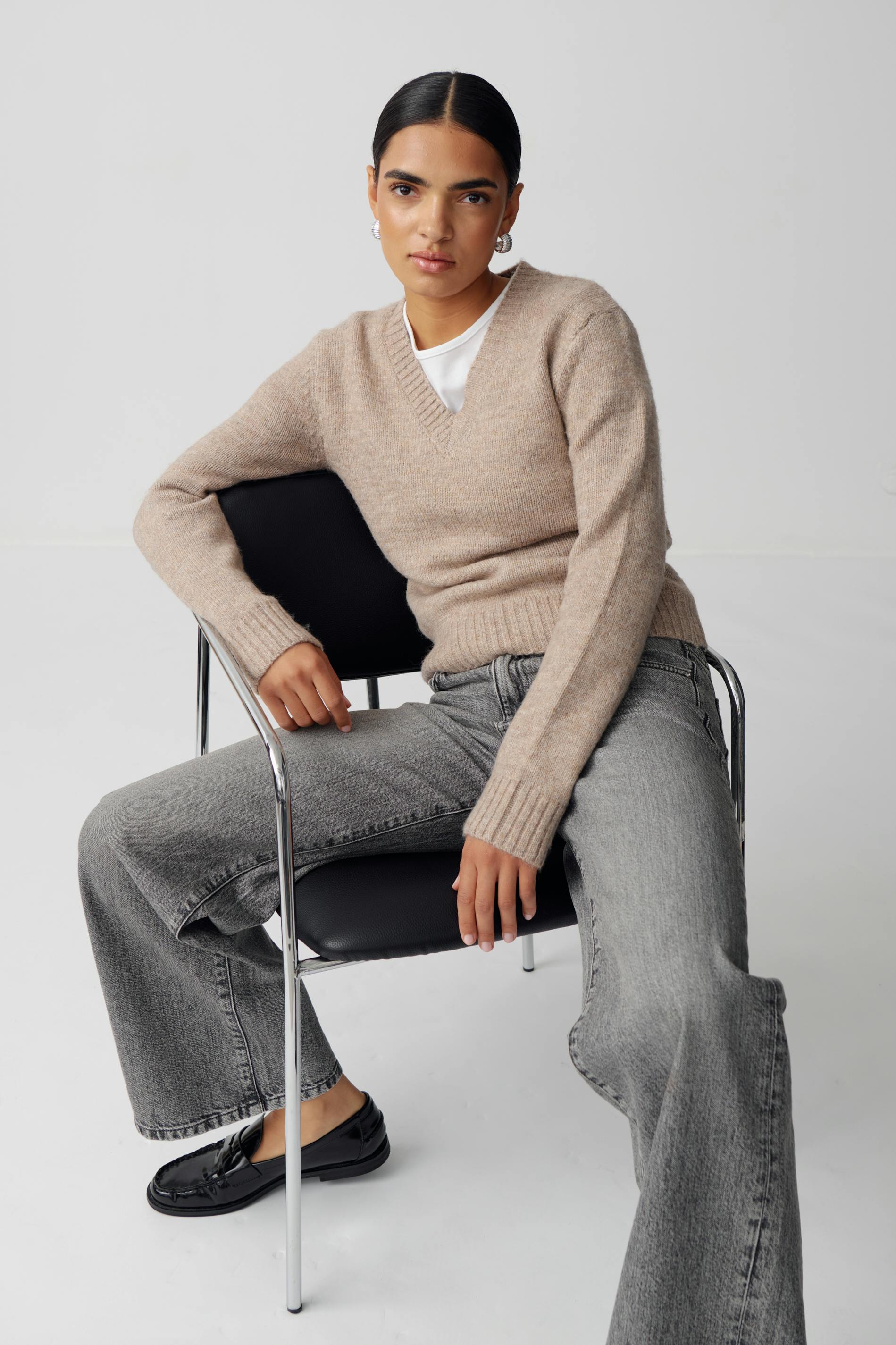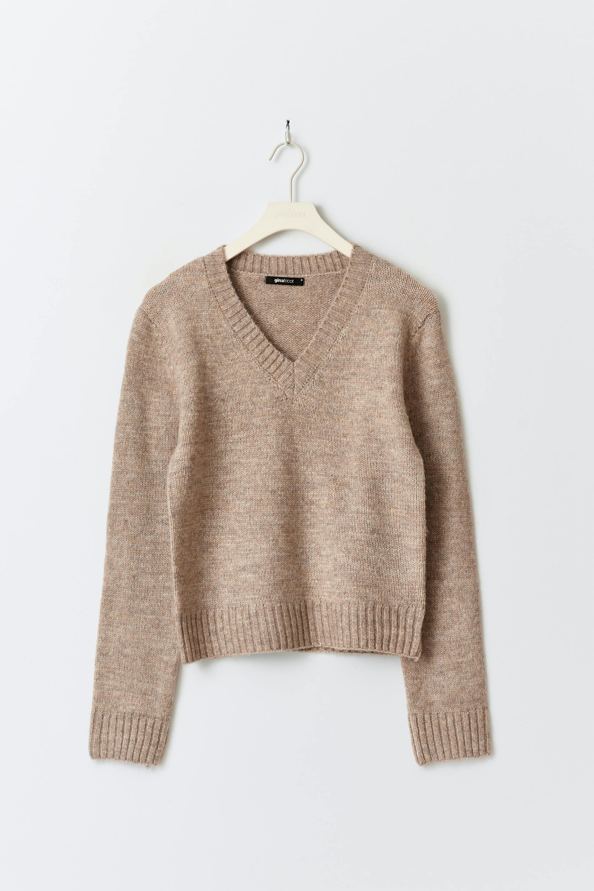 Gebreide trui met v-hals. De trui is beige en heeft lange mouw. Het heeft normale pasvorm en geribd gebreid materiaal aan de mouwuiteinden en aan de onderkant.