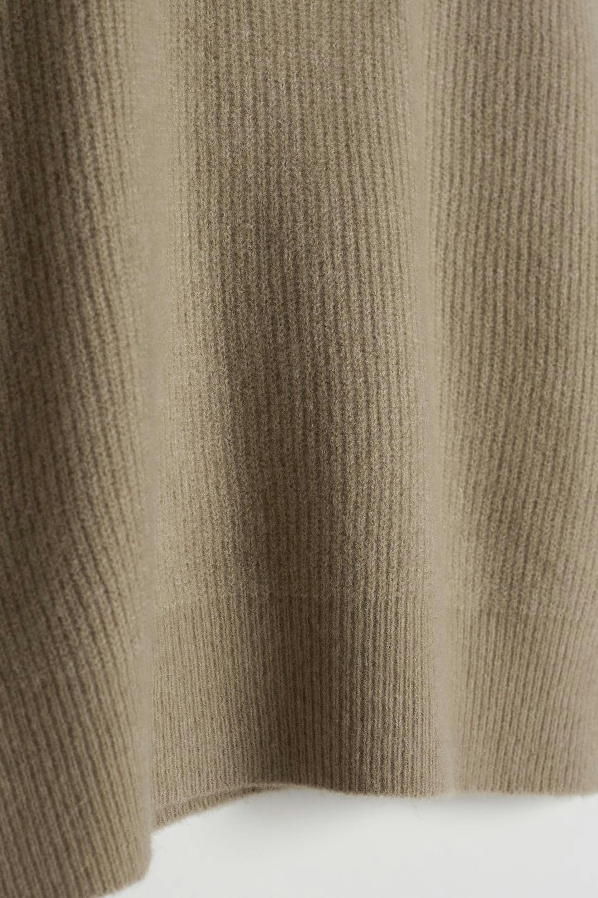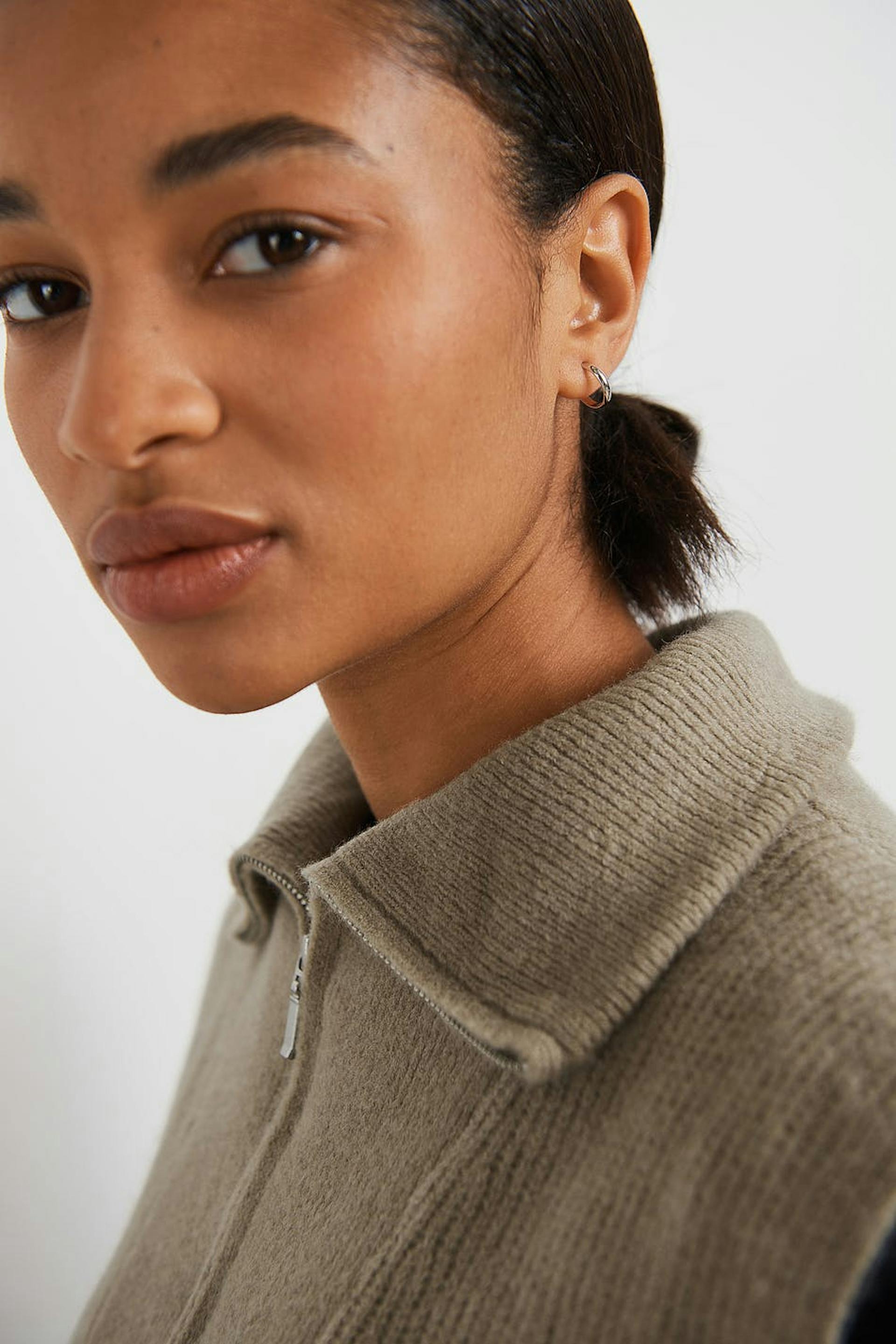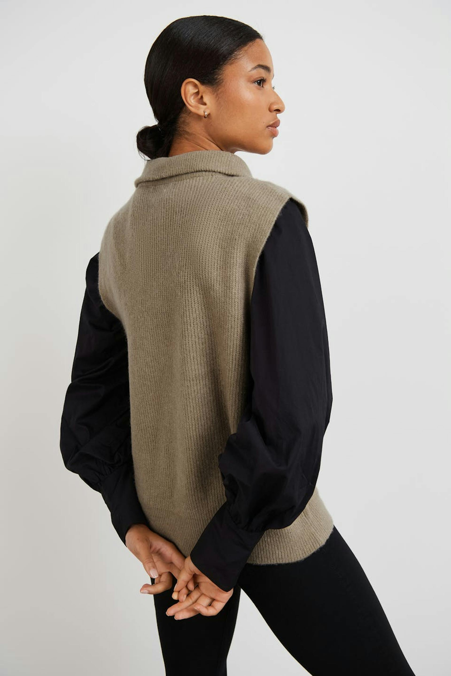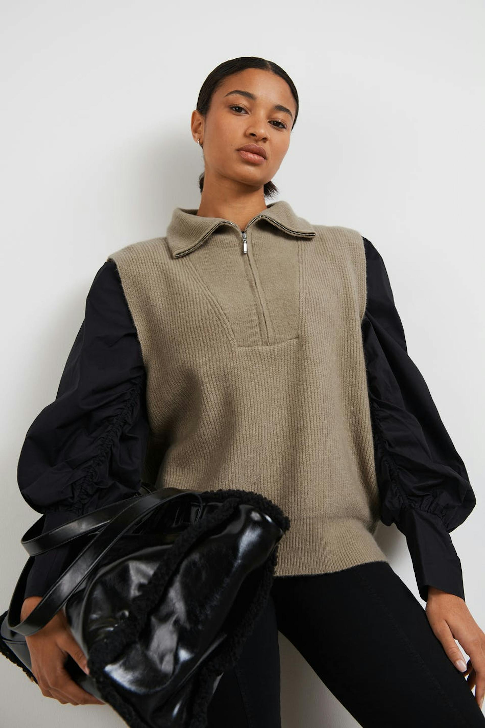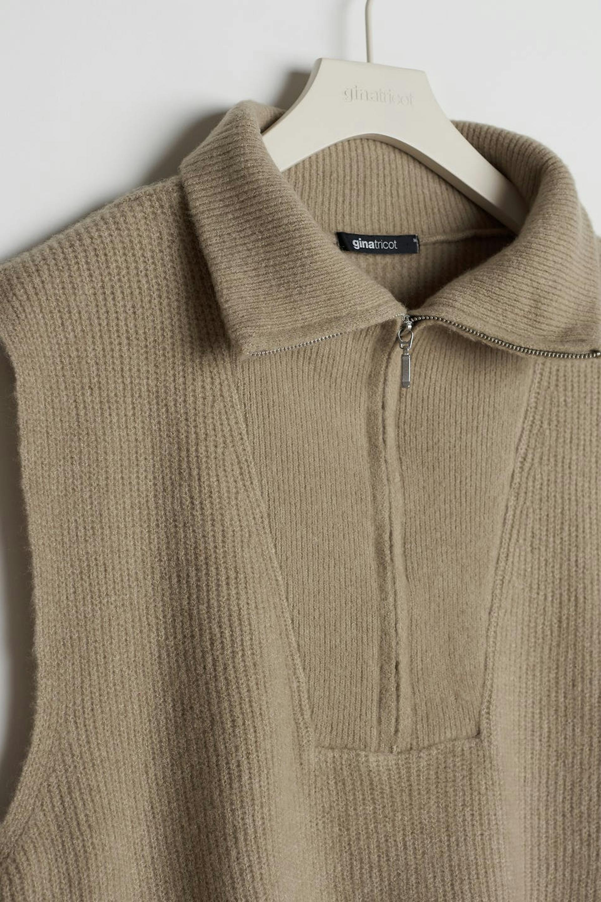Gebreid vest met een normale pasvorm. Het vest is beige en mouwloos en heeft een hoge hals. Het heeft een rits op halve hoogte aan de bovenkant.