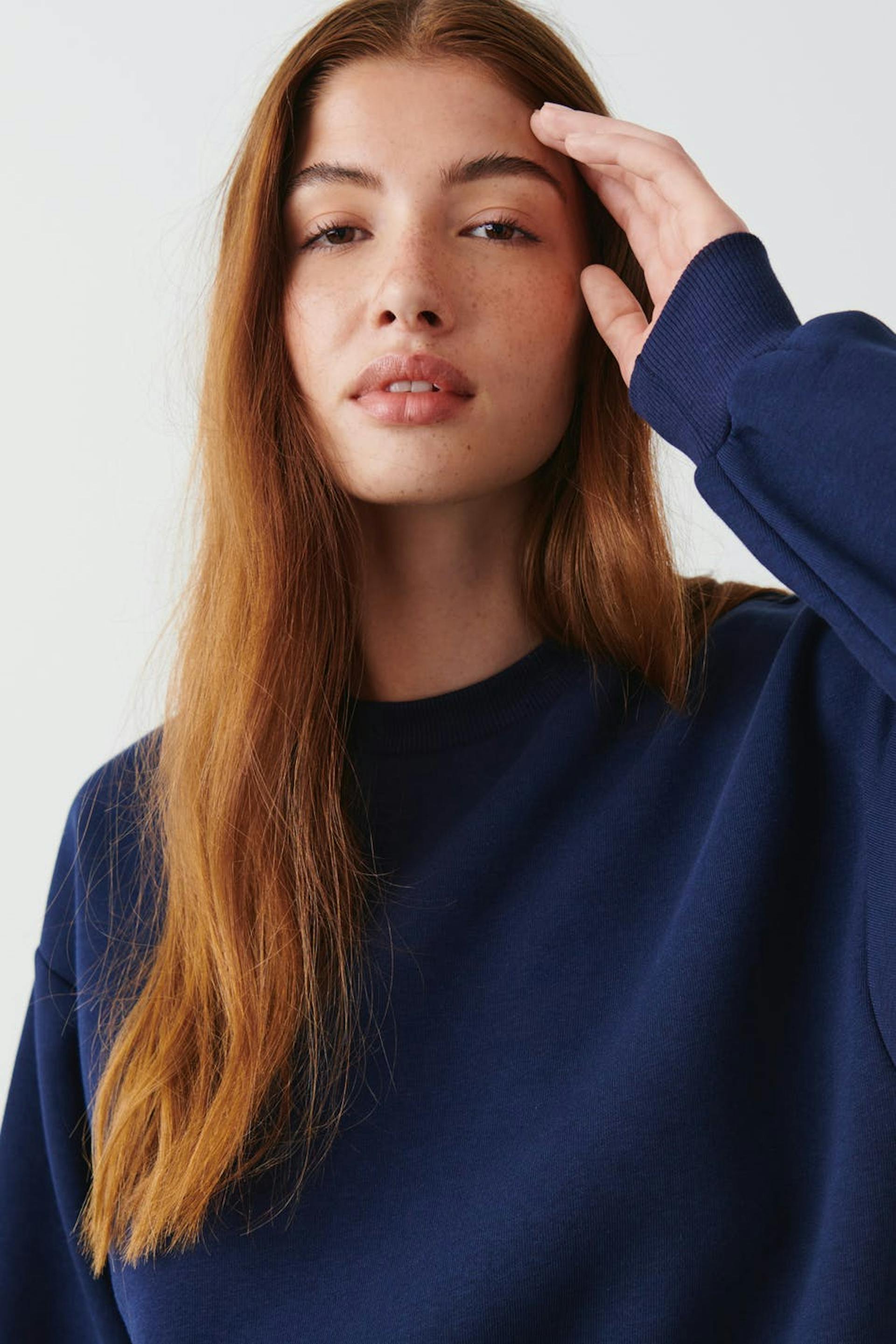 Zachte sweatshirt met een overmaatse pasvorm. De sweatshirt is blauw en heeft hangende schouders. Het heeft een ronde halslijn en een geribbelde manchet aan de uiteinden van de mouwen en in de onderste zoom.