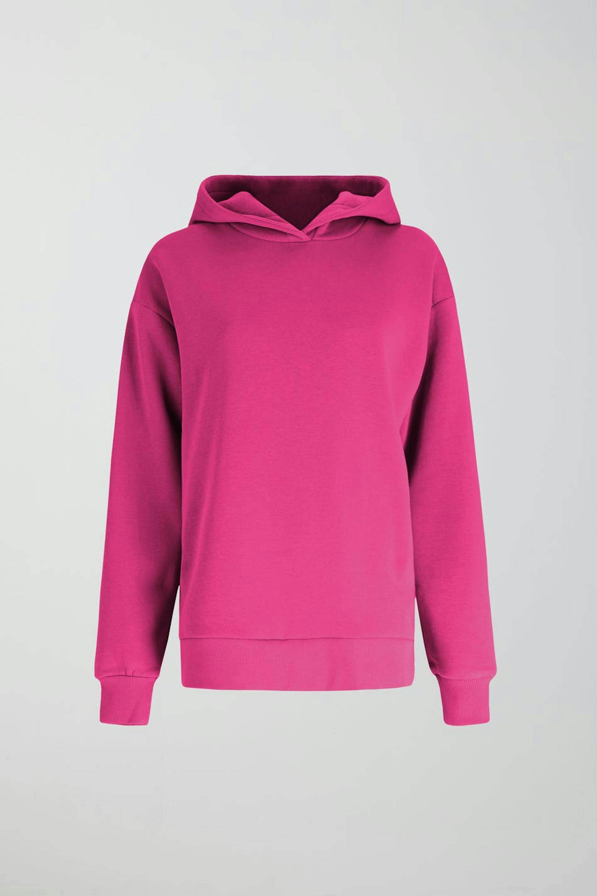 Hoodie met een overmaatse pasvorm. De hoodie is roze en heeft hangende schouders. Het heeft capuchon achter en geribbelde manchet aan de uiteinden van de mouwen en in de onderste zoom.