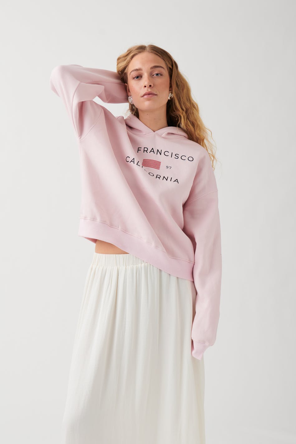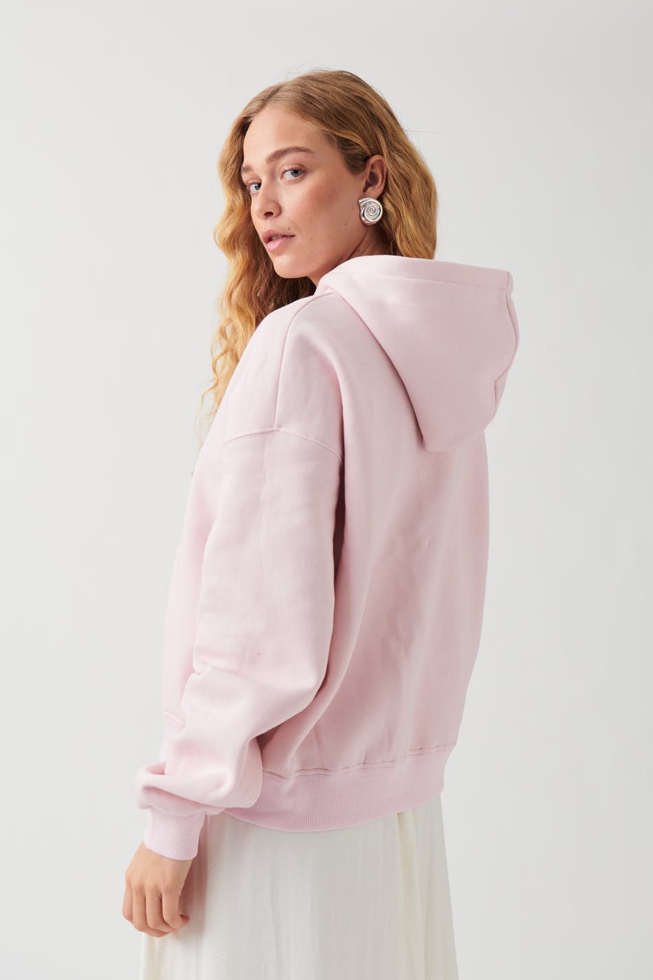 Oversized sweatshirt met tekst print aan de voorkant. De sweatshirt is roze en heeft gevoerde capuchon. Het heeft hangende schouder en geribbelde manchet aan de mouwuiteinden en aan de onderkant.