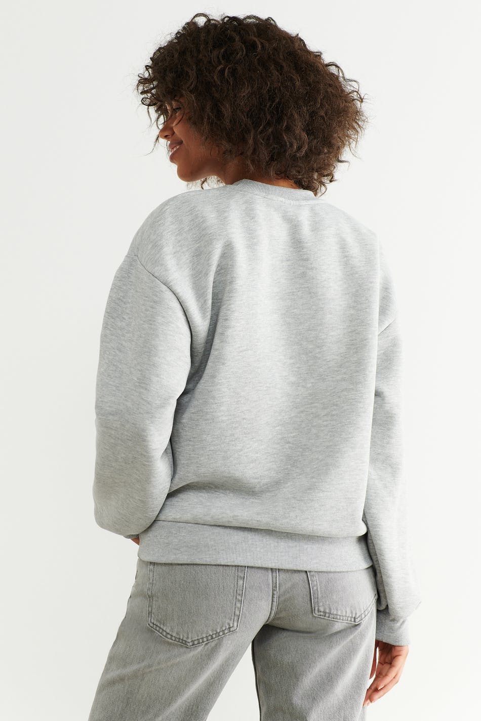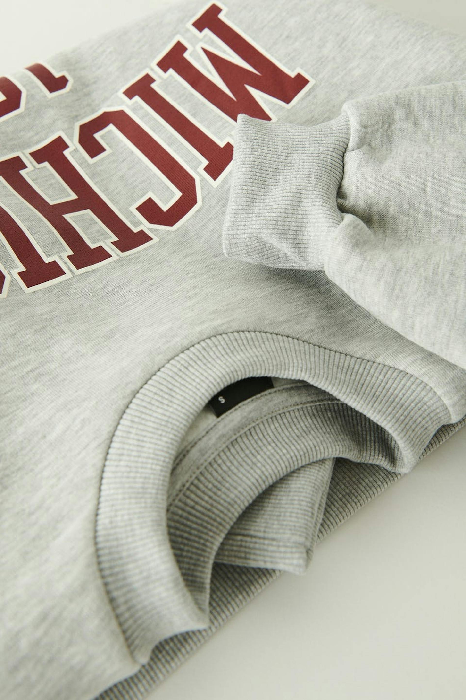Sweatshirt met print. De sweatshirt is grijs en heeft een overmaatse pasvorm. Het heeft een ronde halslijn en een geribbelde manchet aan de uiteinden van de mouwen en in de onderste zoom.
