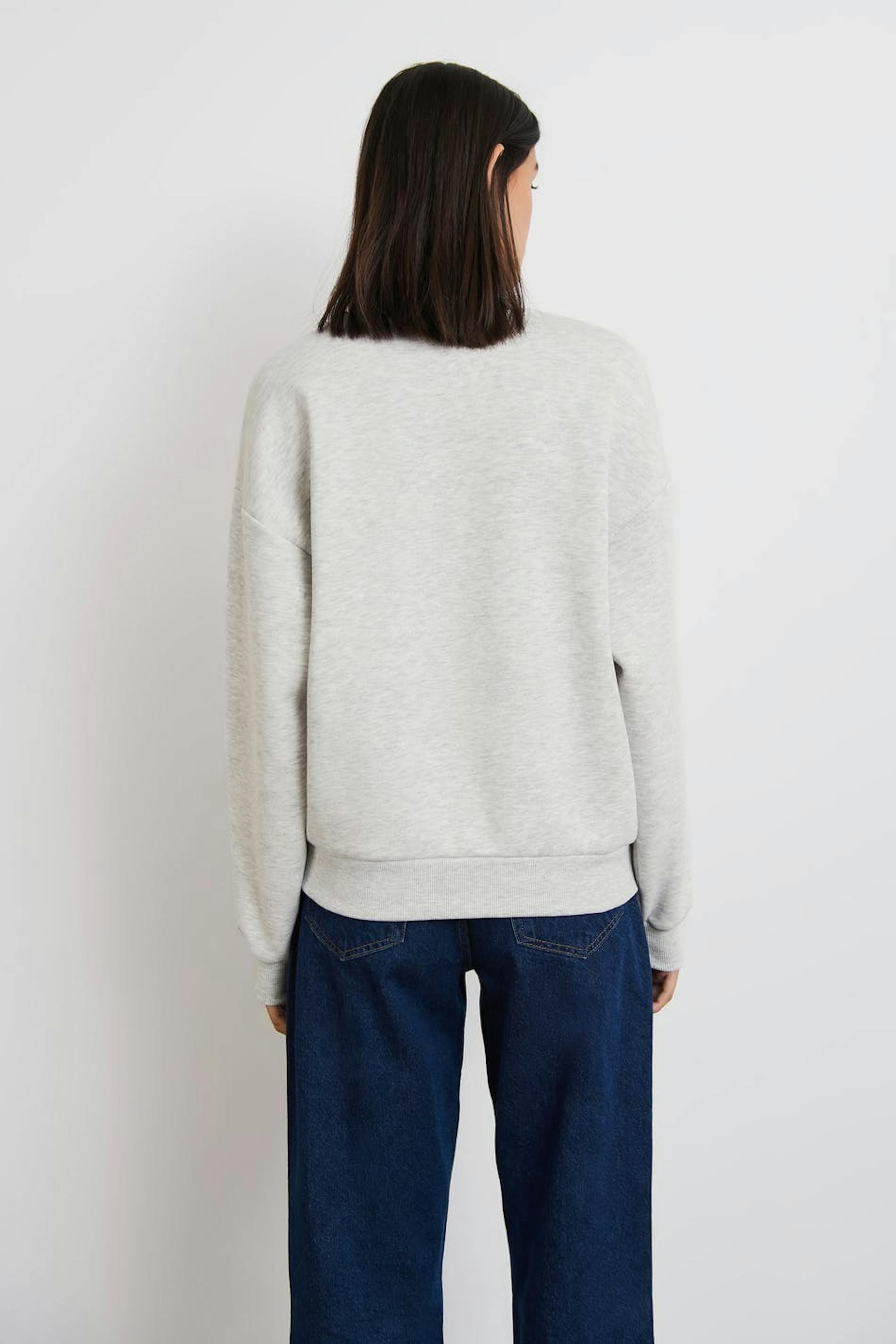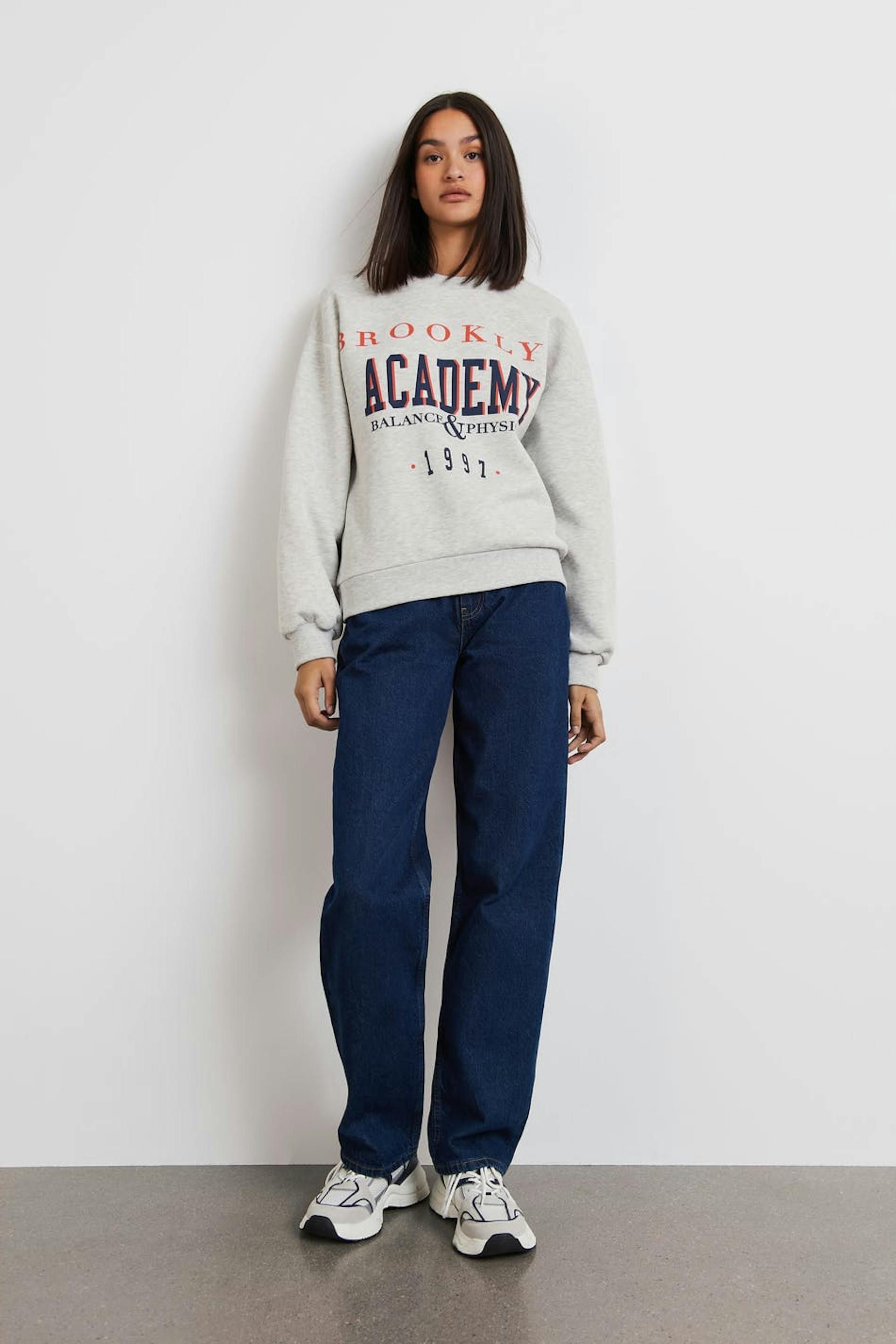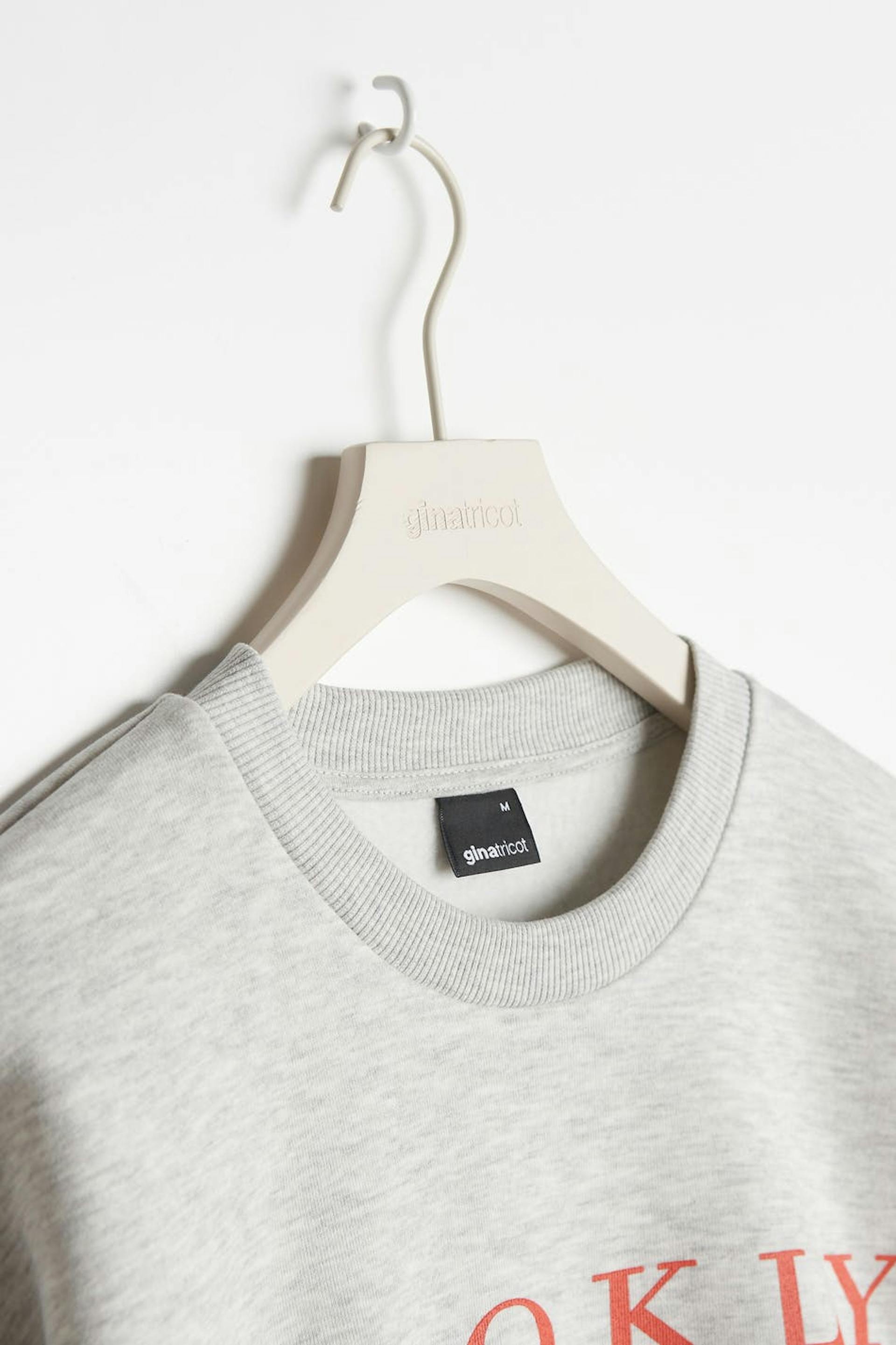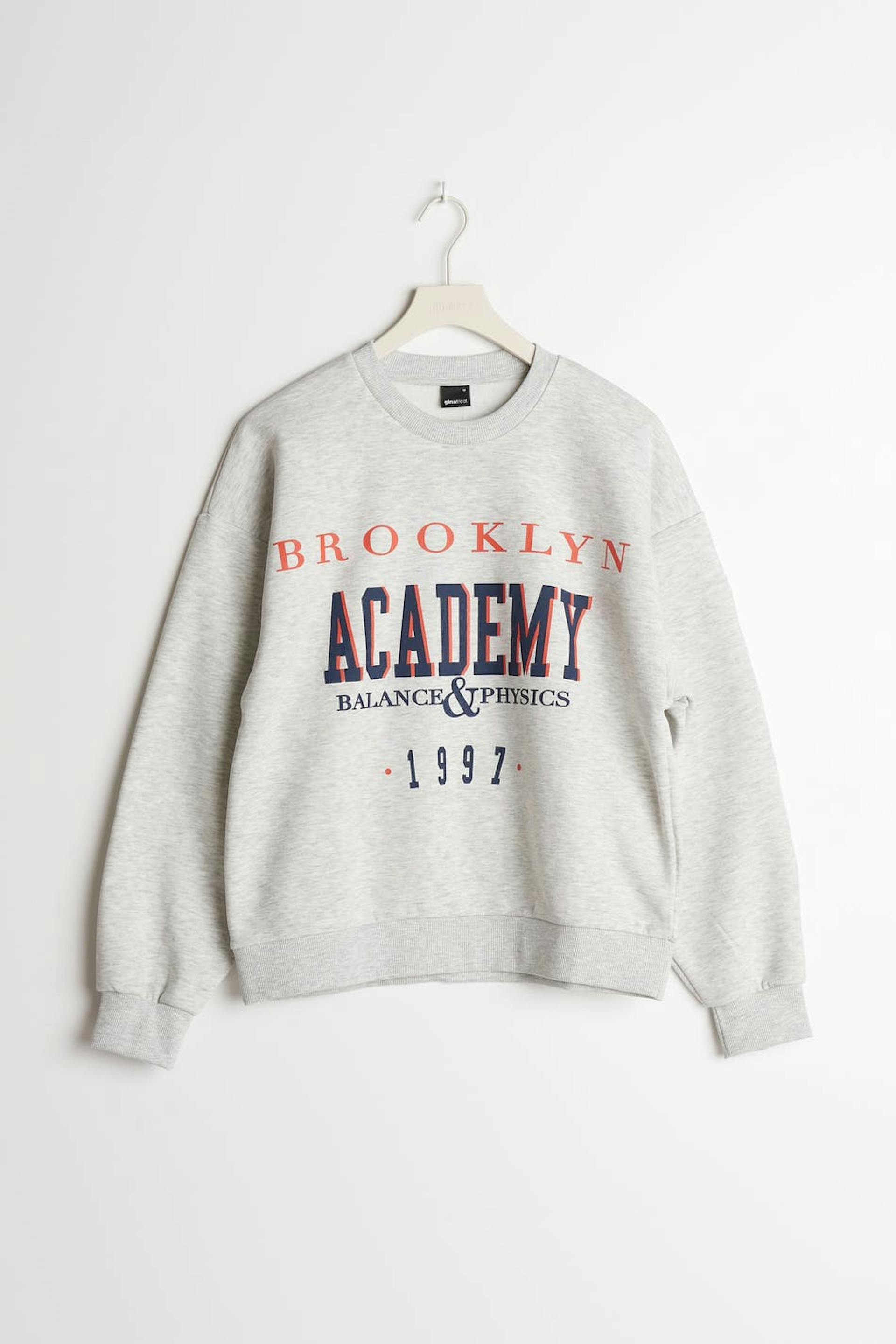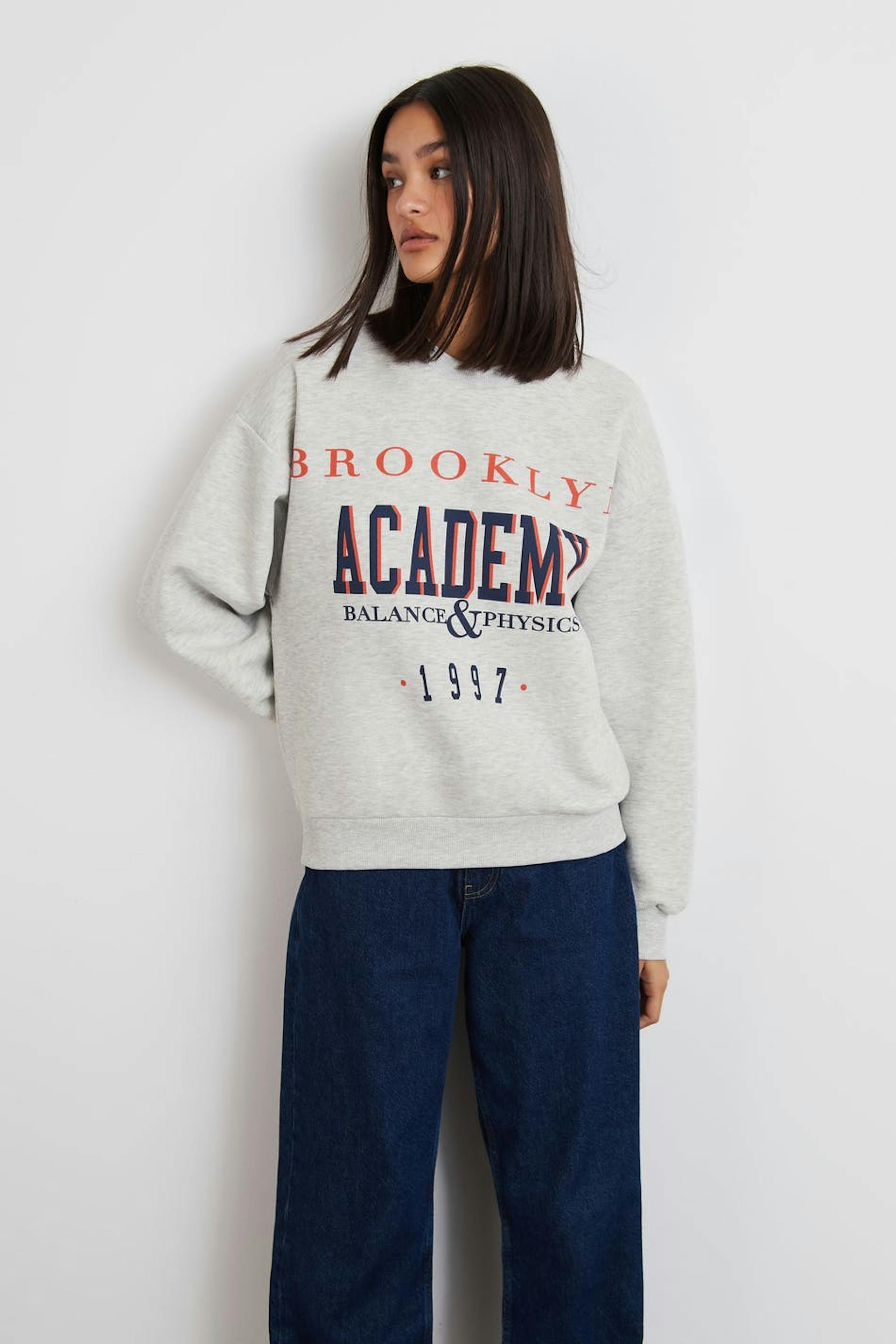 Sweatshirt met een overmaatse pasvorm. De sweatshirt is grijs en heeft een print aan de voorkant. Het heeft een ronde halslijn en een geribbelde manchet aan de uiteinden van de mouwen en in de onderste zoom.