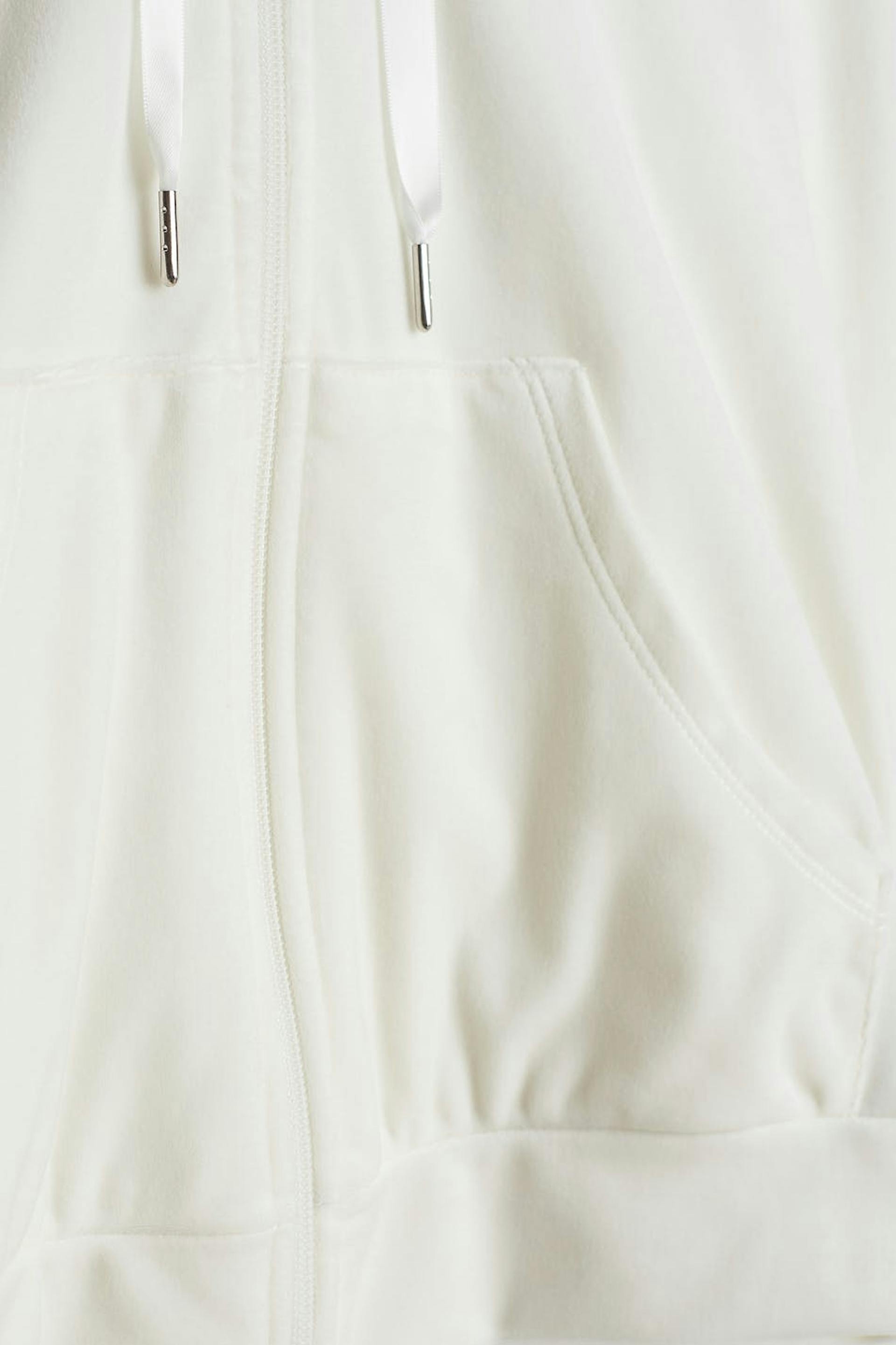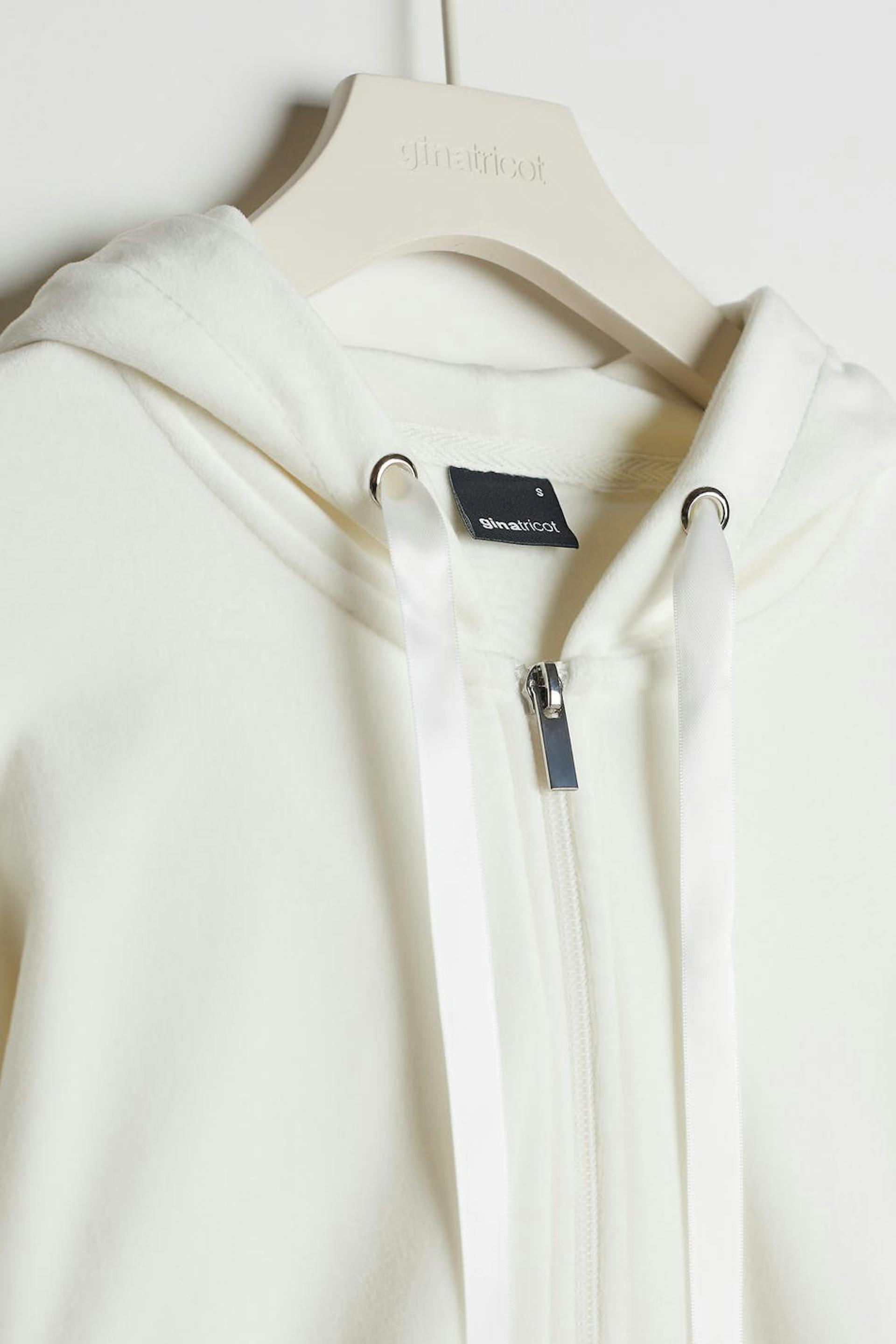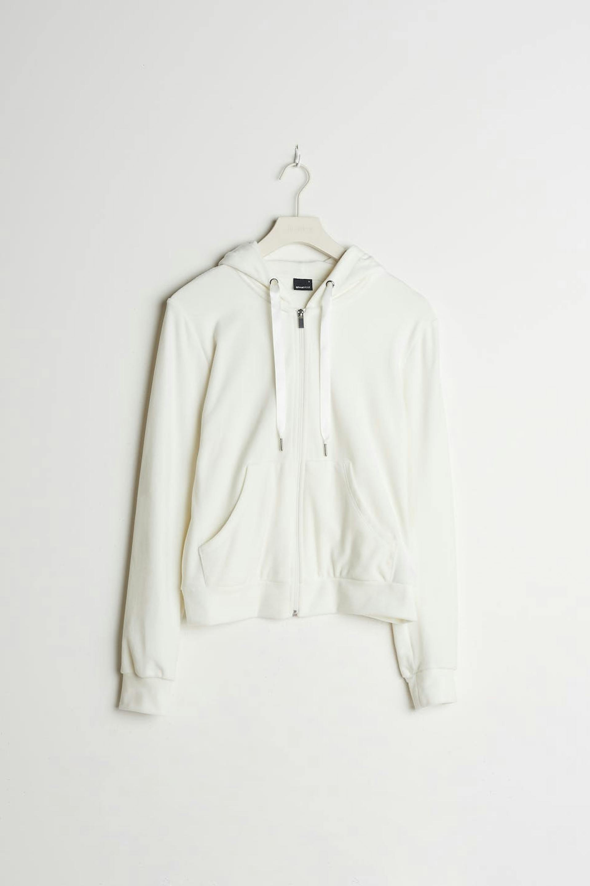 Sweatshirt met een capuchon met een trekkoord van satijn. De sweatshirt is wit en heeft een rits aan de voorkant. Het is gemaakt uit velours en heeft zakken aan de voorkant. Uit de buurt van vuur houden.