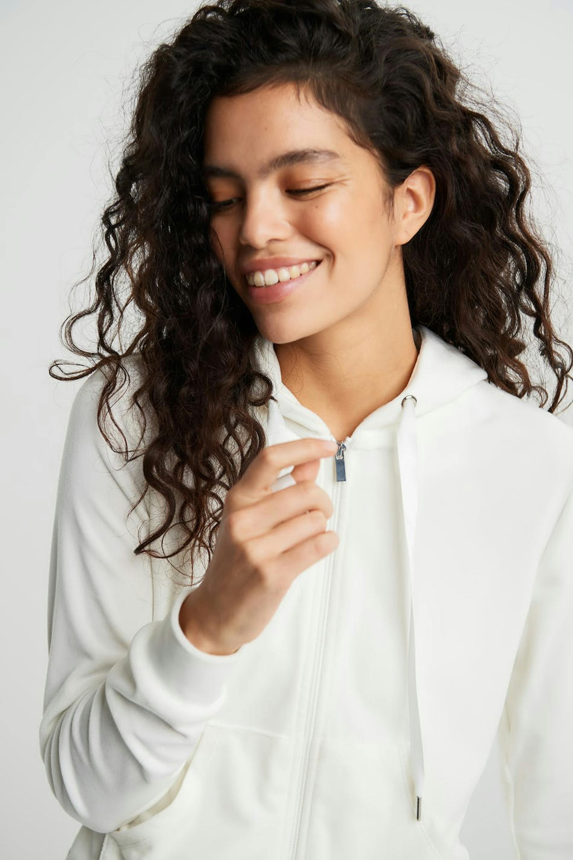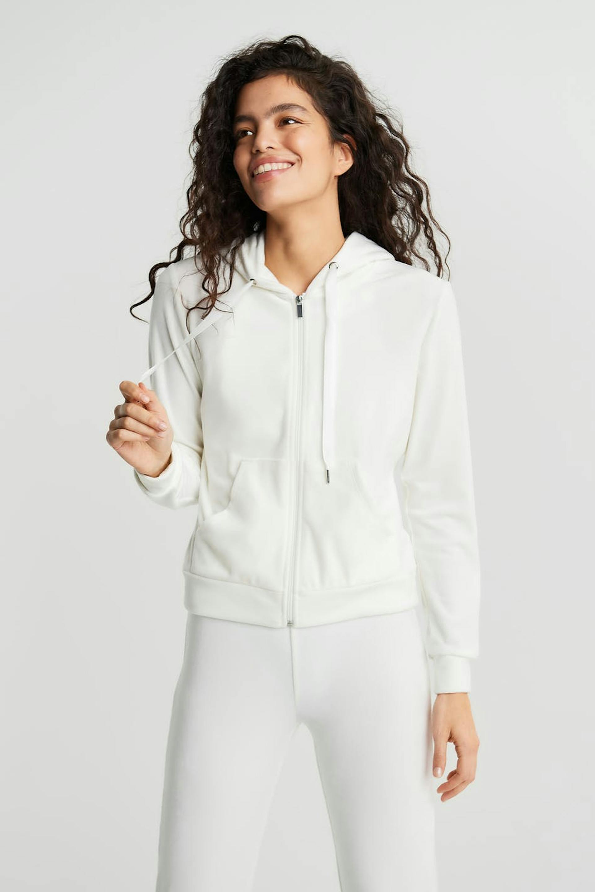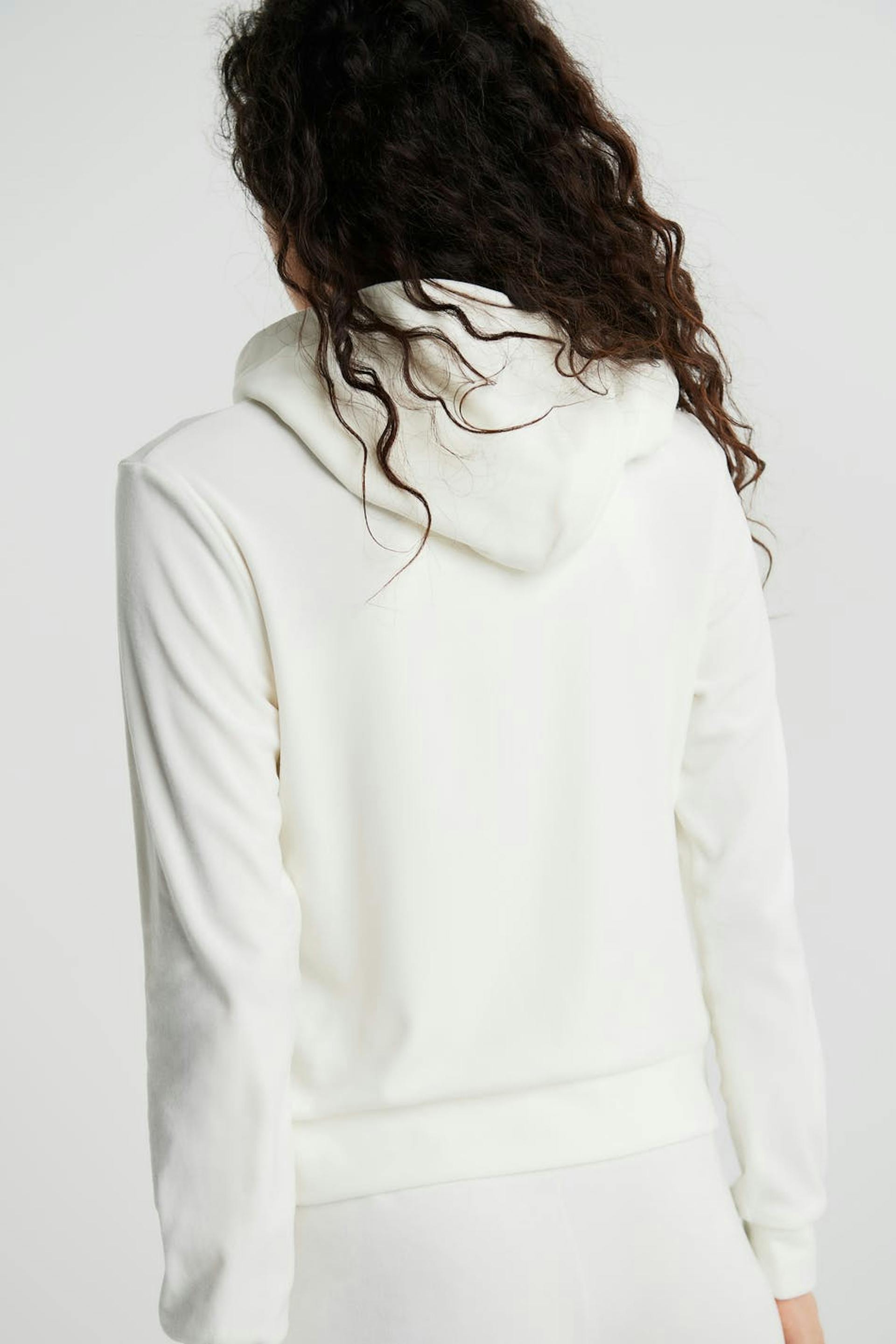 Sweatshirt met een capuchon met een trekkoord van satijn. De sweatshirt is wit en heeft een rits aan de voorkant. Het is gemaakt uit velours en heeft zakken aan de voorkant. Uit de buurt van vuur houden.