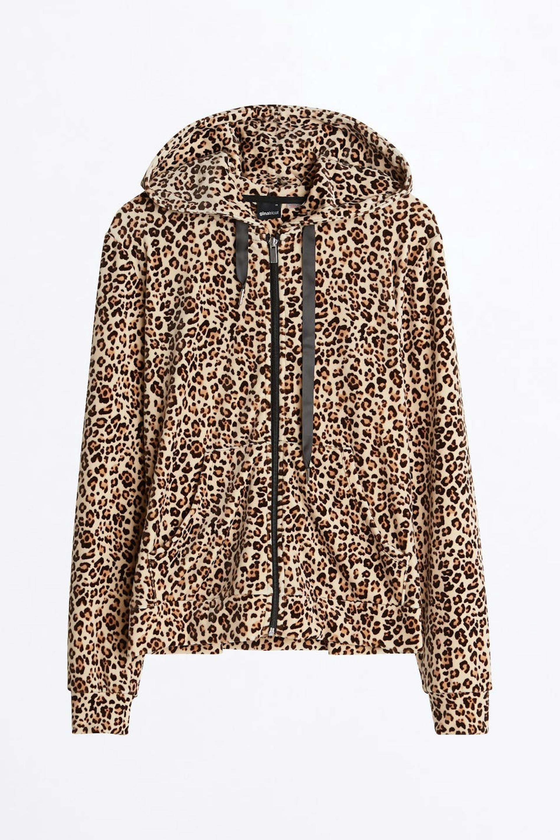 Sweatshirt met een capuchon met een trekkoord van satijn. De sweatshirt is luipaardkleurig en heeft een rits aan de voorkant. Het is gemaakt uit velours en heeft zakken aan de voorkant. Uit de buurt van vuur houden.