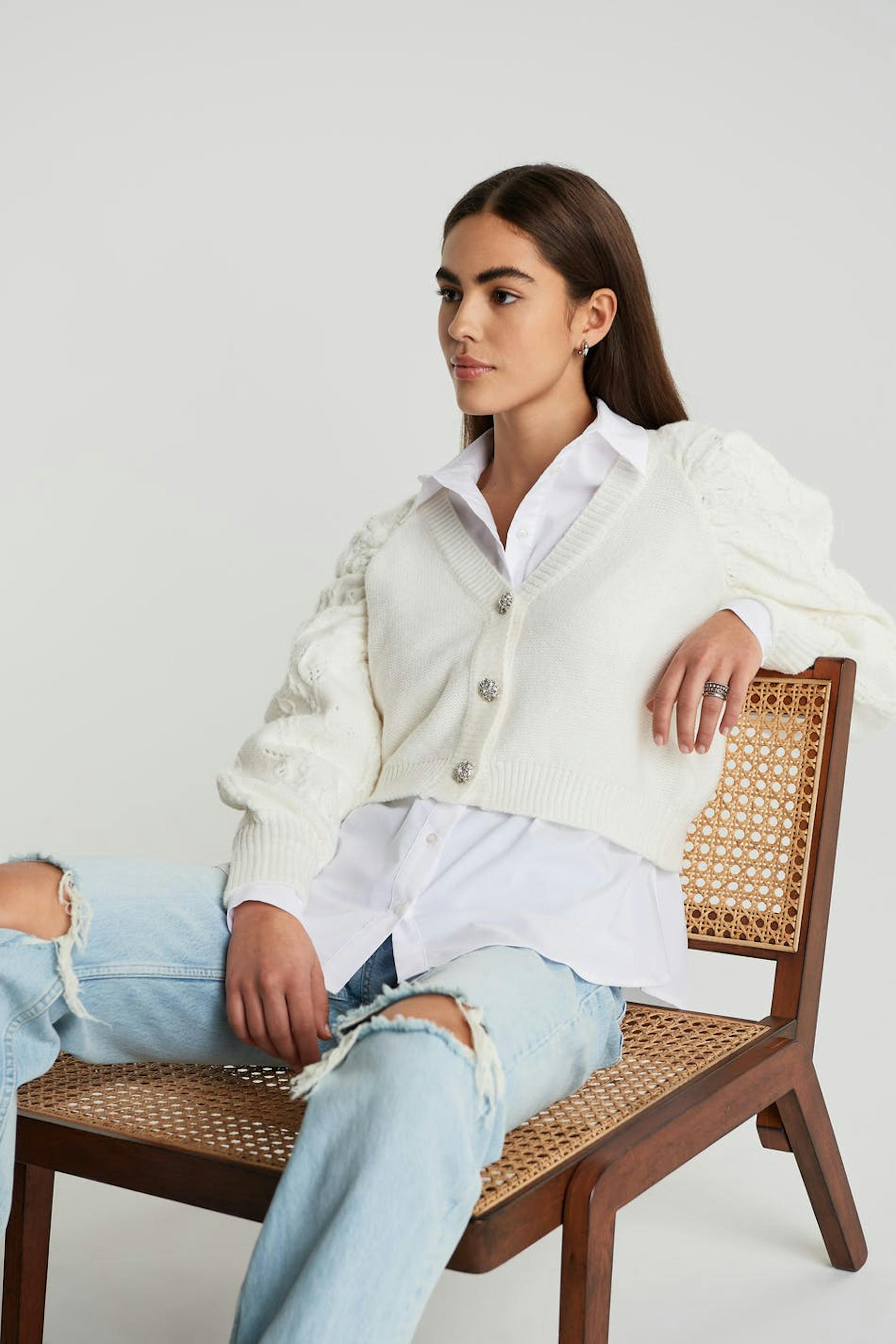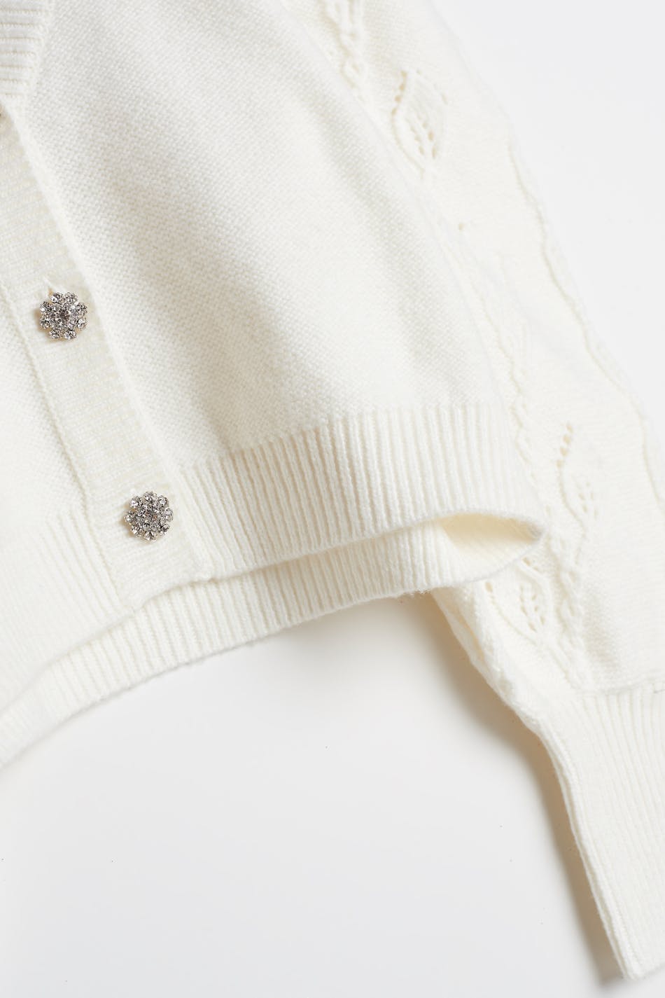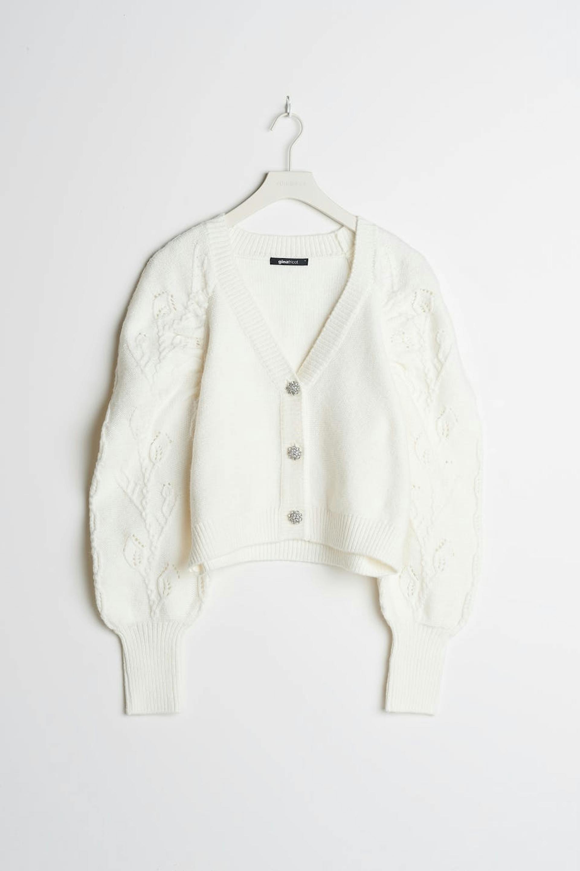 Knitted cardigan with wide sleeves and gem buttons.