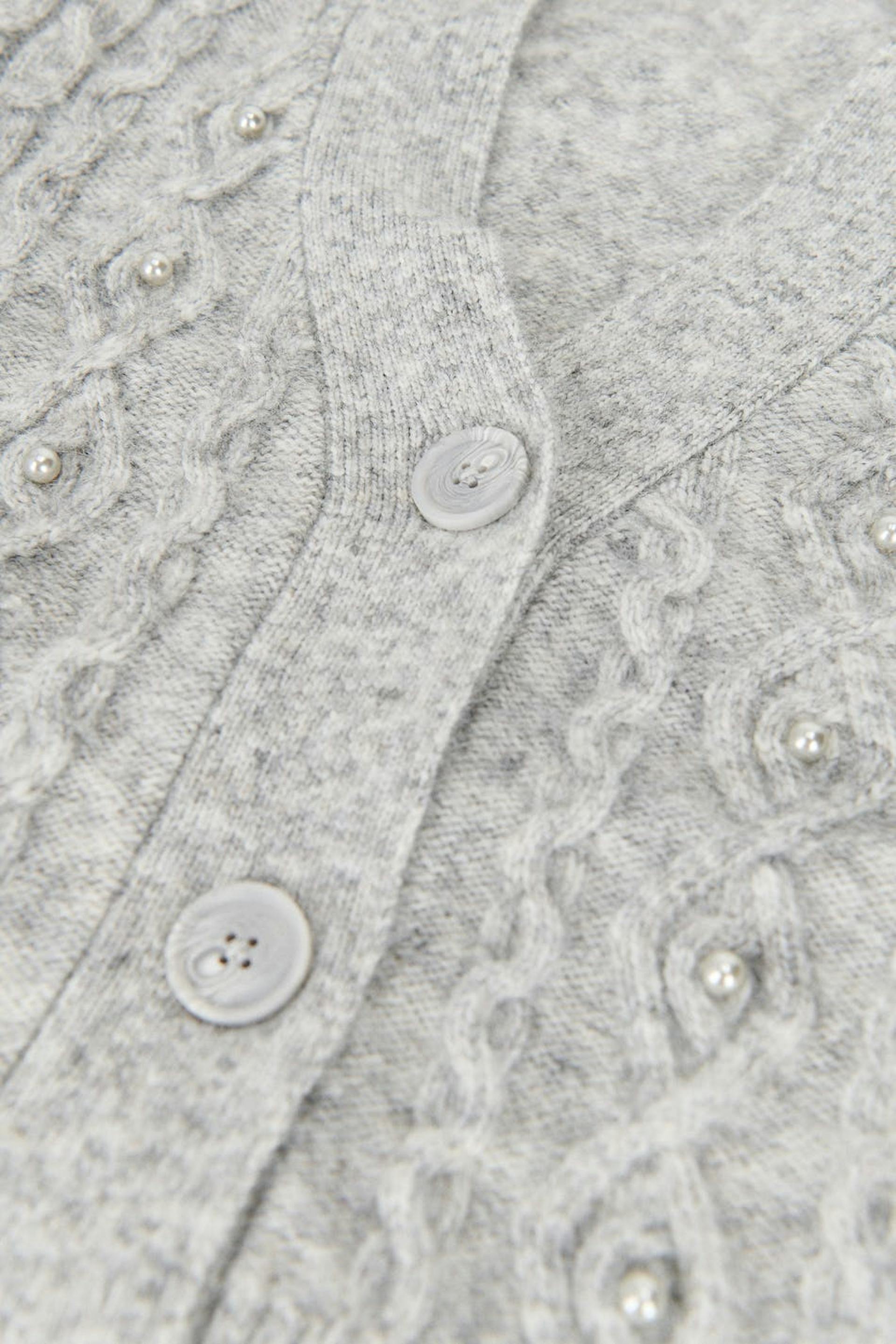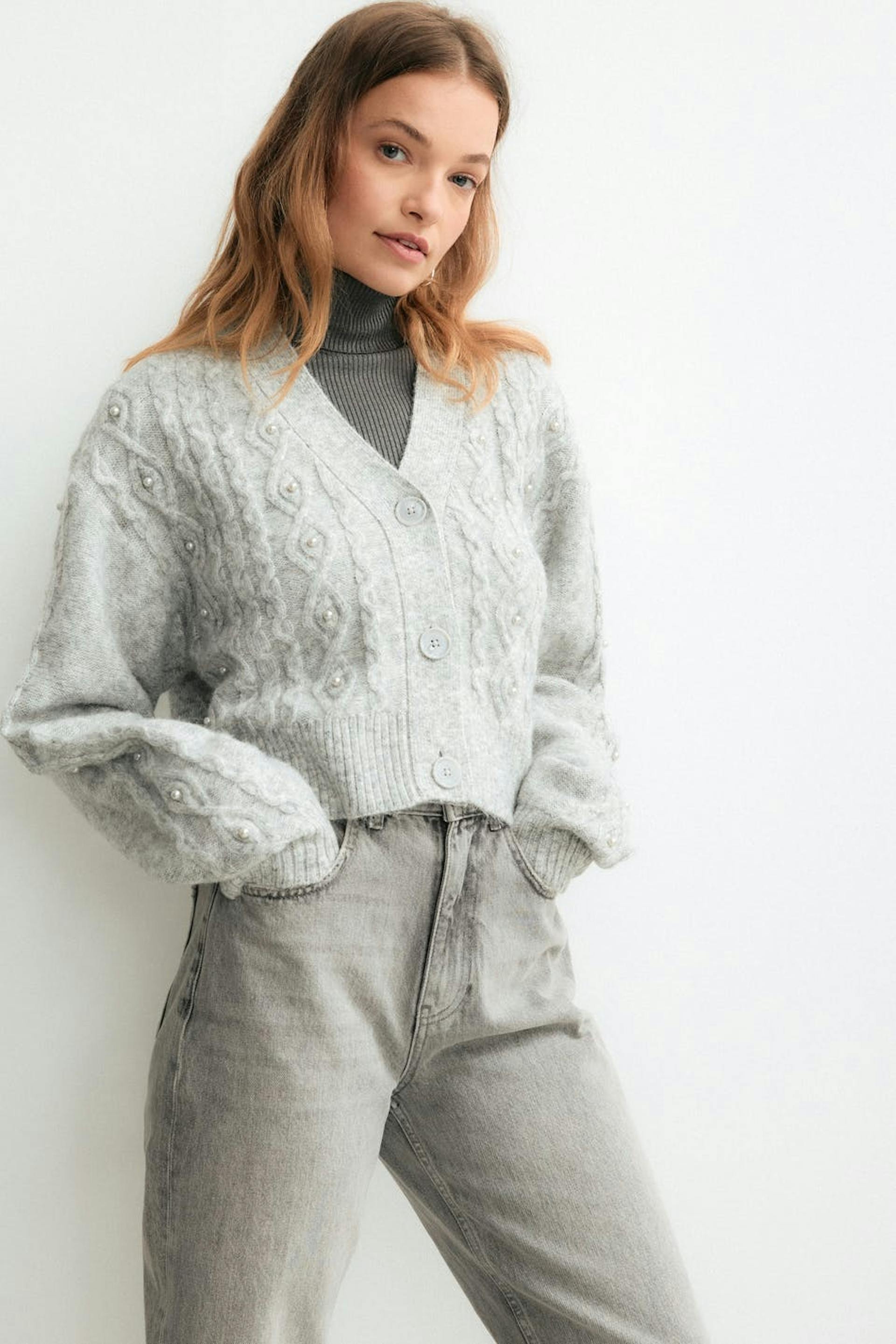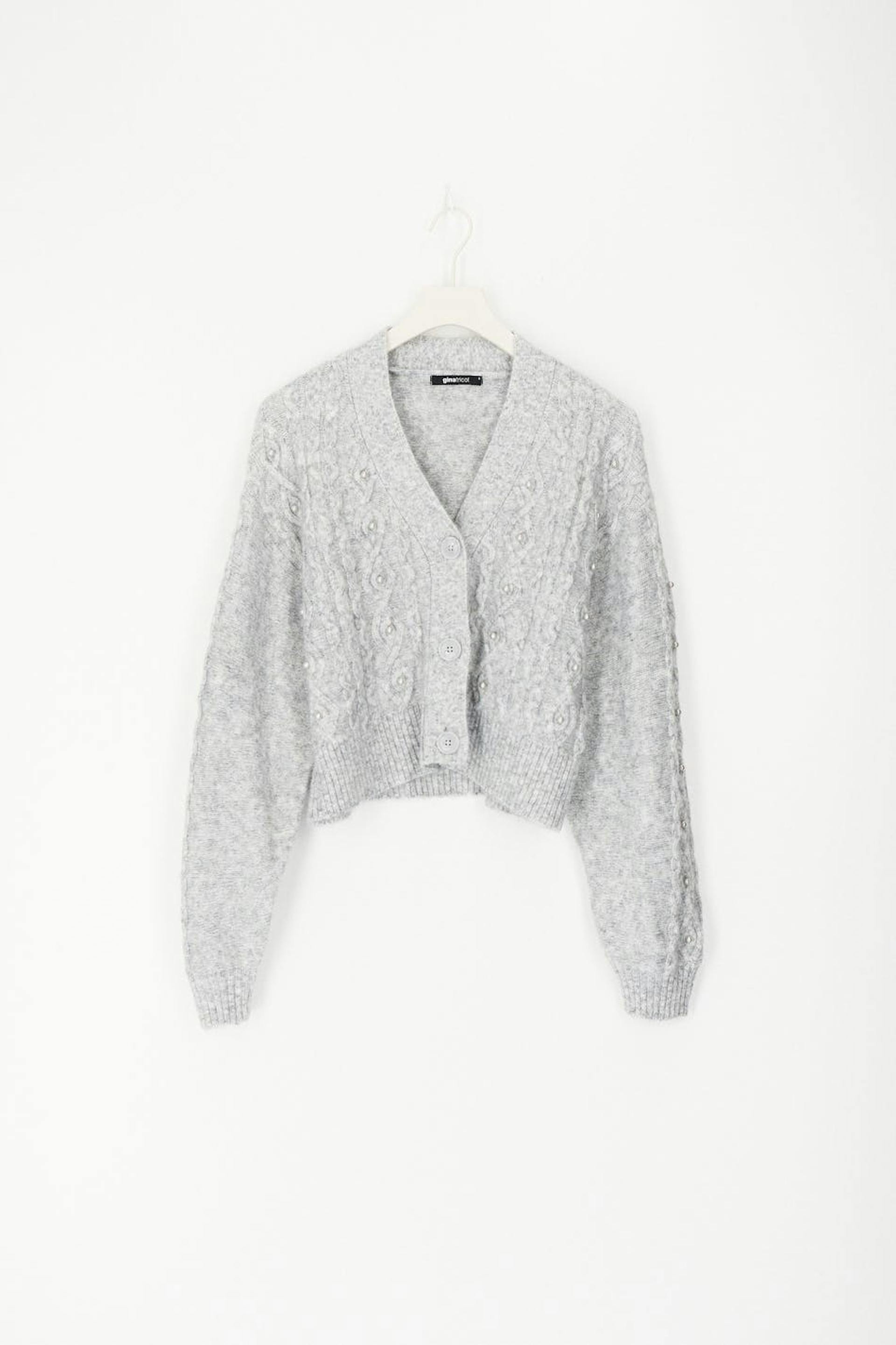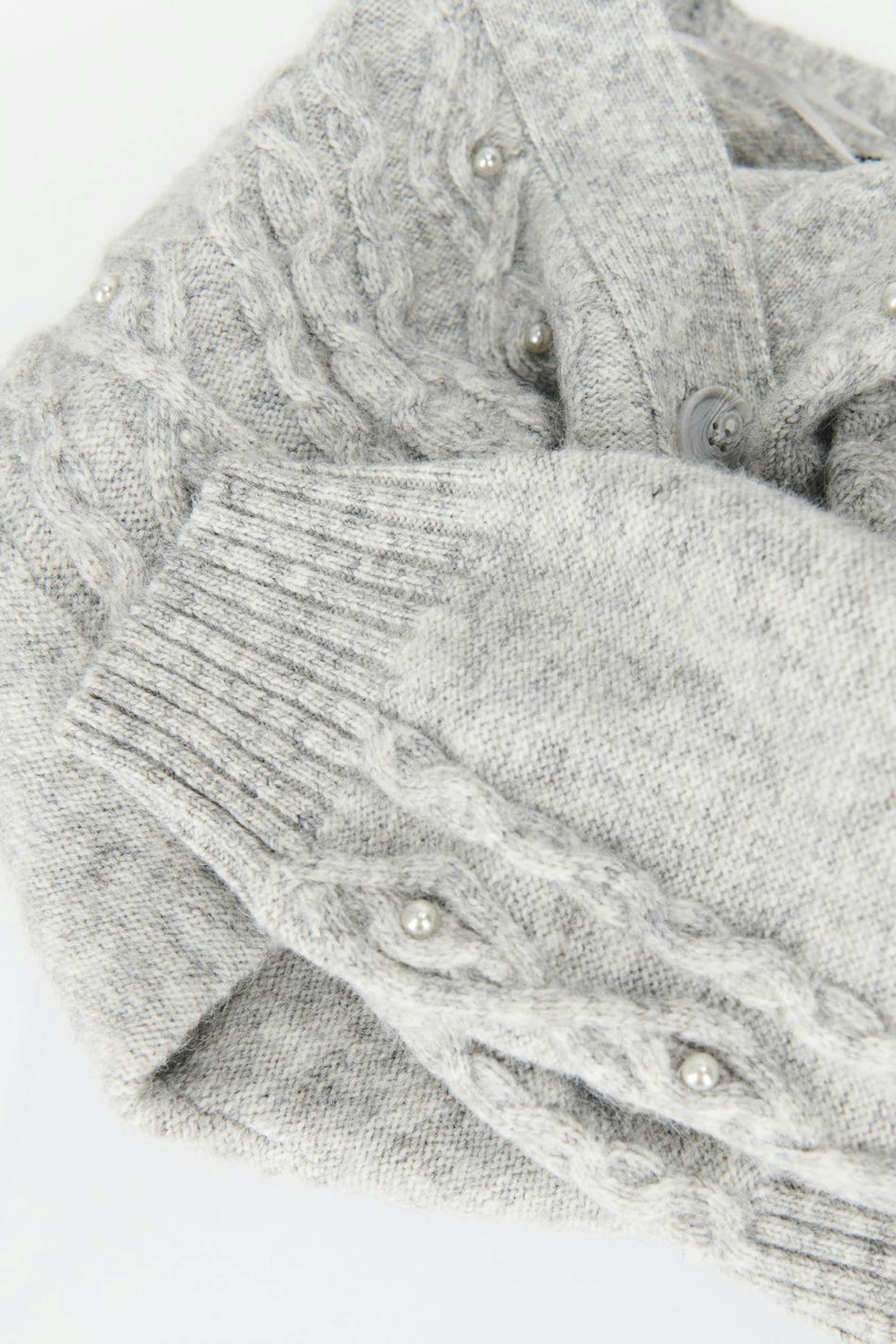 Kabelgebreide cardigan met details met parels aan de voorkant. De cardigan is grijs en heeft boxy pasvorm. Het heeft v-hals, knooppas aan de voorzijde en geribd gebreid materiaal aan de onderkant.