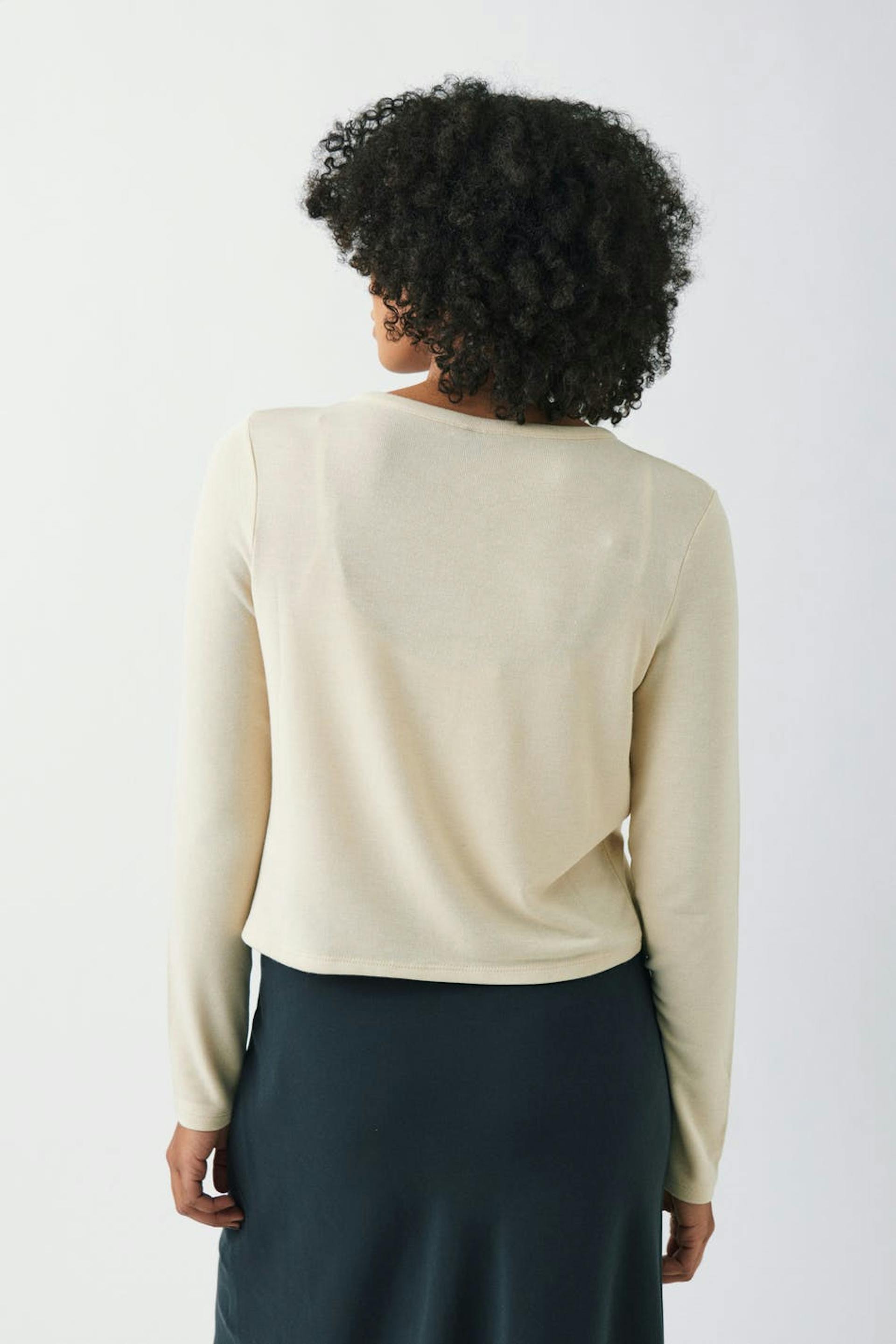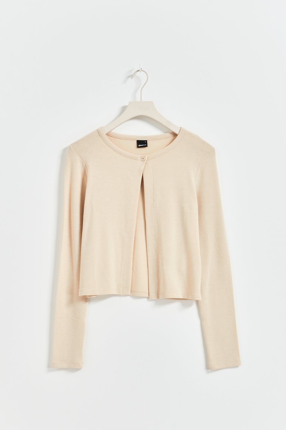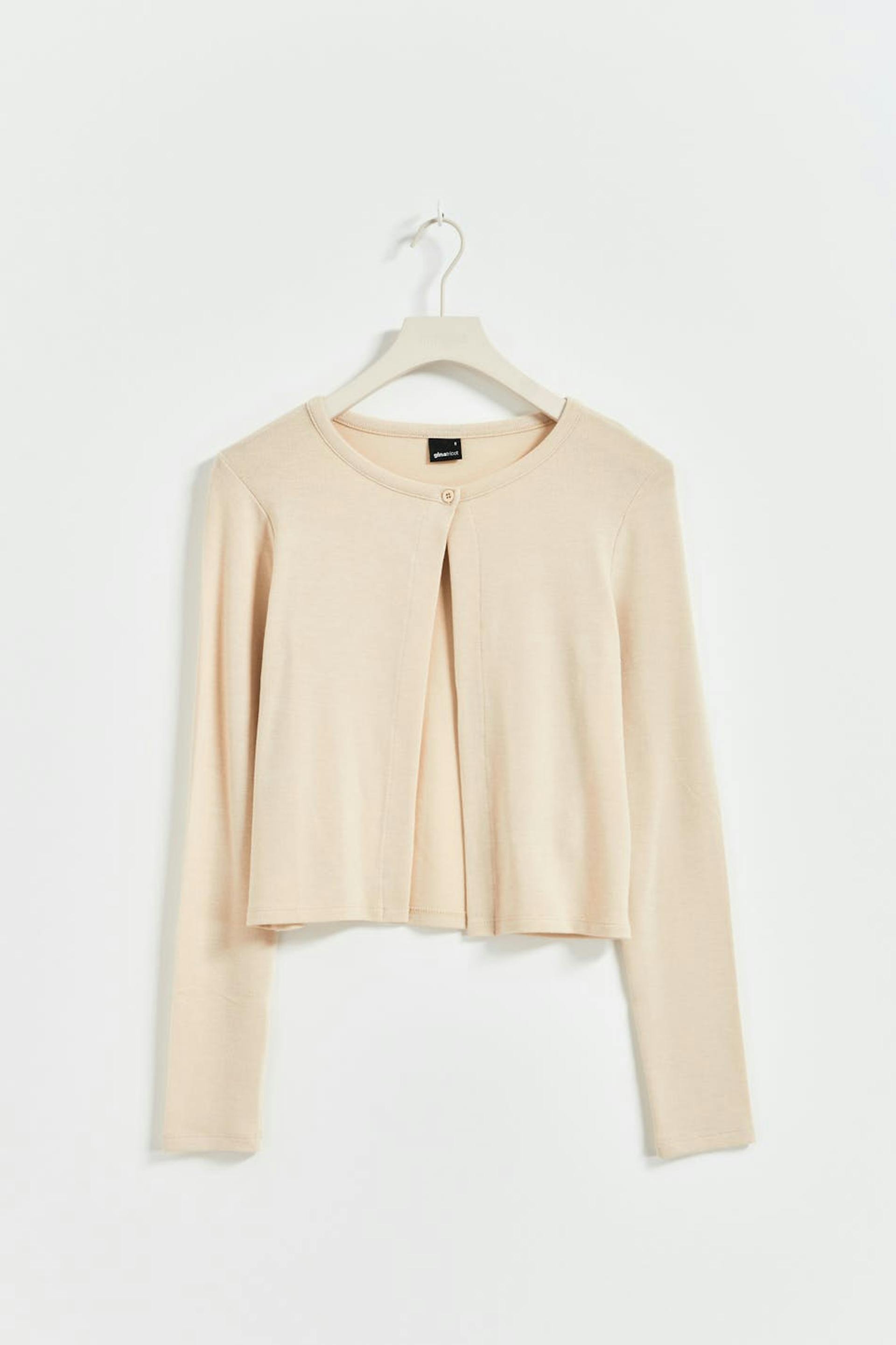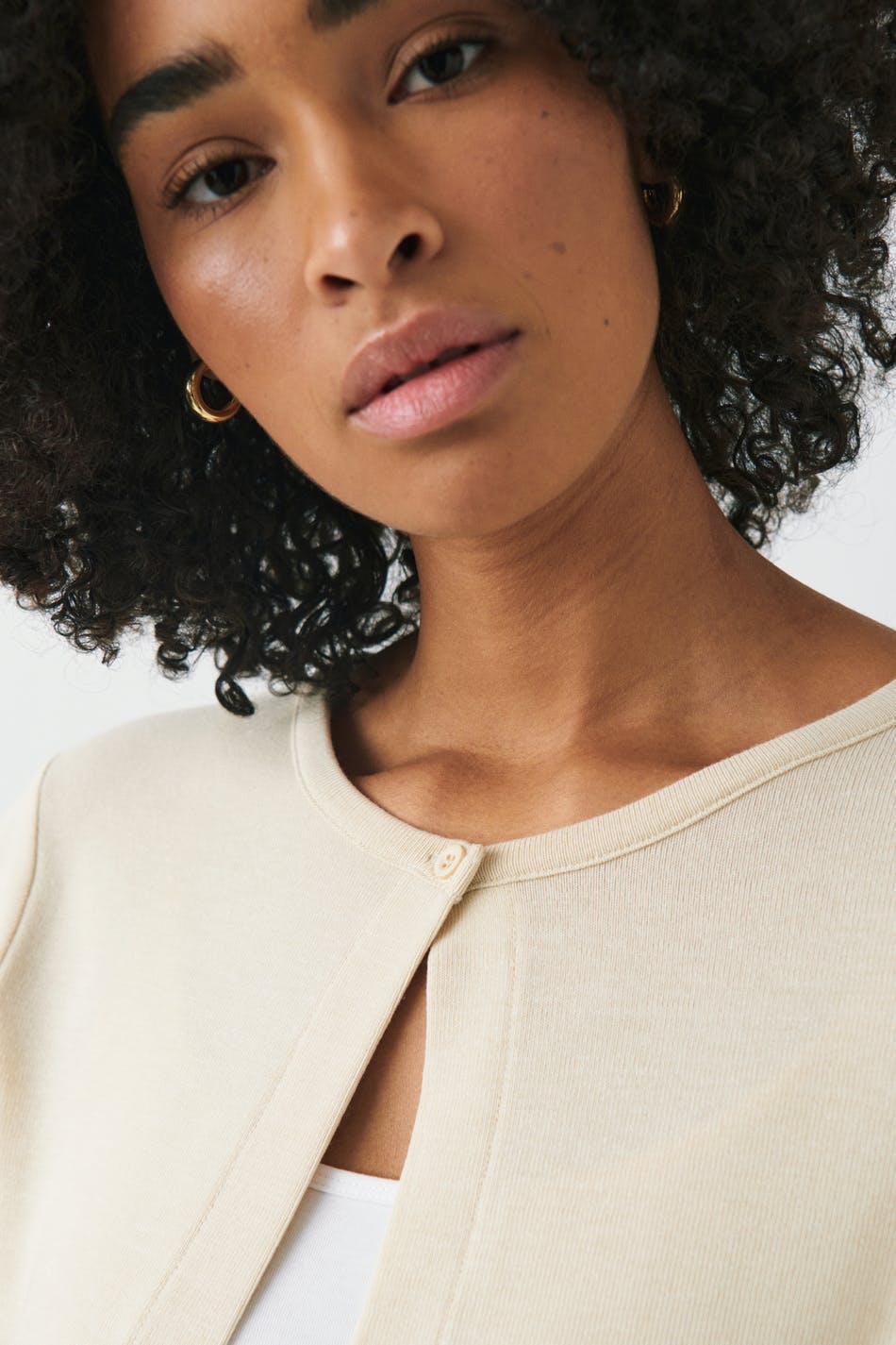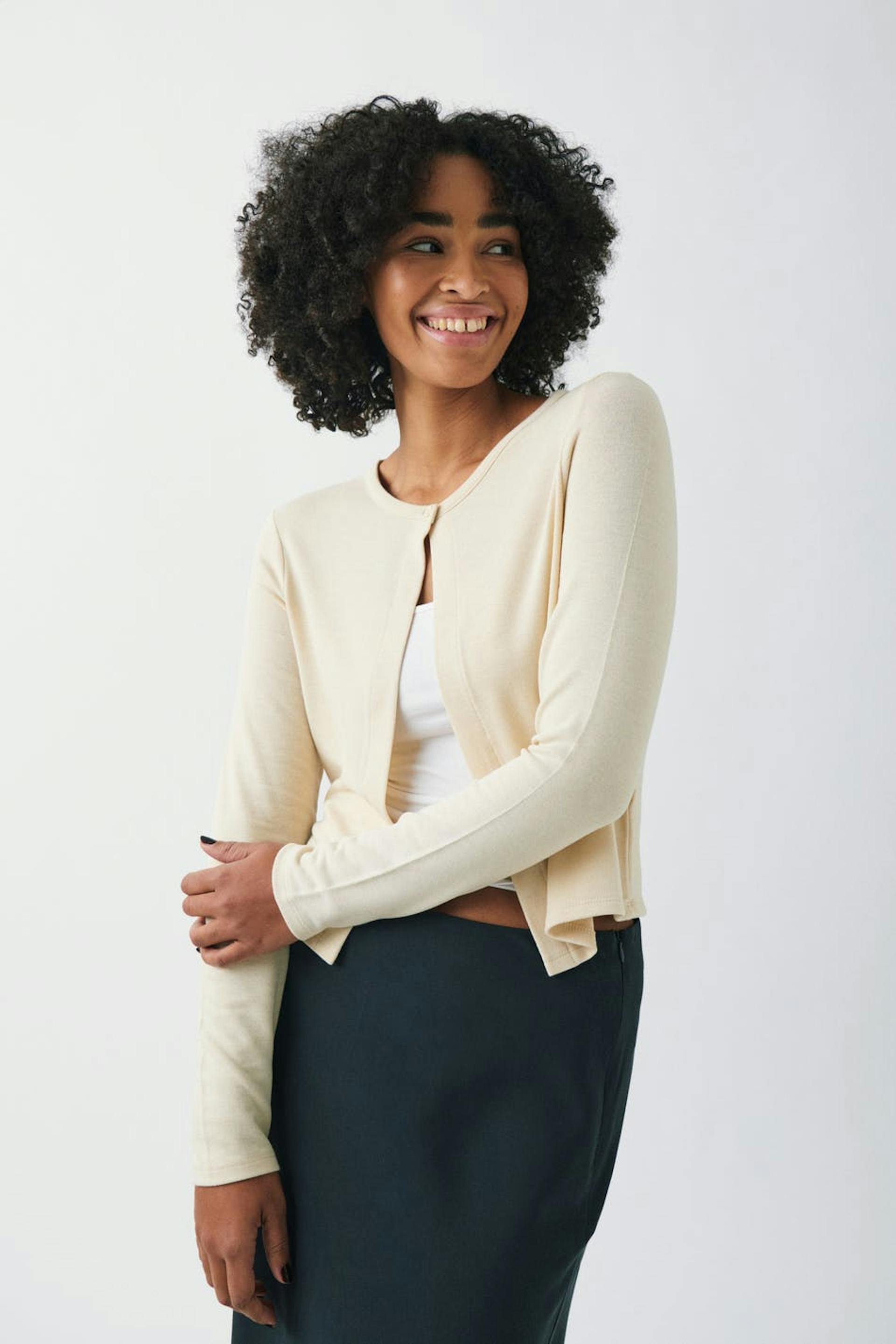Cardigan van geribde jersey met nauwsluitende pasvorm. De cardigan is wit en heeft eenknoopssluiting aan de voorkant. Het heeft ronde halslijn, lange mouw en korte lengte.