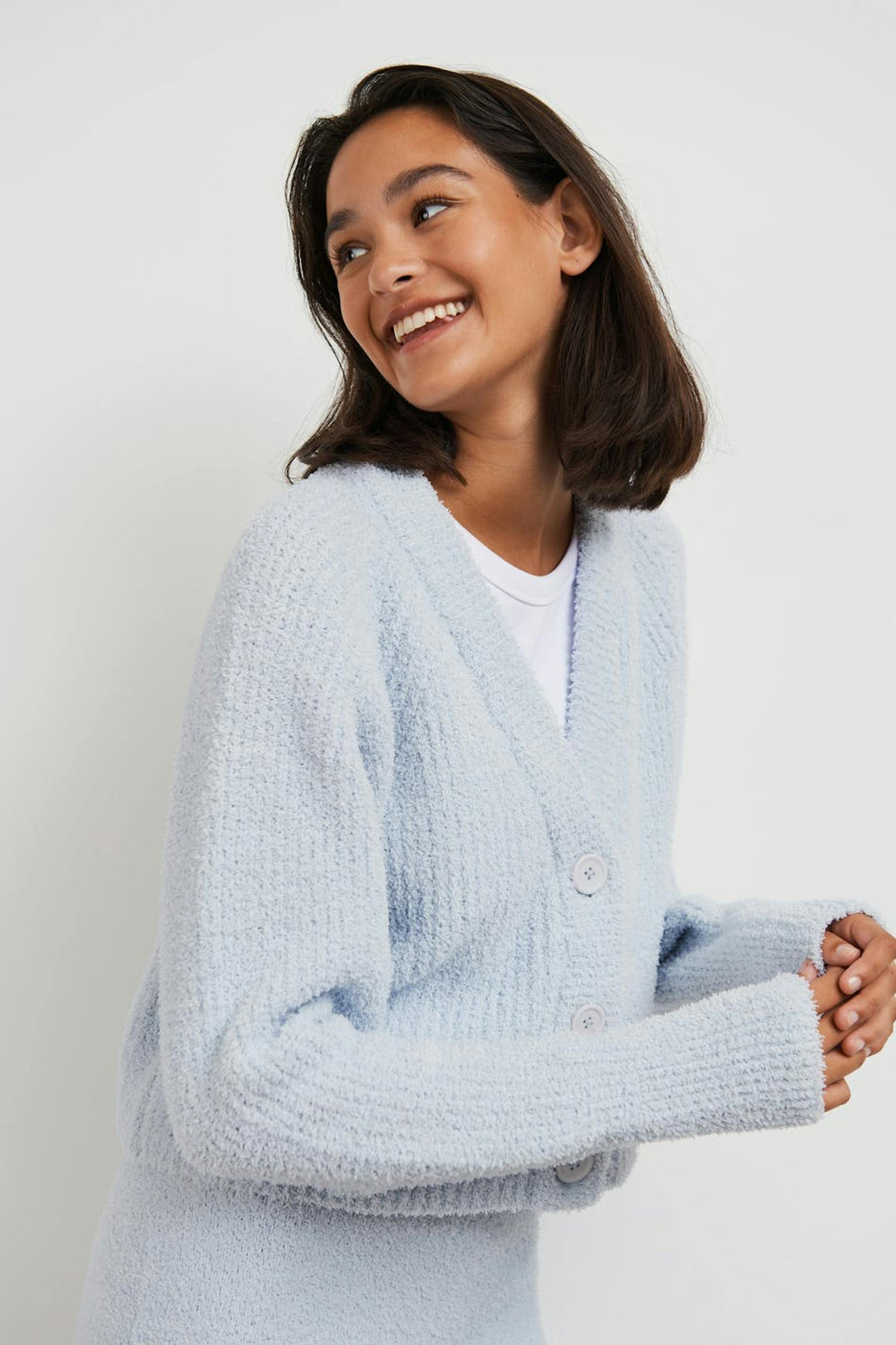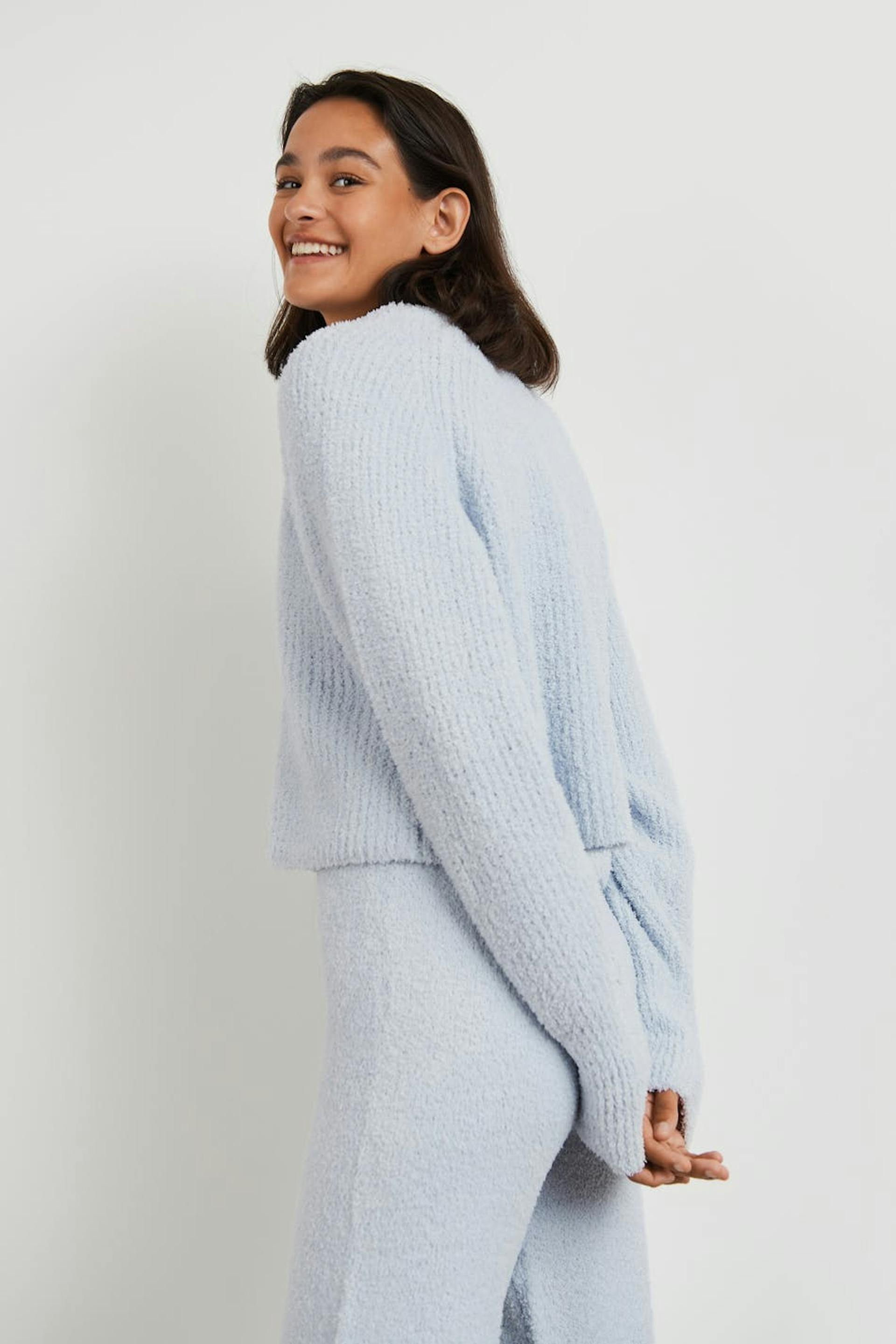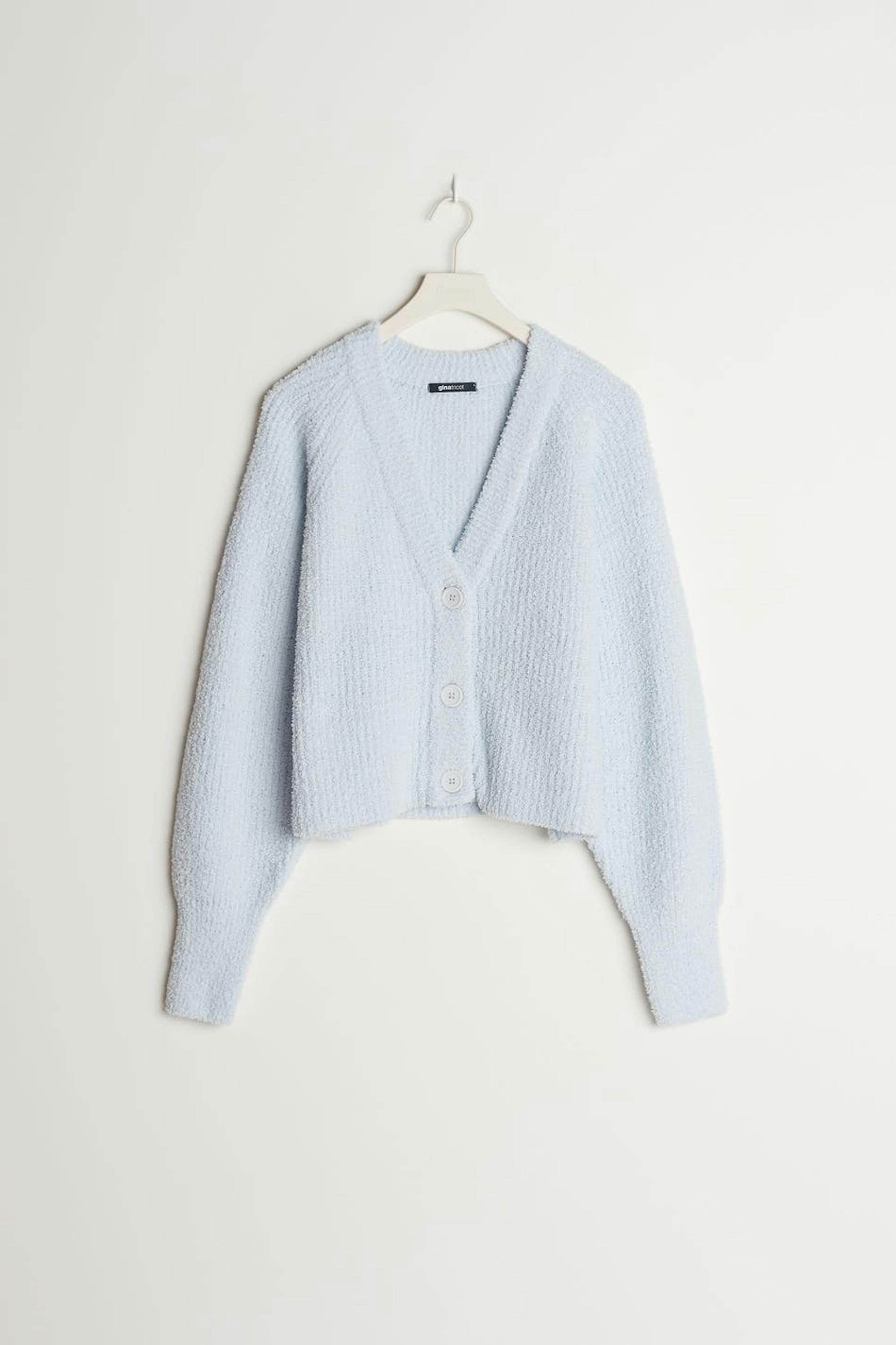 Gebreide sweater met v-hals. De sweater is blauw, met lange mouwen en afgesneden. Het heeft een sluitknoop aan de voorkant en een zachte en pluizige kwaliteit.