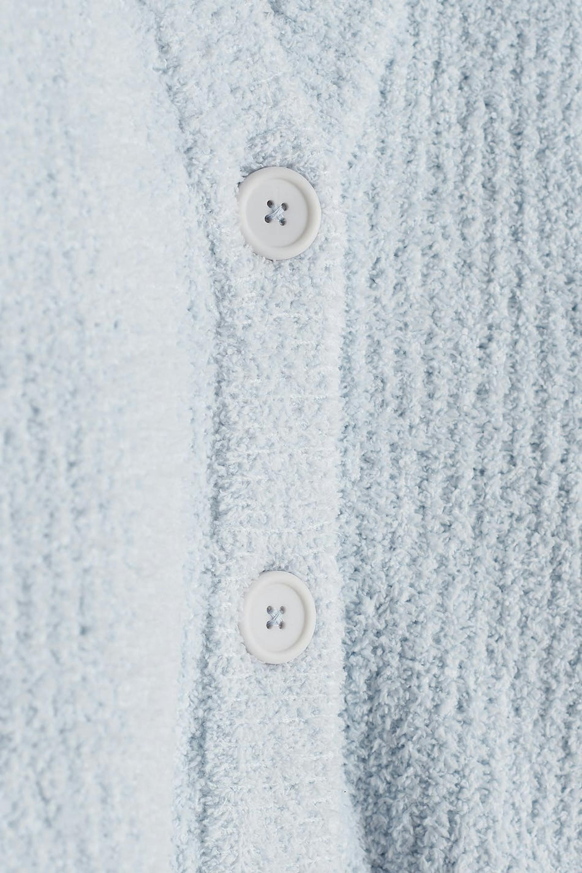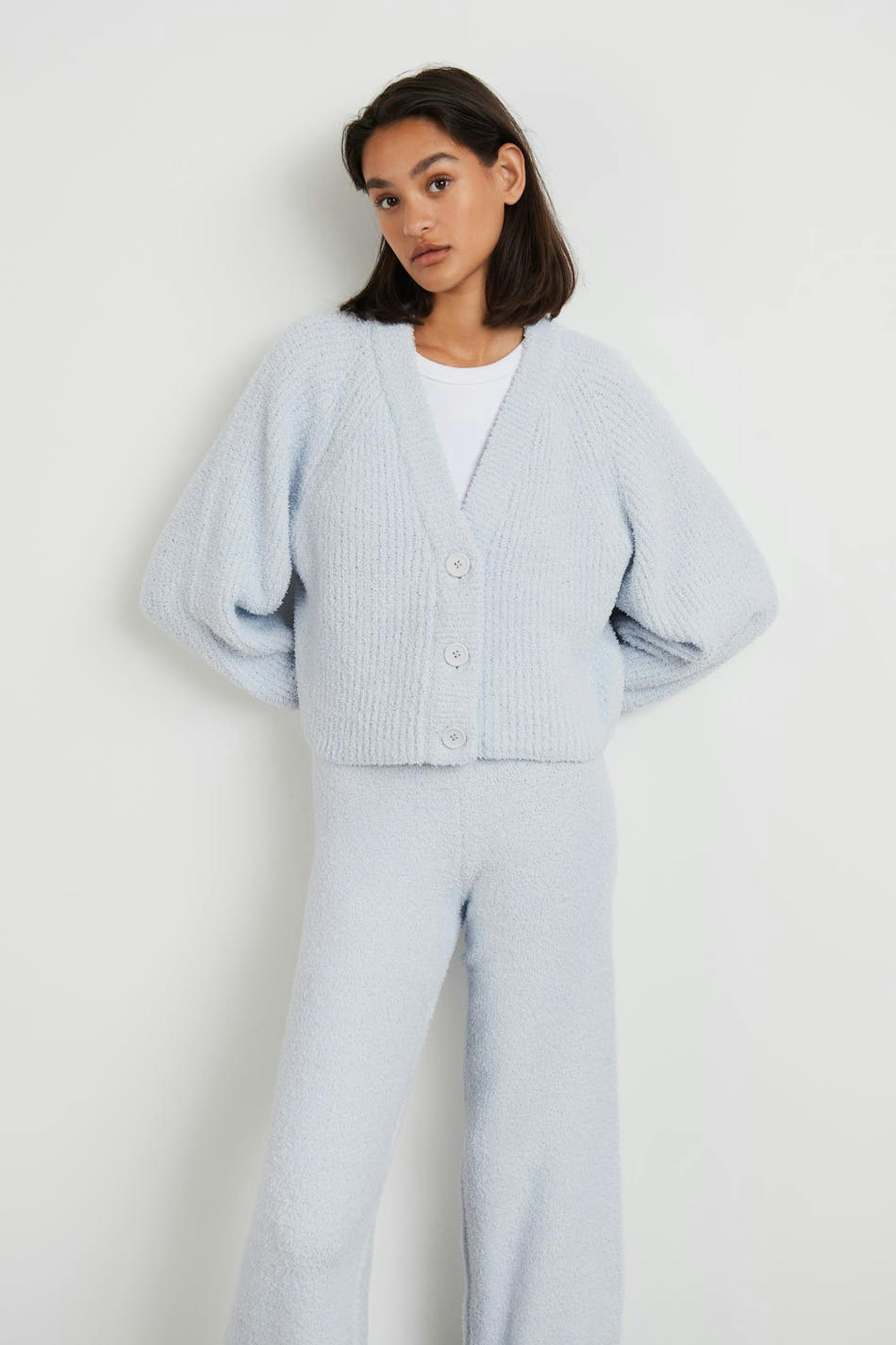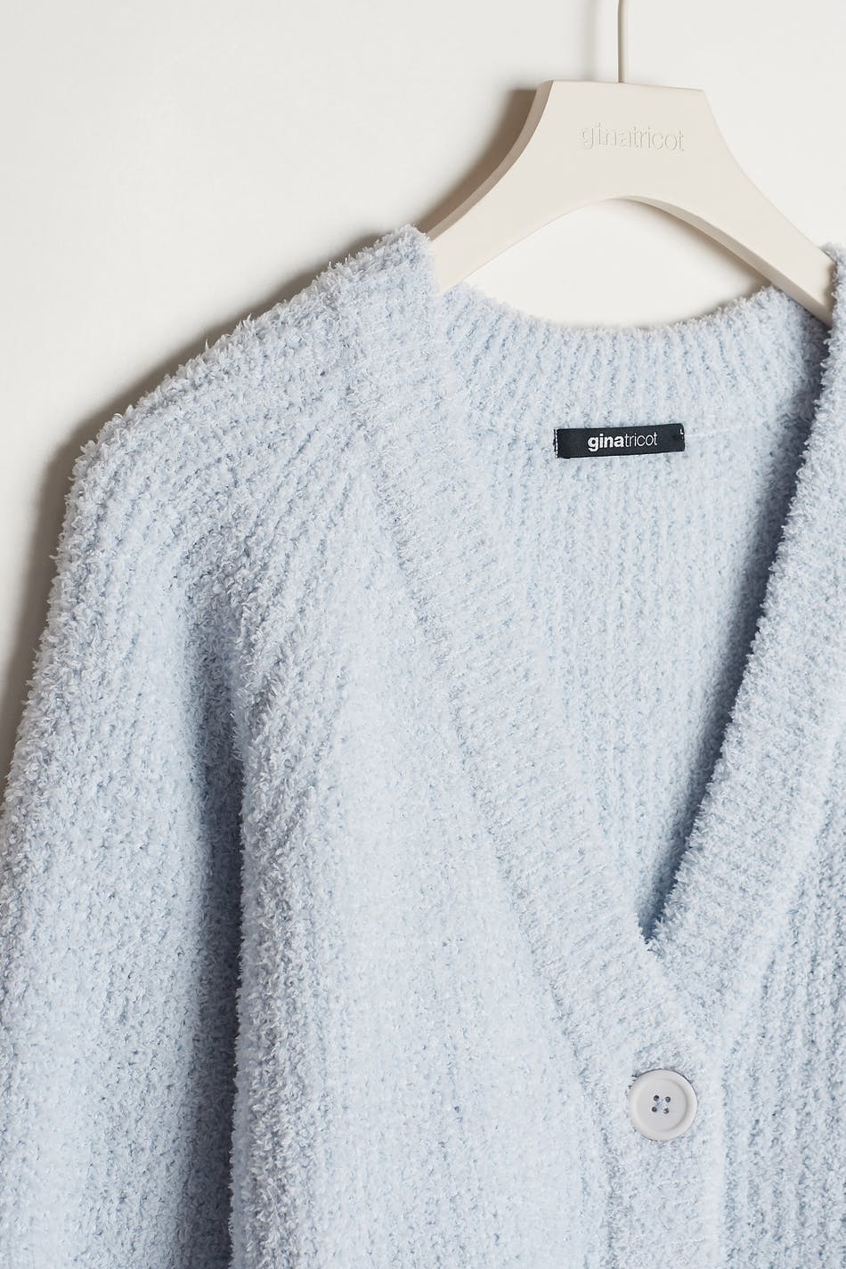 Gebreide sweater met v-hals. De sweater is blauw, met lange mouwen en afgesneden. Het heeft een sluitknoop aan de voorkant en een zachte en pluizige kwaliteit.
