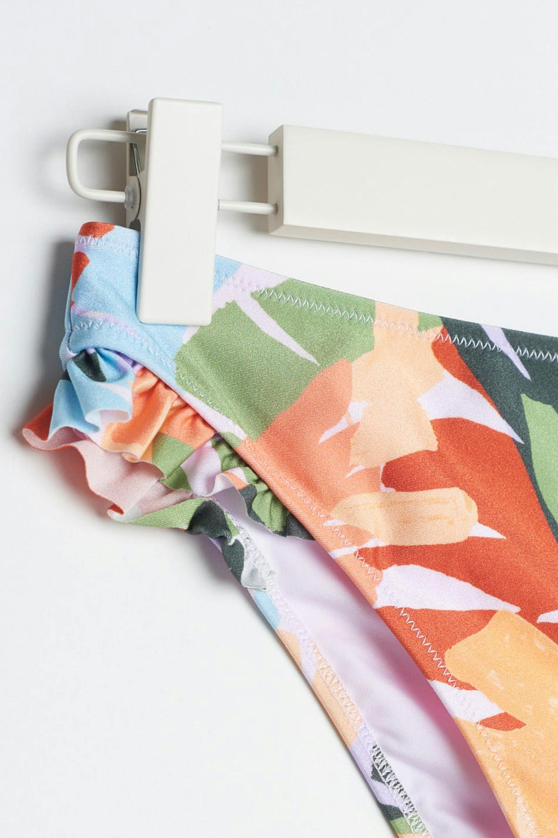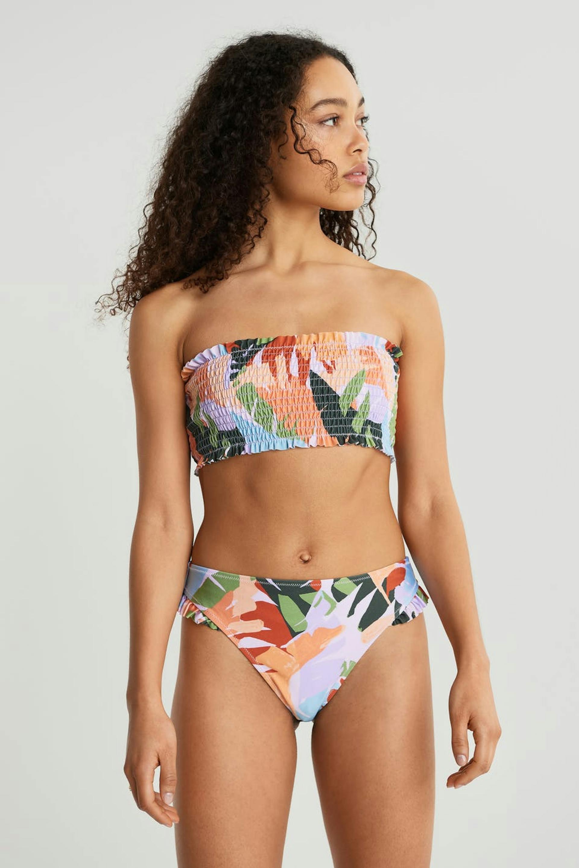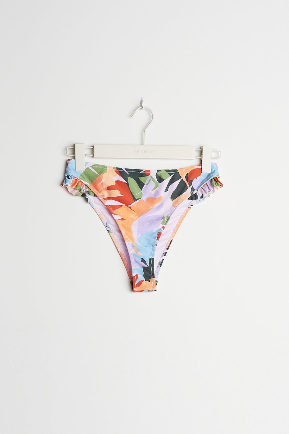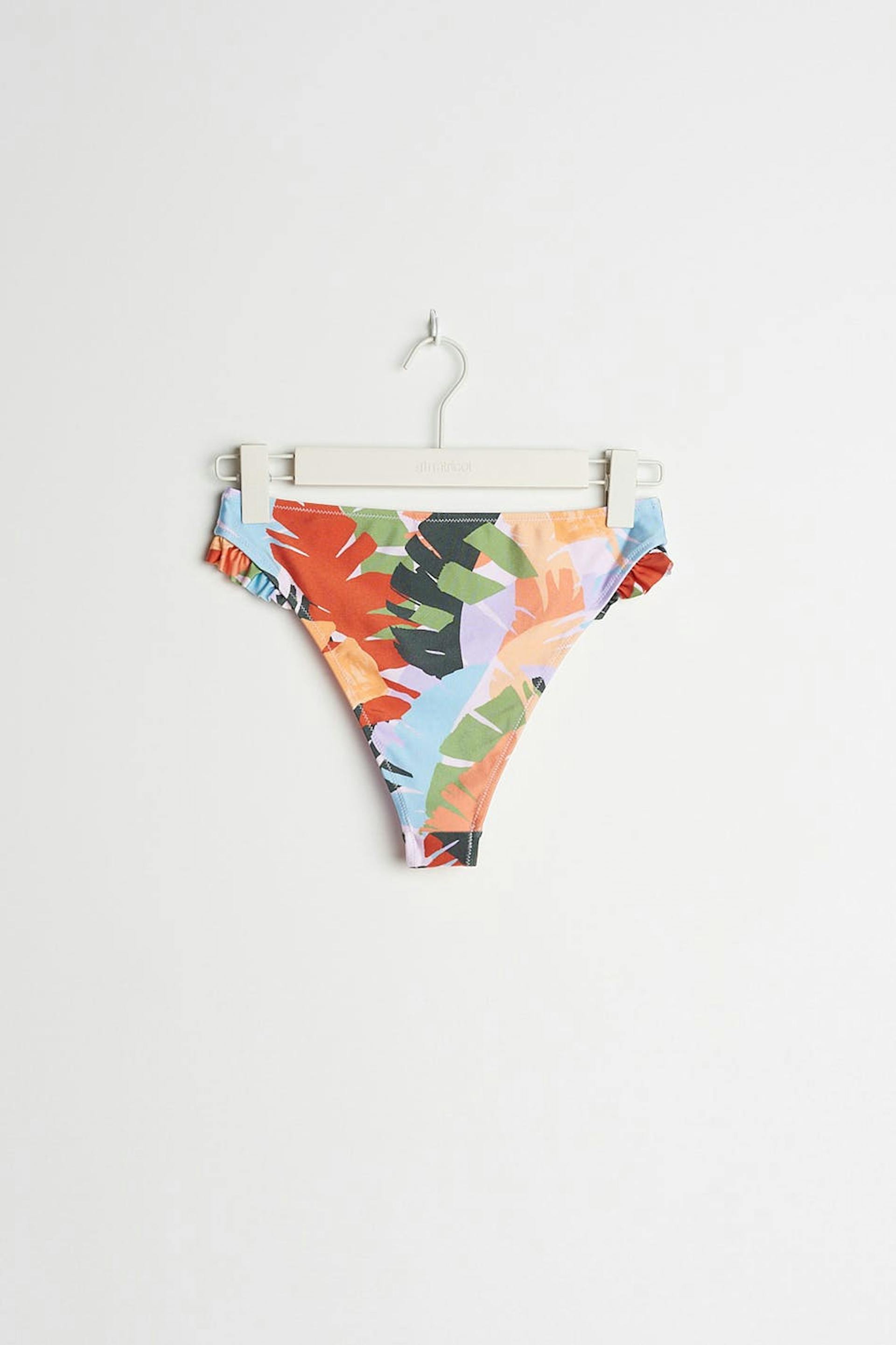 Bladpatroonvormige bikini broek met een hoge taille. De panty heeft een smalle ruche aan de zijkanten.