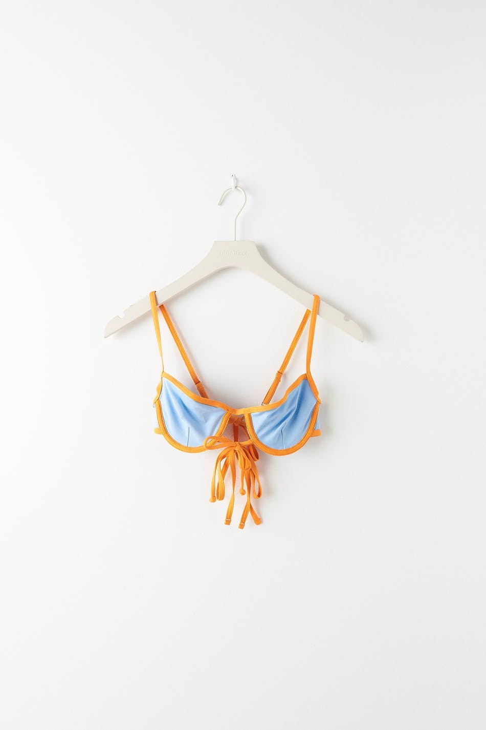 Bikini beha met gevoerde koppen. Het bikinitopje is blauw en heeft zelfbinder aan de voorkant. Het heeft dunne en aanpasbare schouderriemen en twee knoop details op de rug.