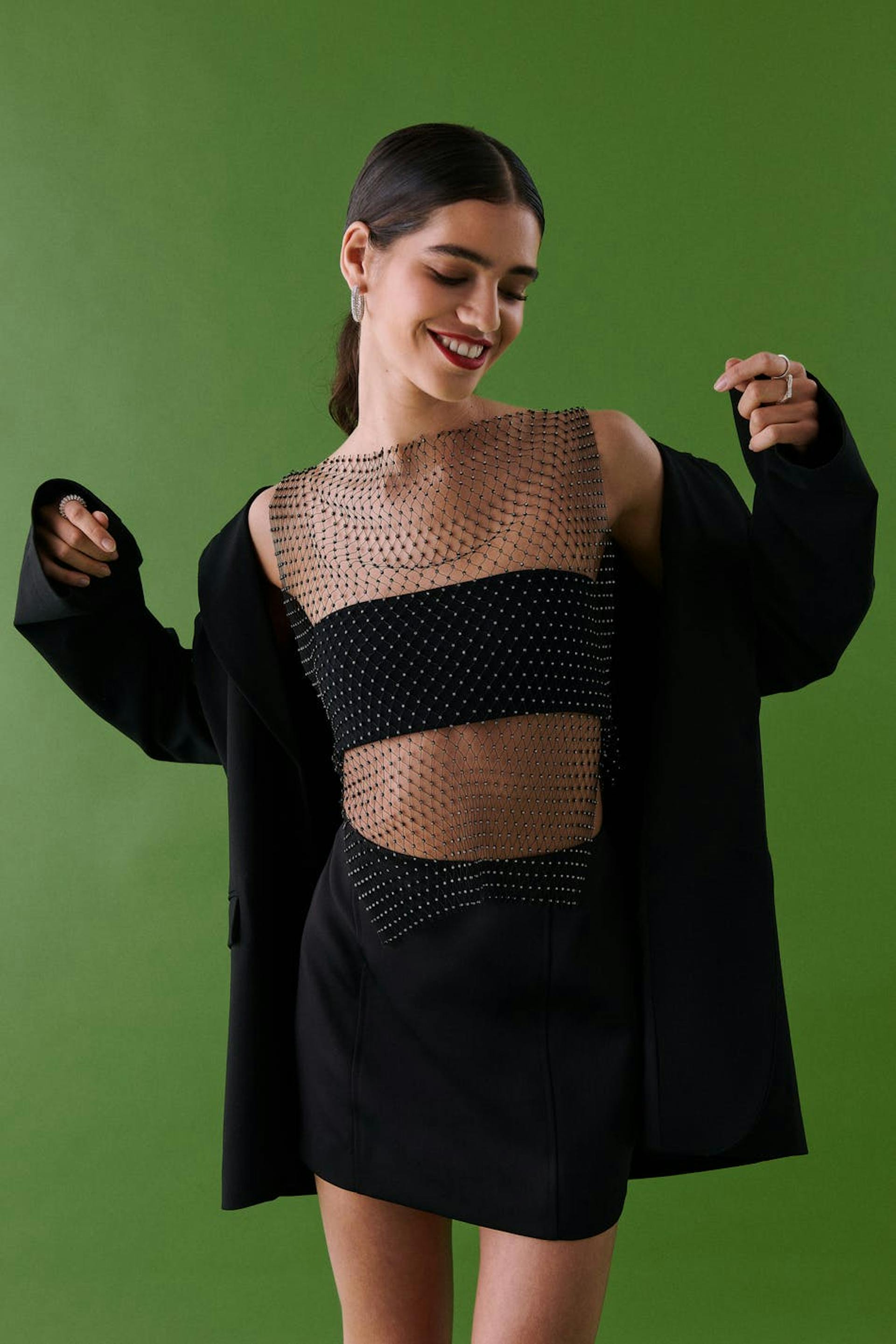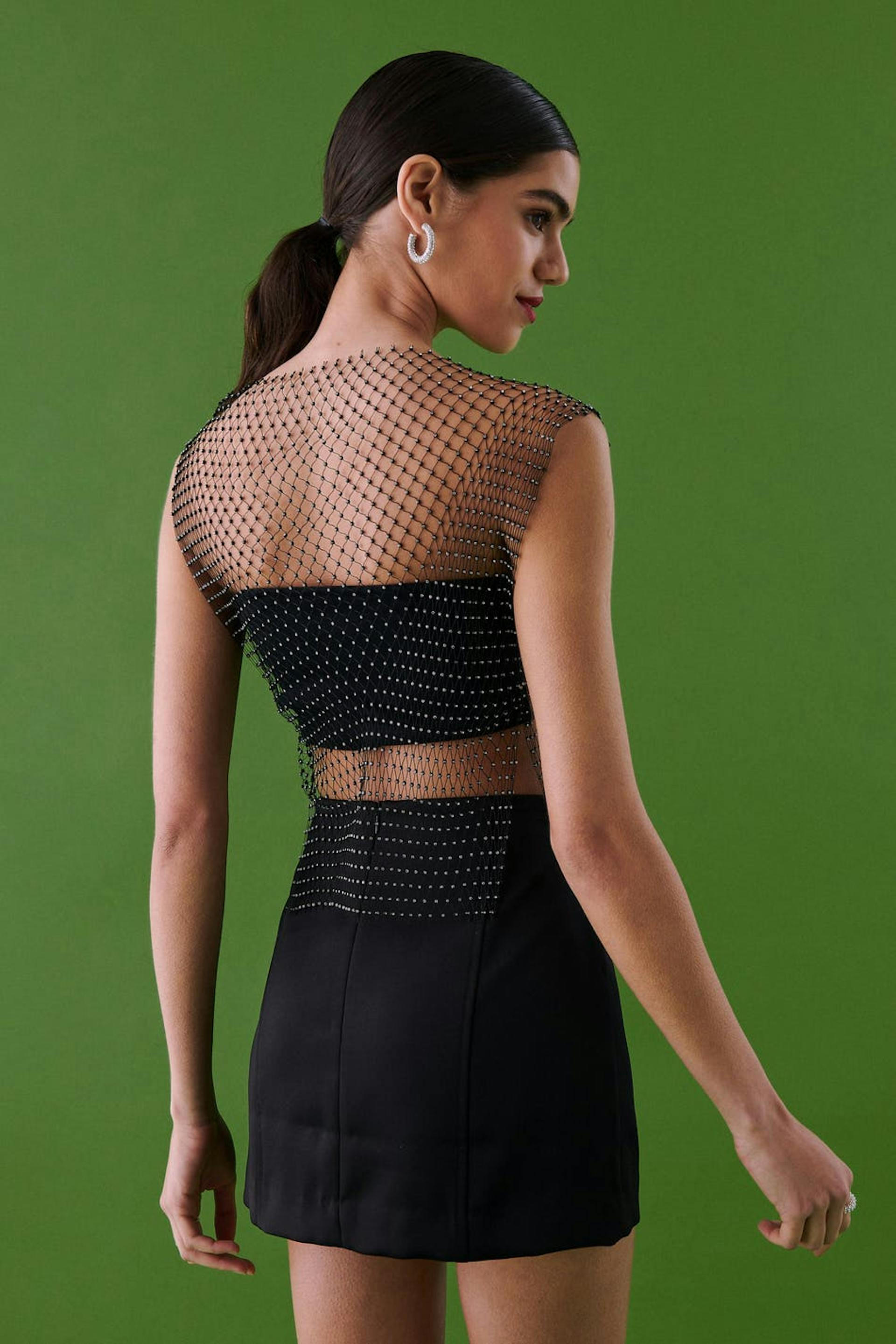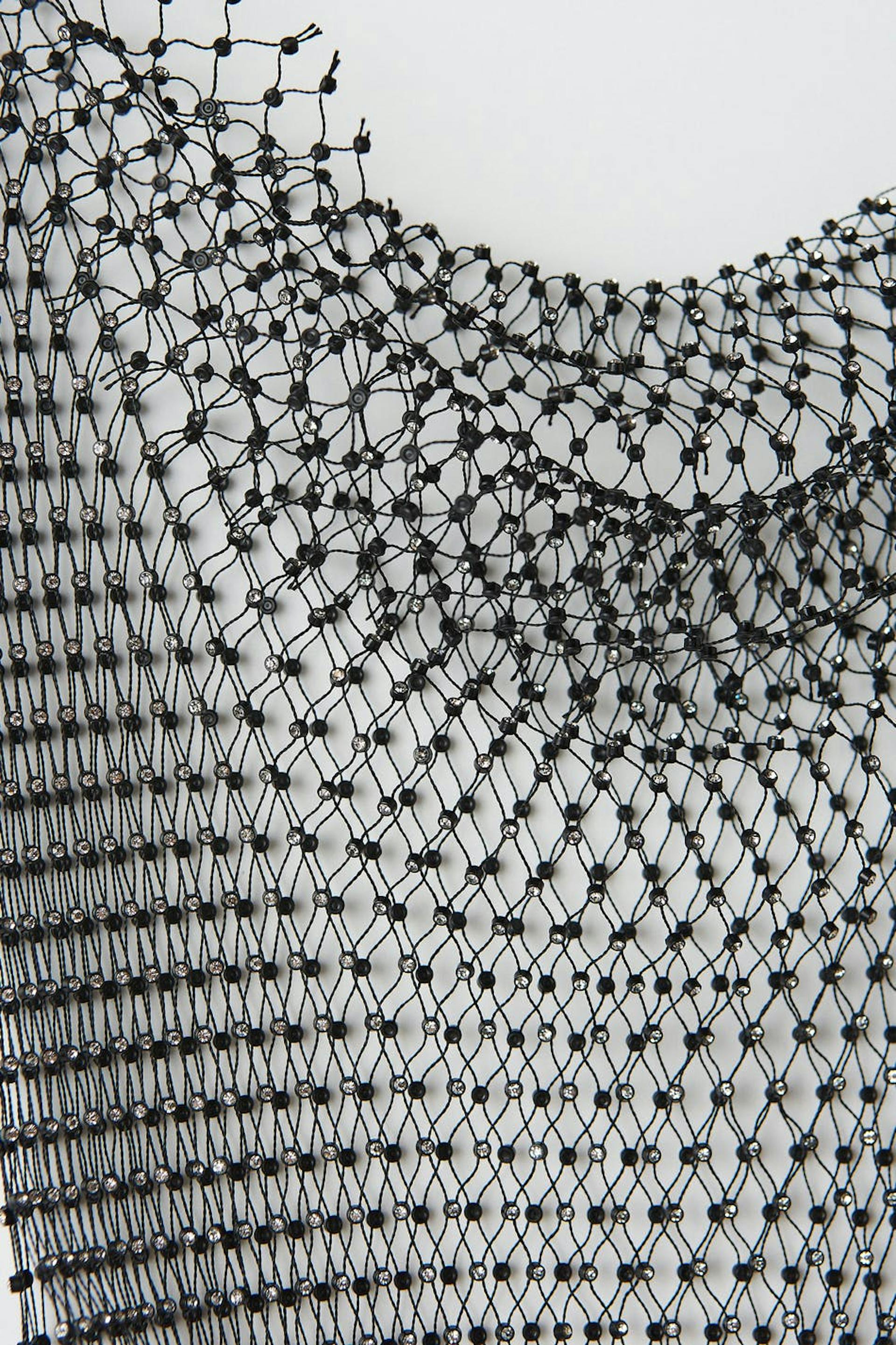 Elastisch topje van mesh. Het topje is zwart en heeft bergkristallen. Het heeft spleten aan de zijkanten.