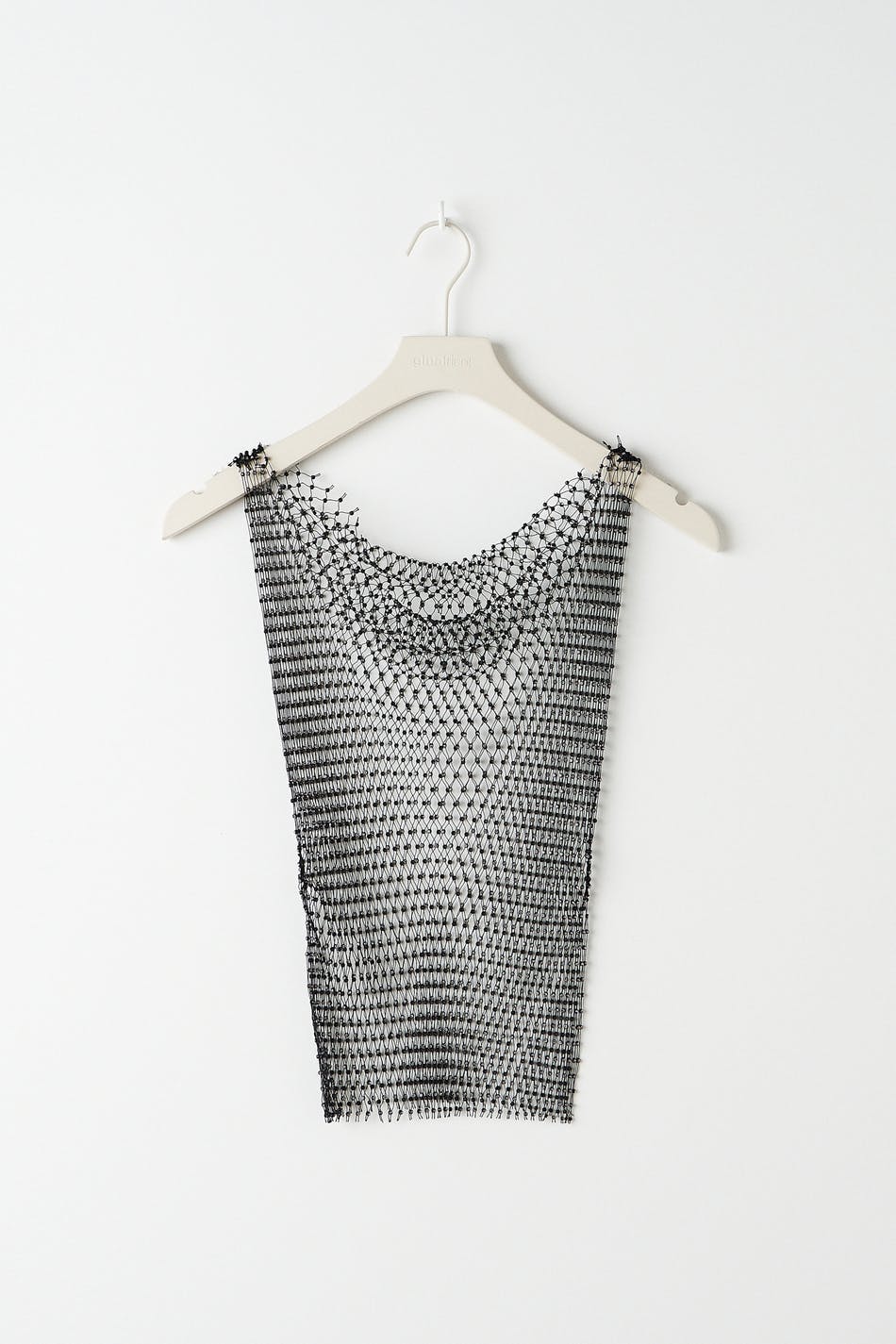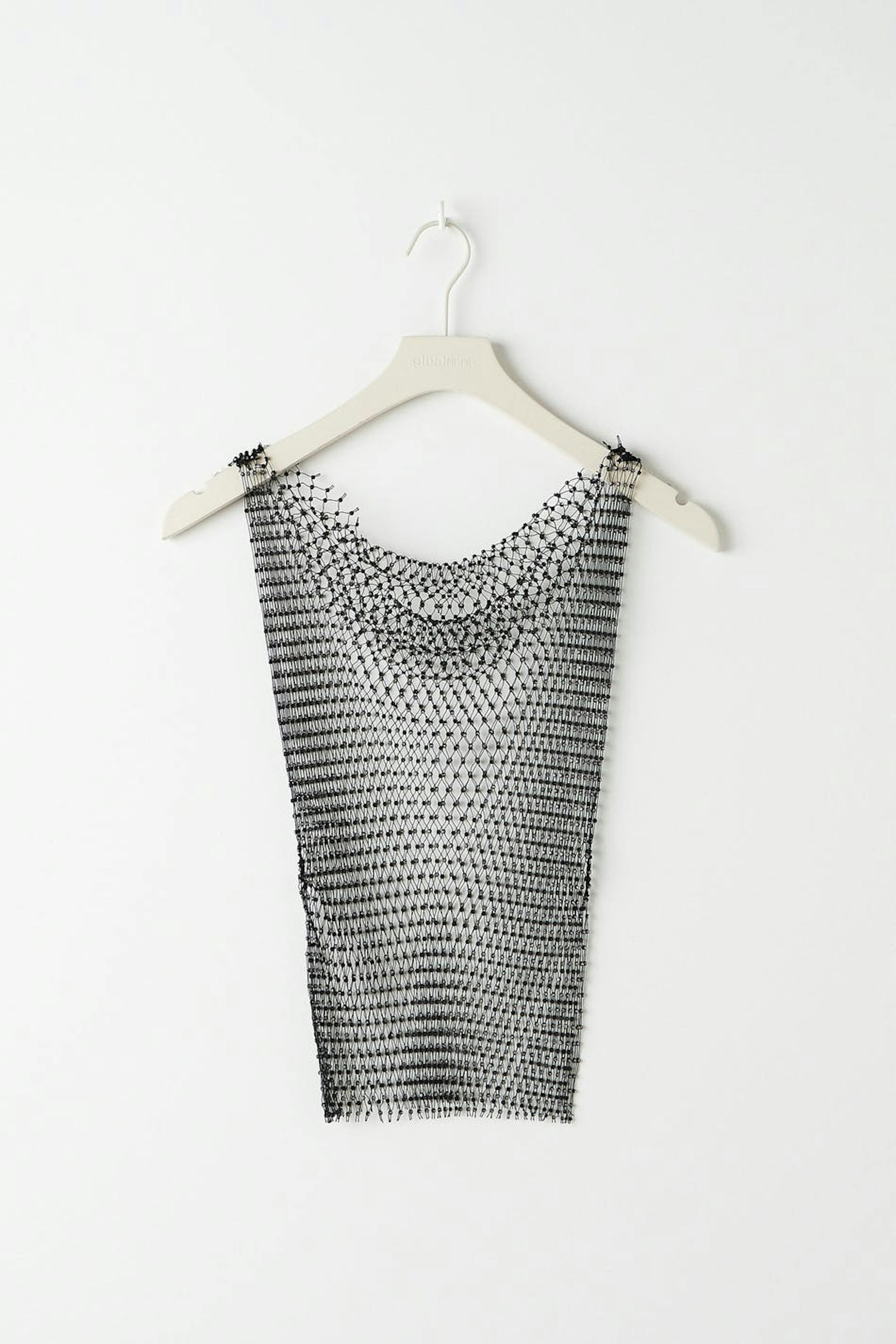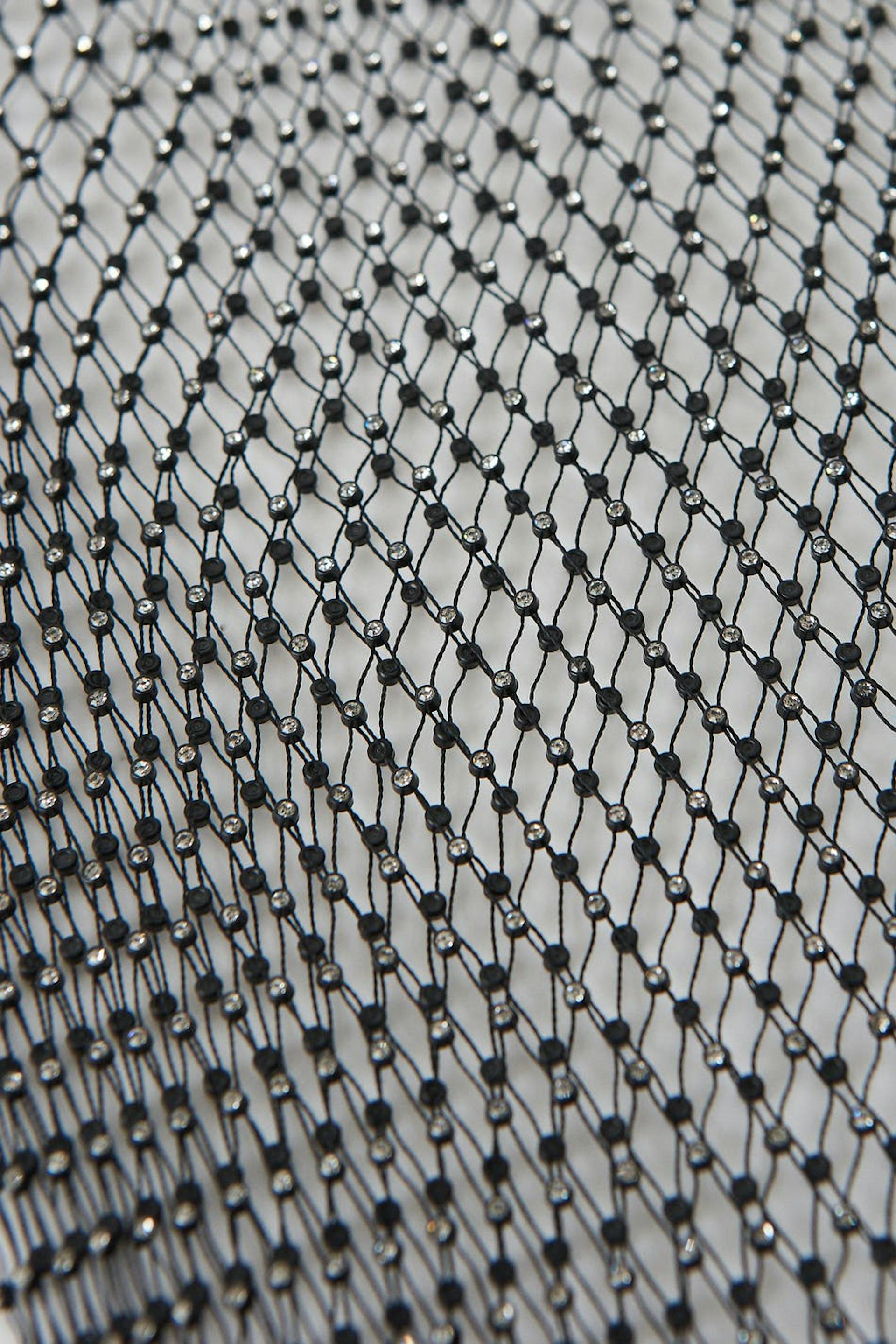 Elastisch topje van mesh. Het topje is zwart en heeft bergkristallen. Het heeft spleten aan de zijkanten.