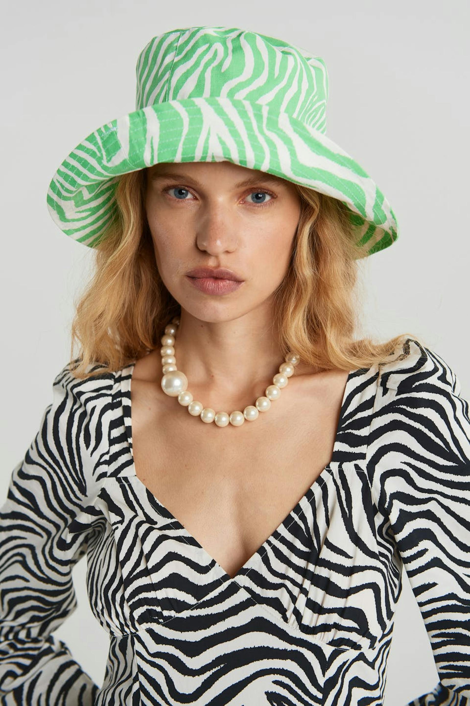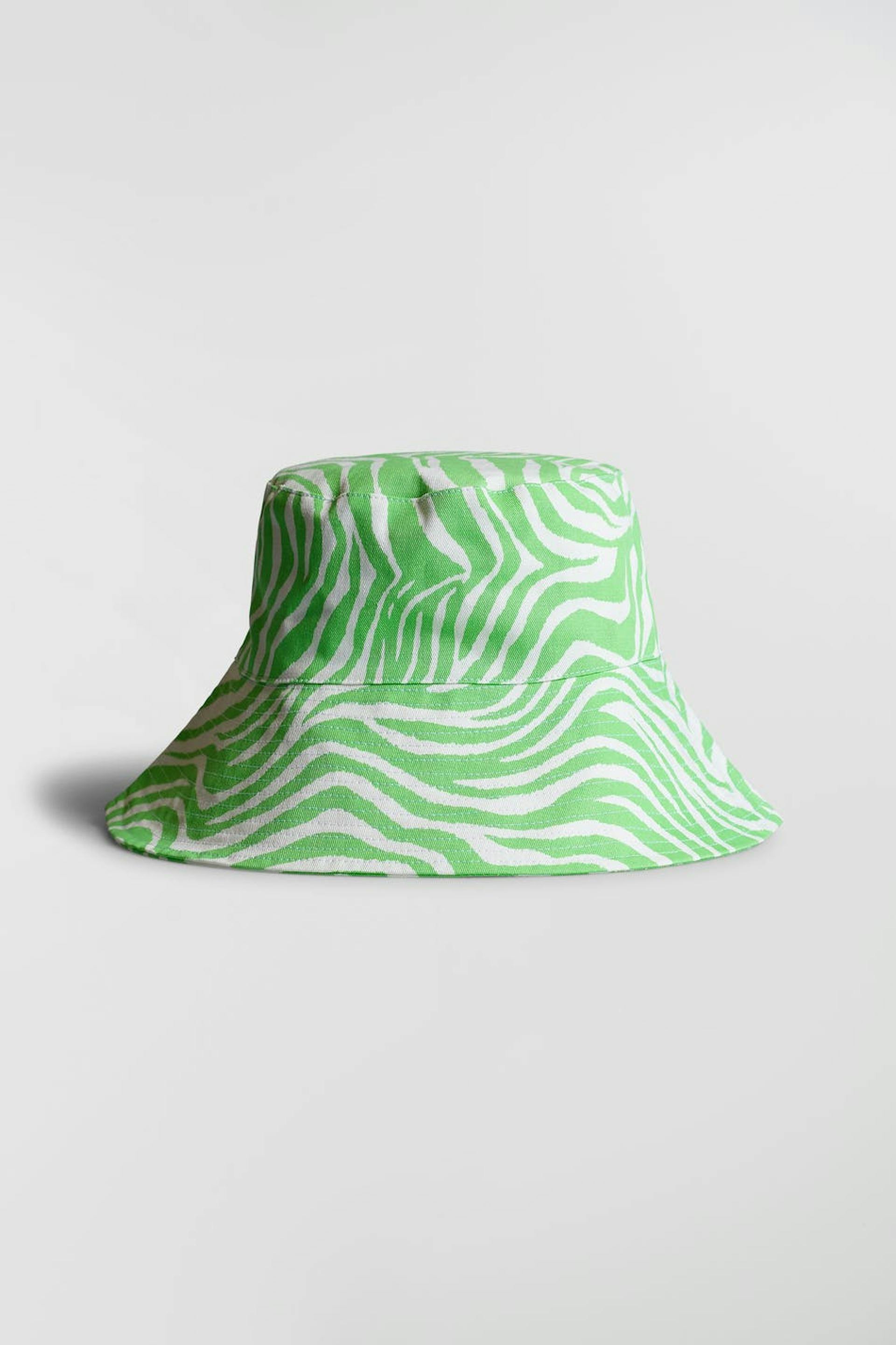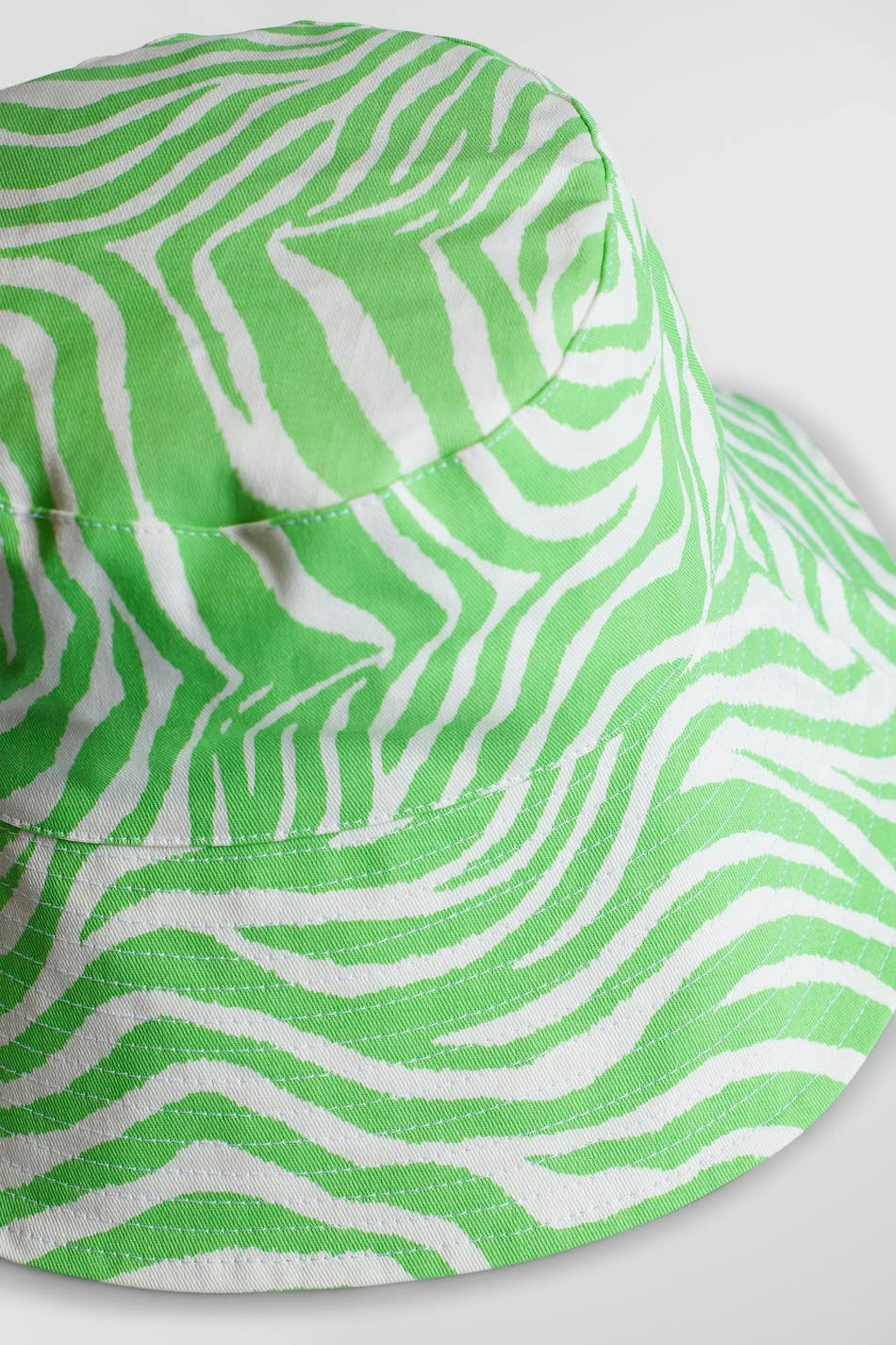 Ontworpen door Emili Sindlev. Bucket hat met een zebramotief. De bucket hat is groen en wit.