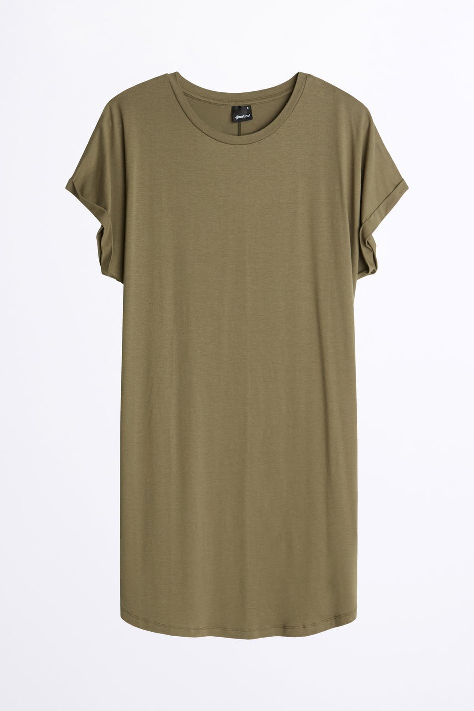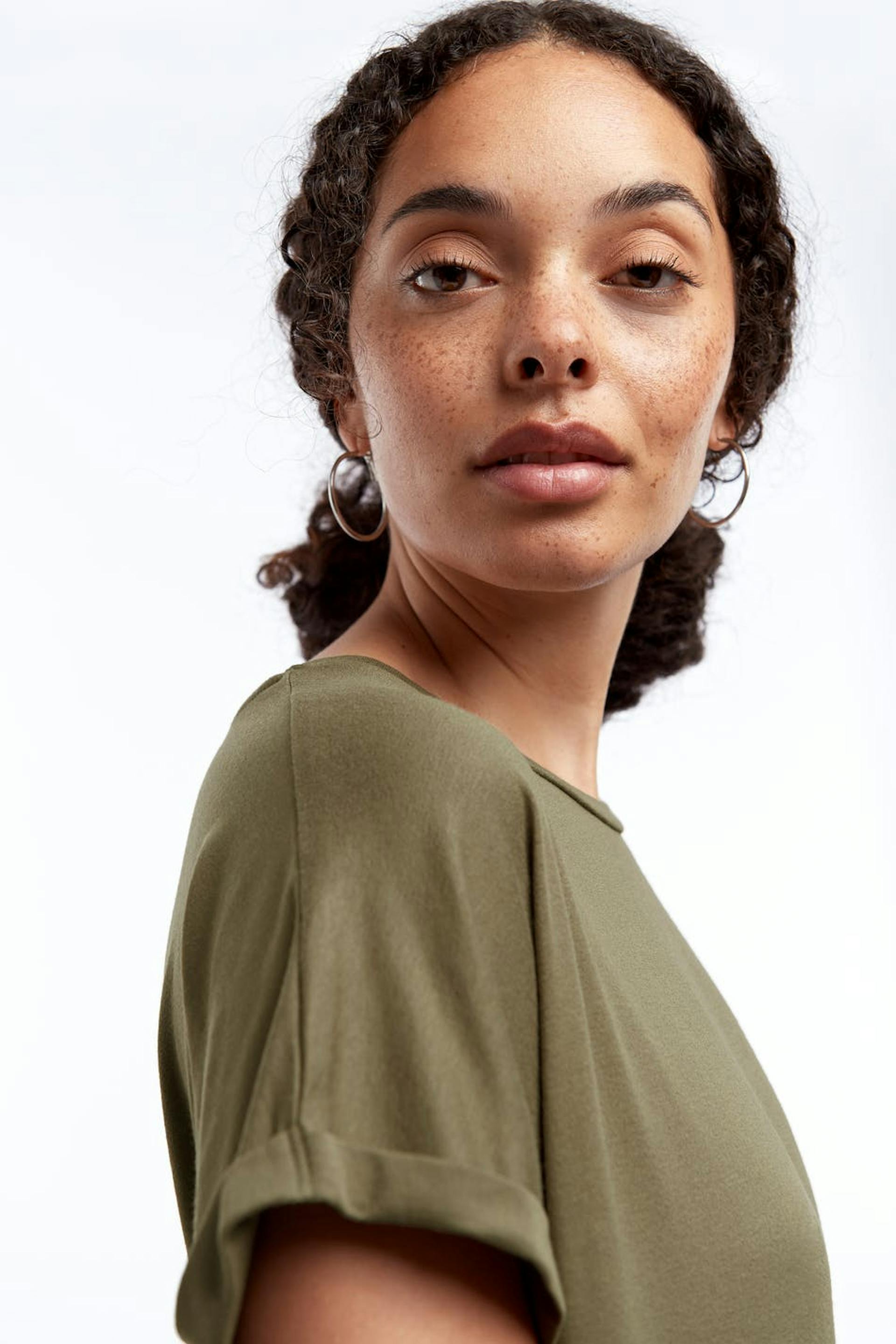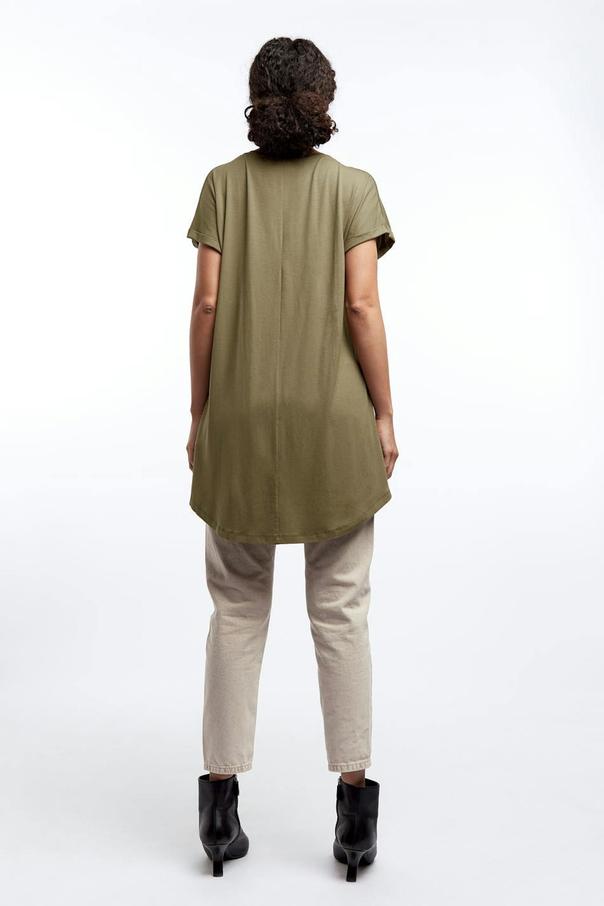 Tuniek met korte mouwen en een normale pasvorm. De tuniek is groen en heeft opgerolde mouw aan de uiteinden van de mouwen.