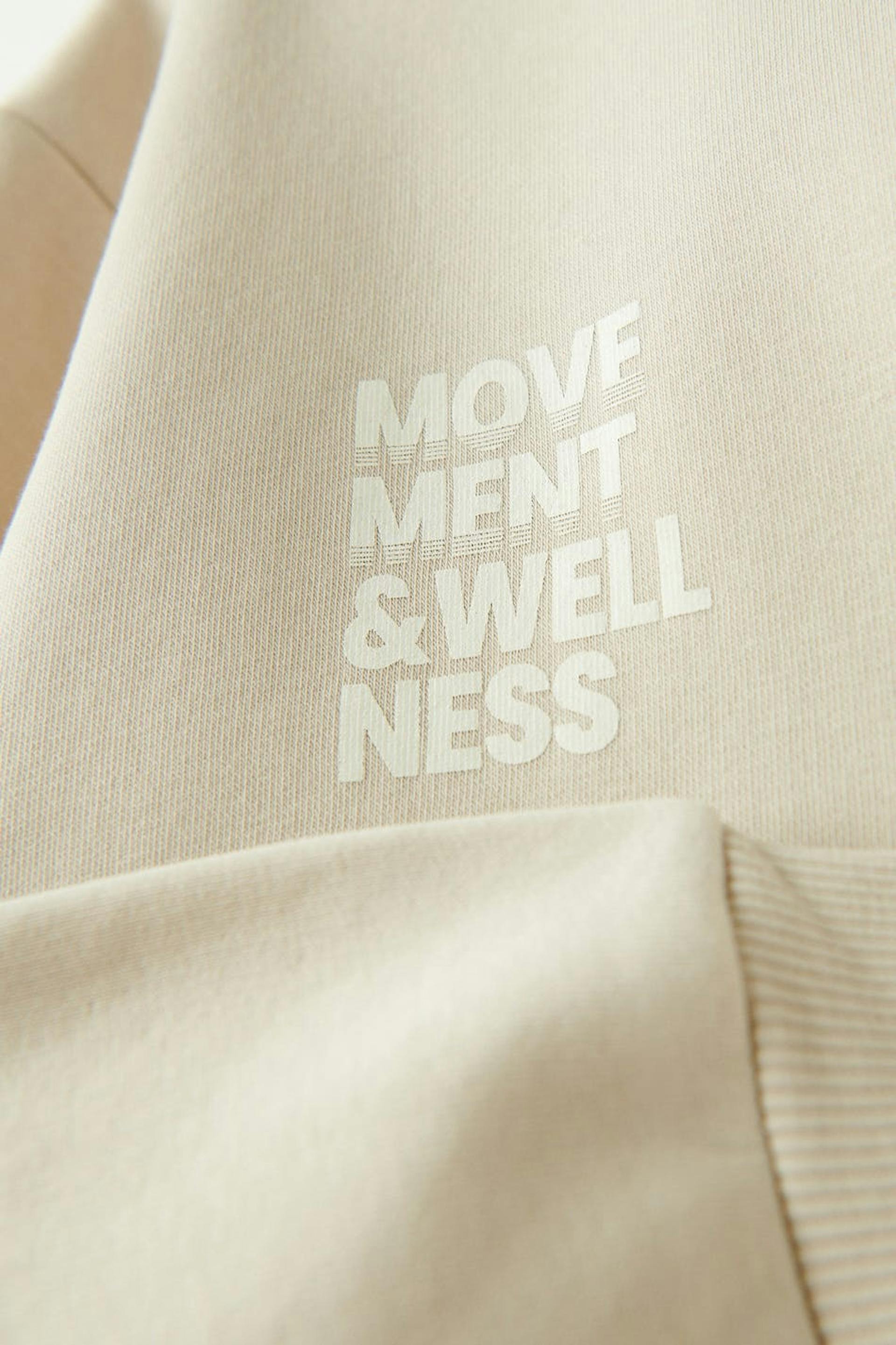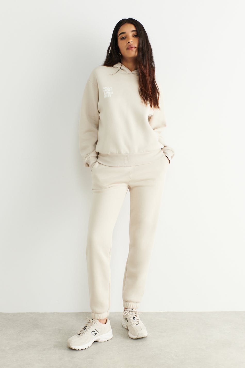 Oversized hoodie met hangende schouders. De hoodie is beige en heeft een gevoerde capuchon. Het heeft een geribbelde manchet aan de onderkant en aan de uiteinden van de mouwen.