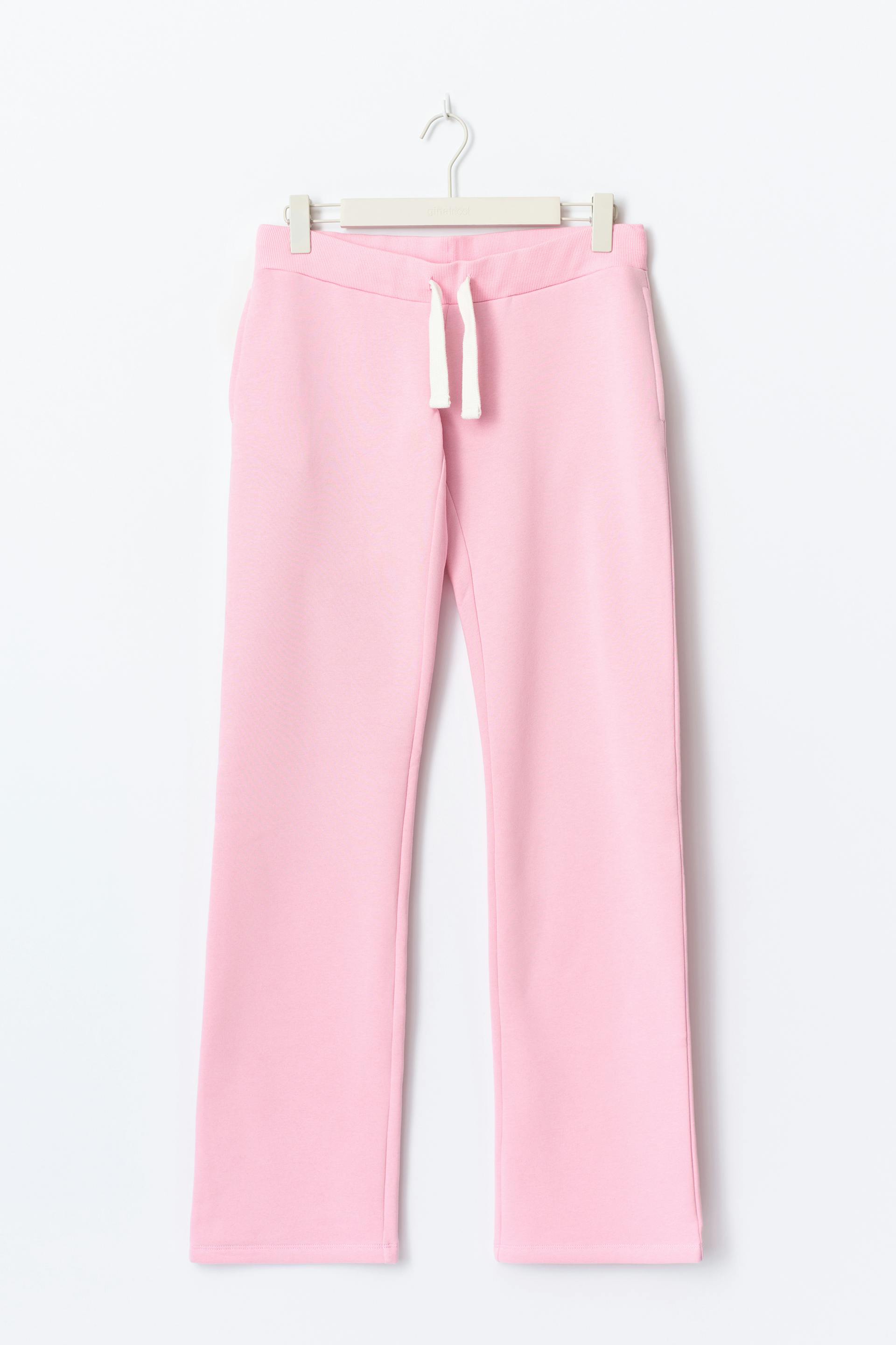 Sweatpants met brede benen. De sweatpants zijn roze en hebben een lage taille. Het heeft een trekkoord aan de taille, zakken achter en een normale pasvorm.