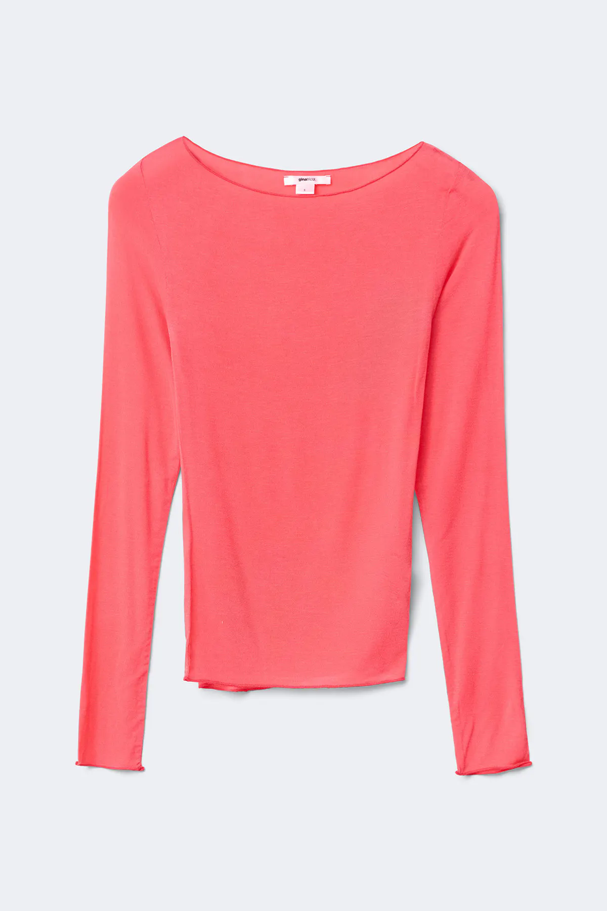 Topje met lange mouwen met boot halslijn. Het topje is koraalkleurig en heeft nauwsluitende pasvorm. Het heeft zacht materiaal.