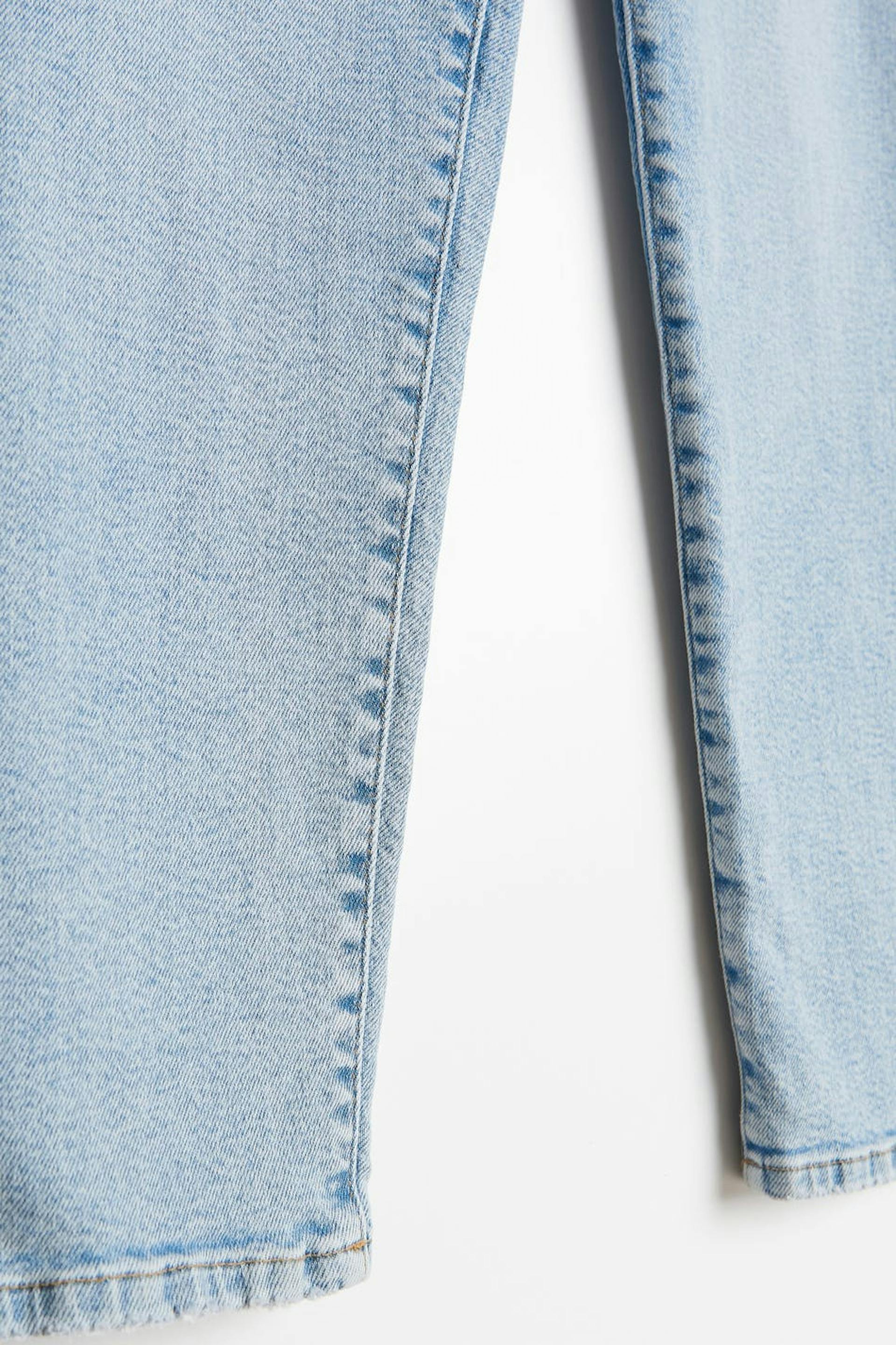 Mom-jeans van uit ons Young-assortiment met hoge taille van stretch denim. De spijkerbroek is licht blauw en heeft een slanke pasvorm. Het heeft tapse benen met enkel lengte, gulp, verstelbare elastiek aan de taille en zakken aan de voor- en achterzijde.