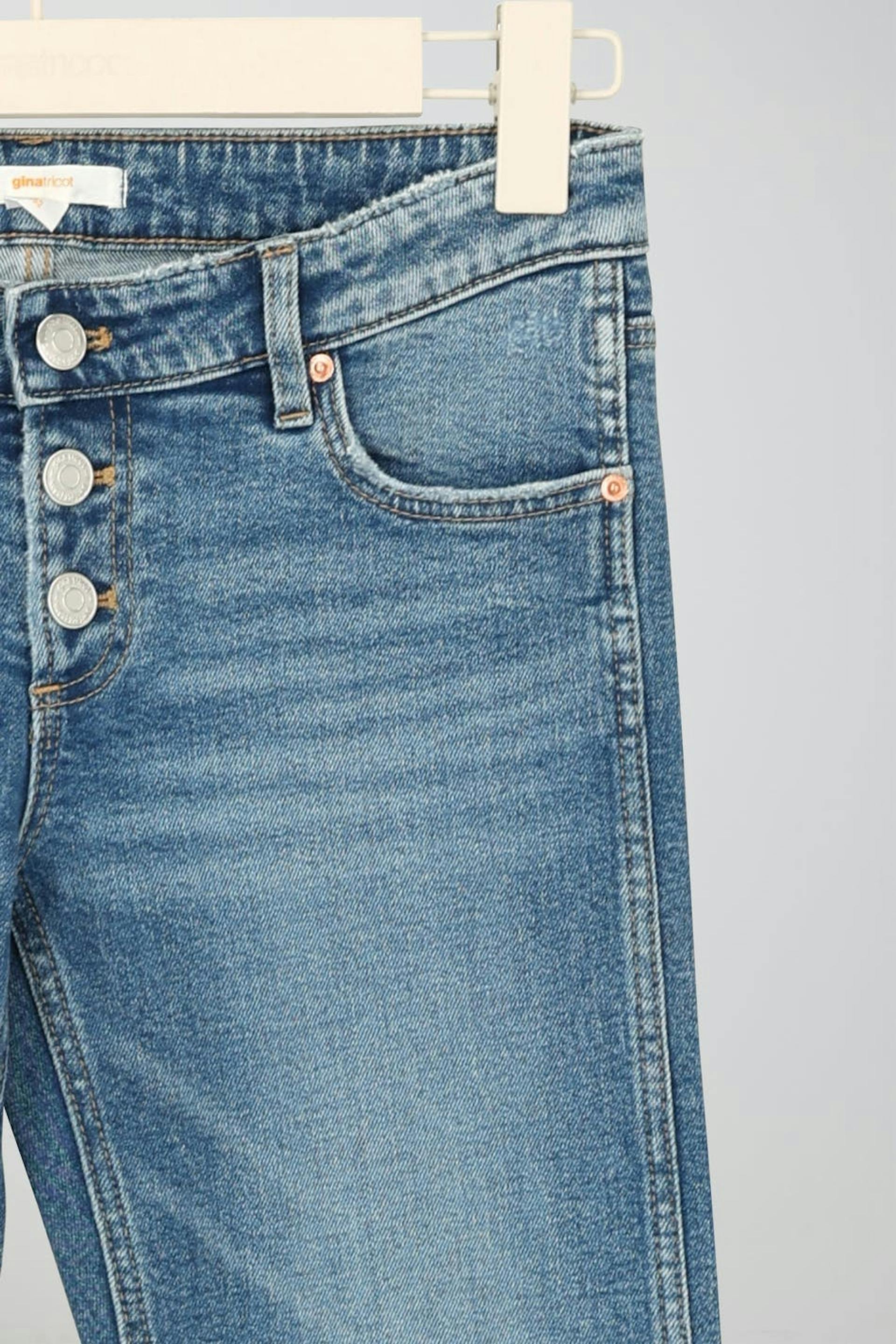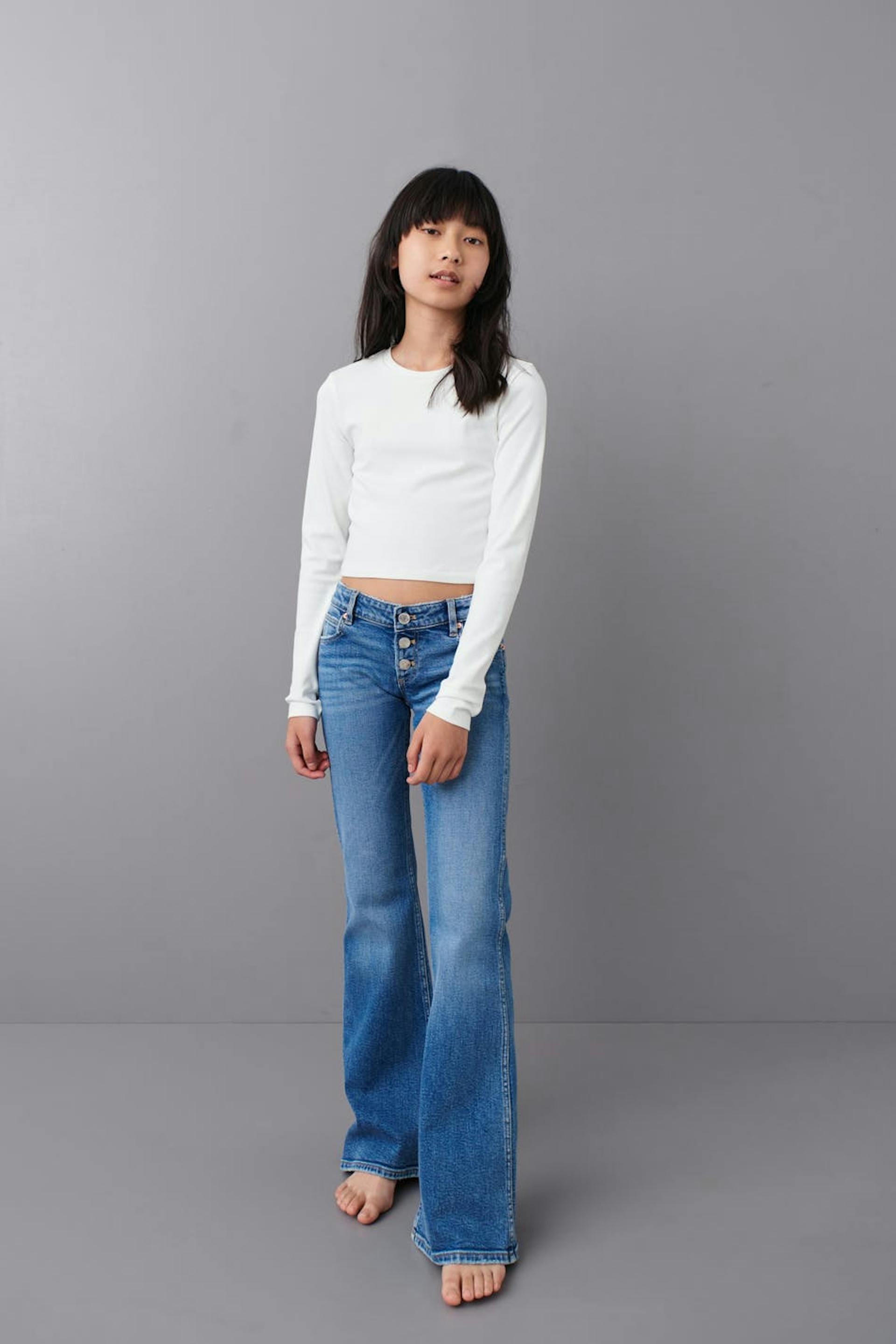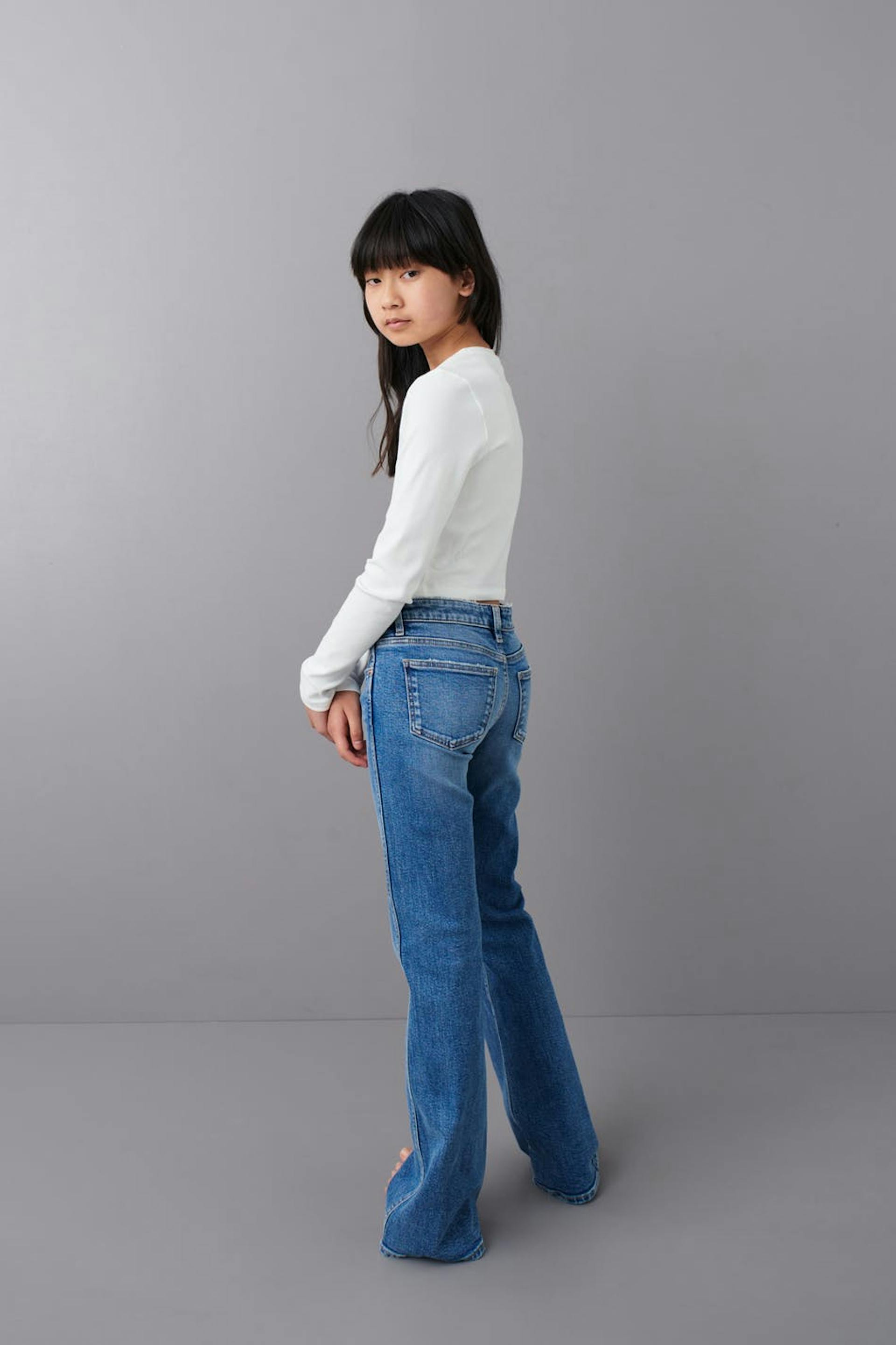 Op de jaren 70 geïnspireerde spijkerbroek van Gina Tricot Young met lage taille. De spijkerbroek is blauw en heeft onafgewerkte randen met volledige lengte. Het heeft lage stretch, knoopsluiting, verstelbare elastiek aan de taille en zakken aan de voor- en achterzijde.