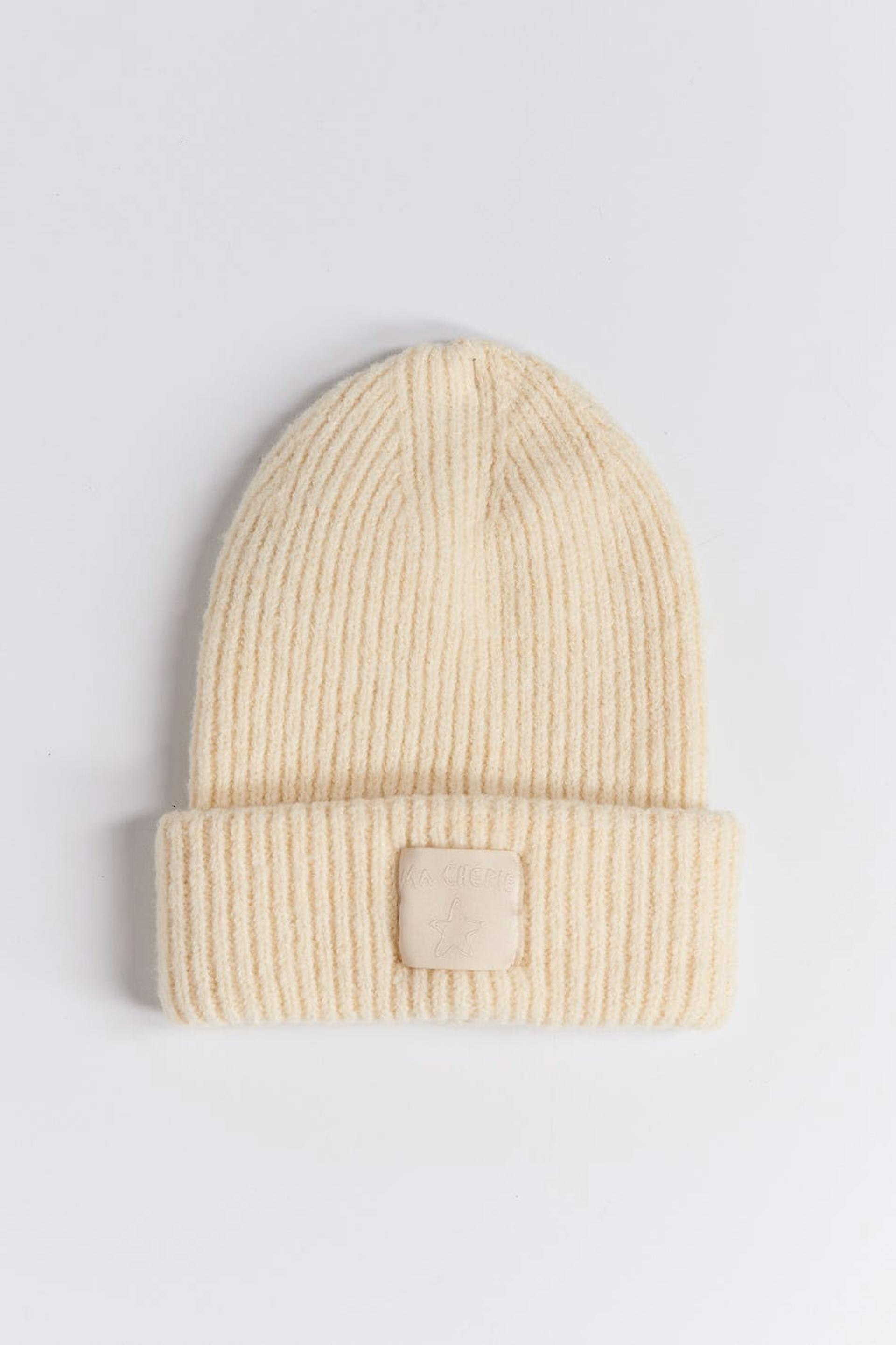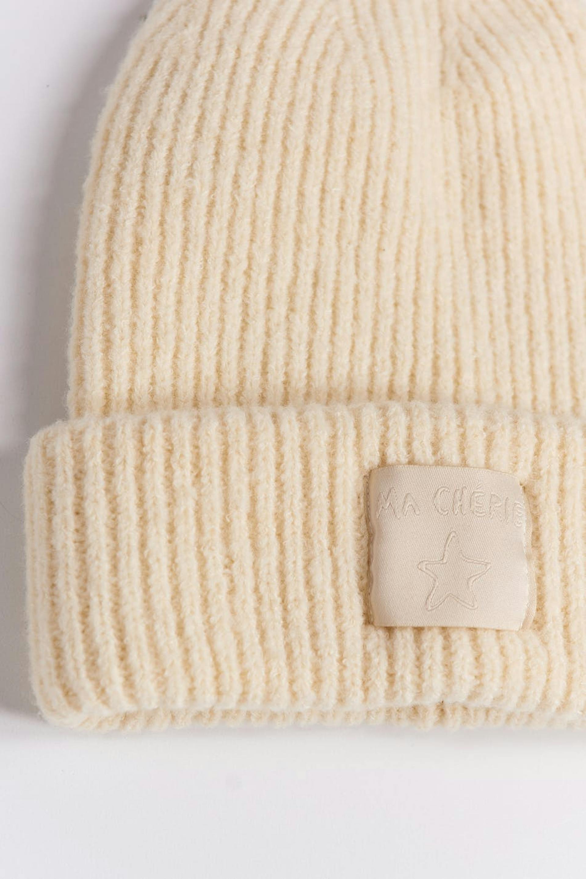 Ribgebreide muts van Gina Tricot Young met gevouwen rand. De muts is beige en heeft lap aan de voorkant.