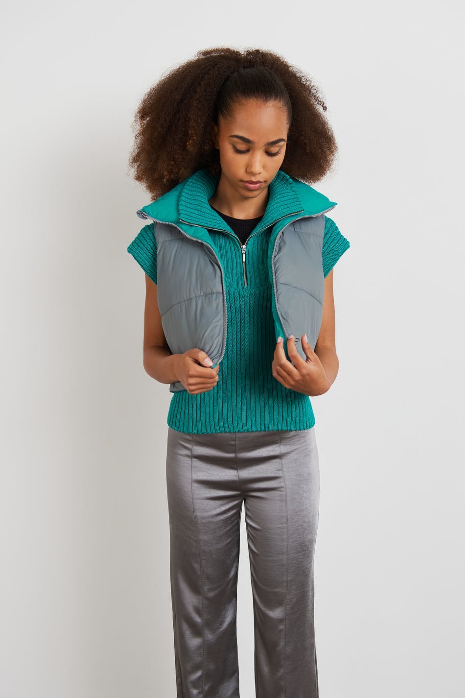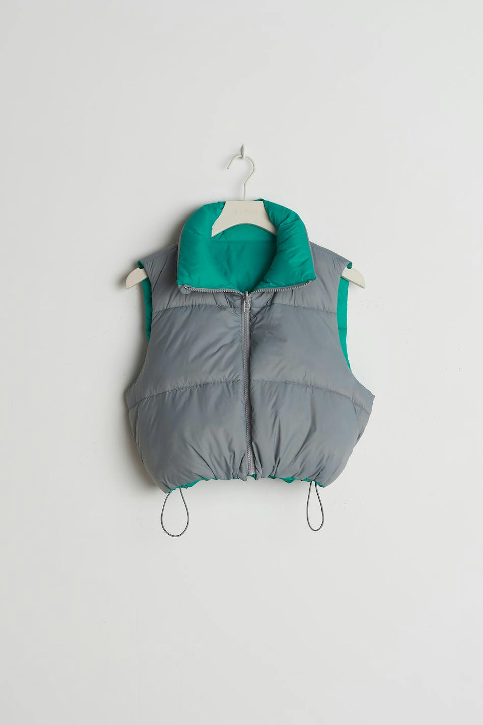 Puffer vest van uit ons Young-assortiment met een boxy pasvorm. Het vest is grijs, groen en omkeerbaar. Het heeft een hoge hals, een afgesneden lengte, sluiting met een rits aan de voorkant en een verstelbaar trekkoord in de onderste zoom.
