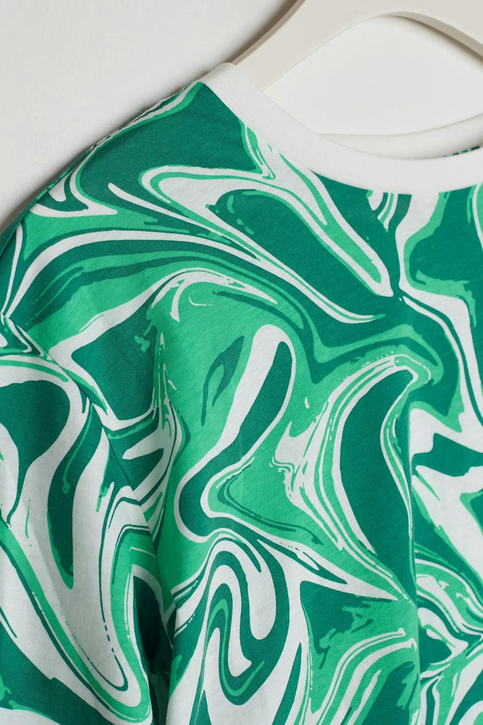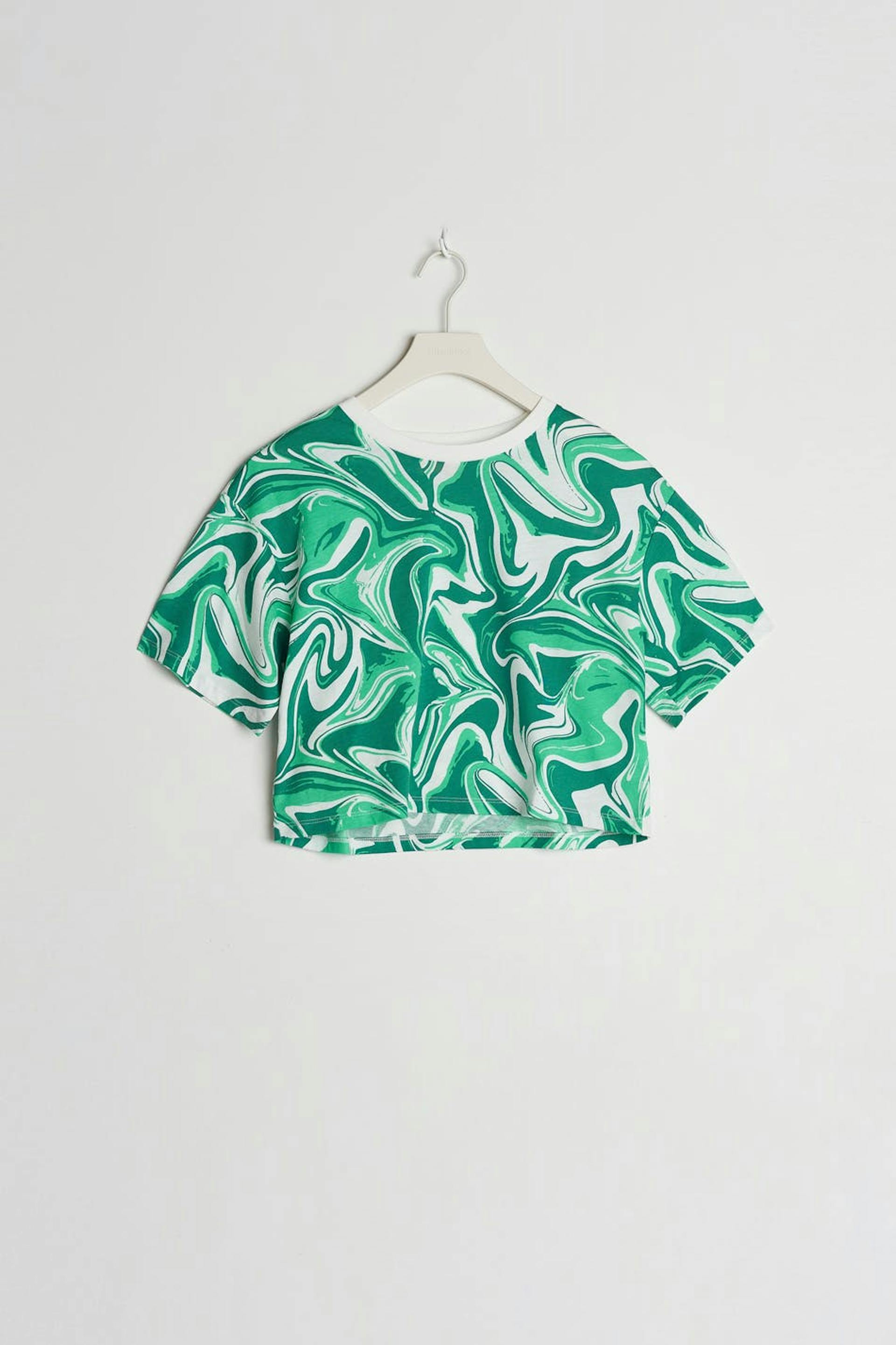 T-shirt met korte mouwen met een overmaatse pasvorm. Het t-shirt is groen en heeft een decoratief patroon. Het heeft een afgesneden lengte en een ronde halslijn.