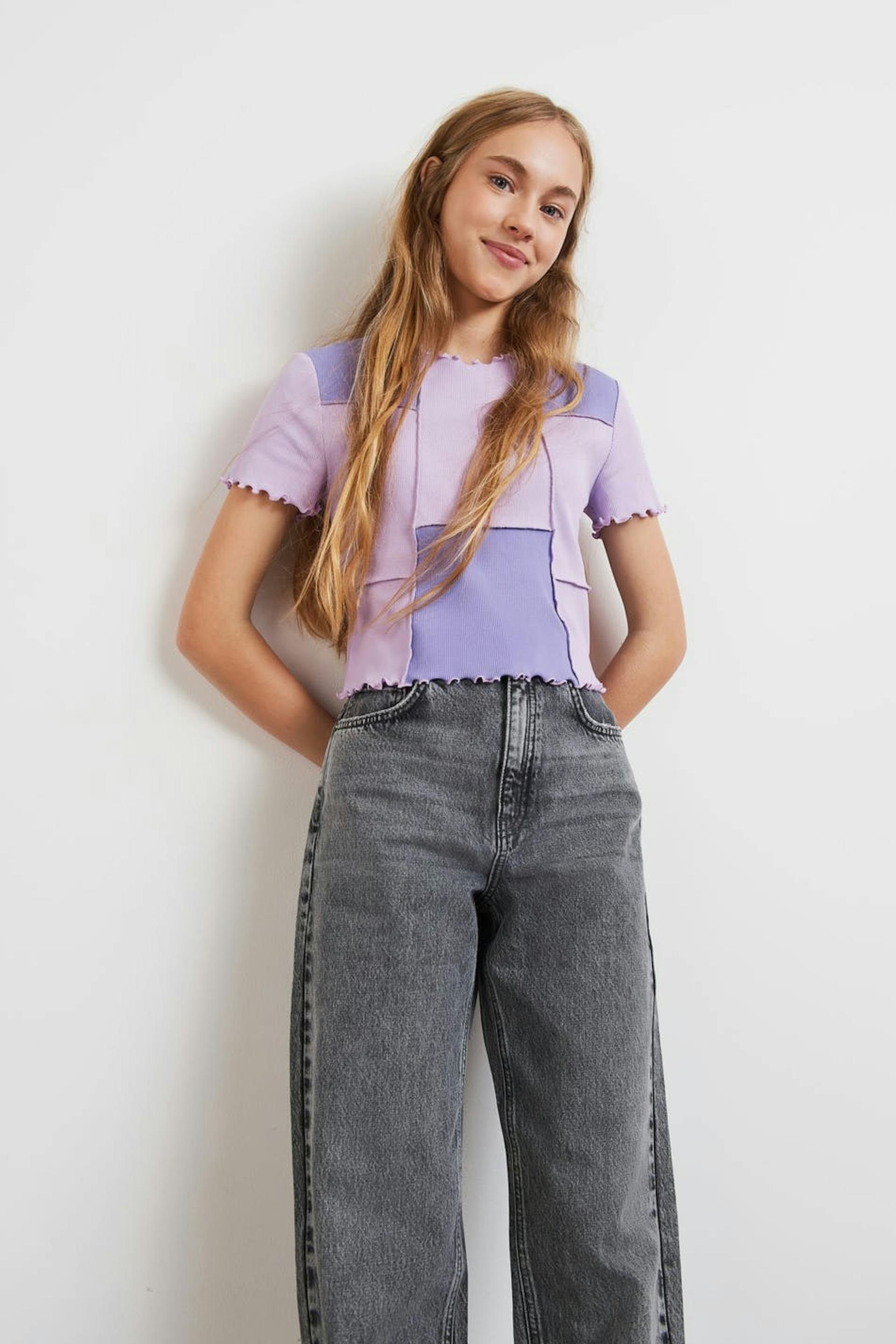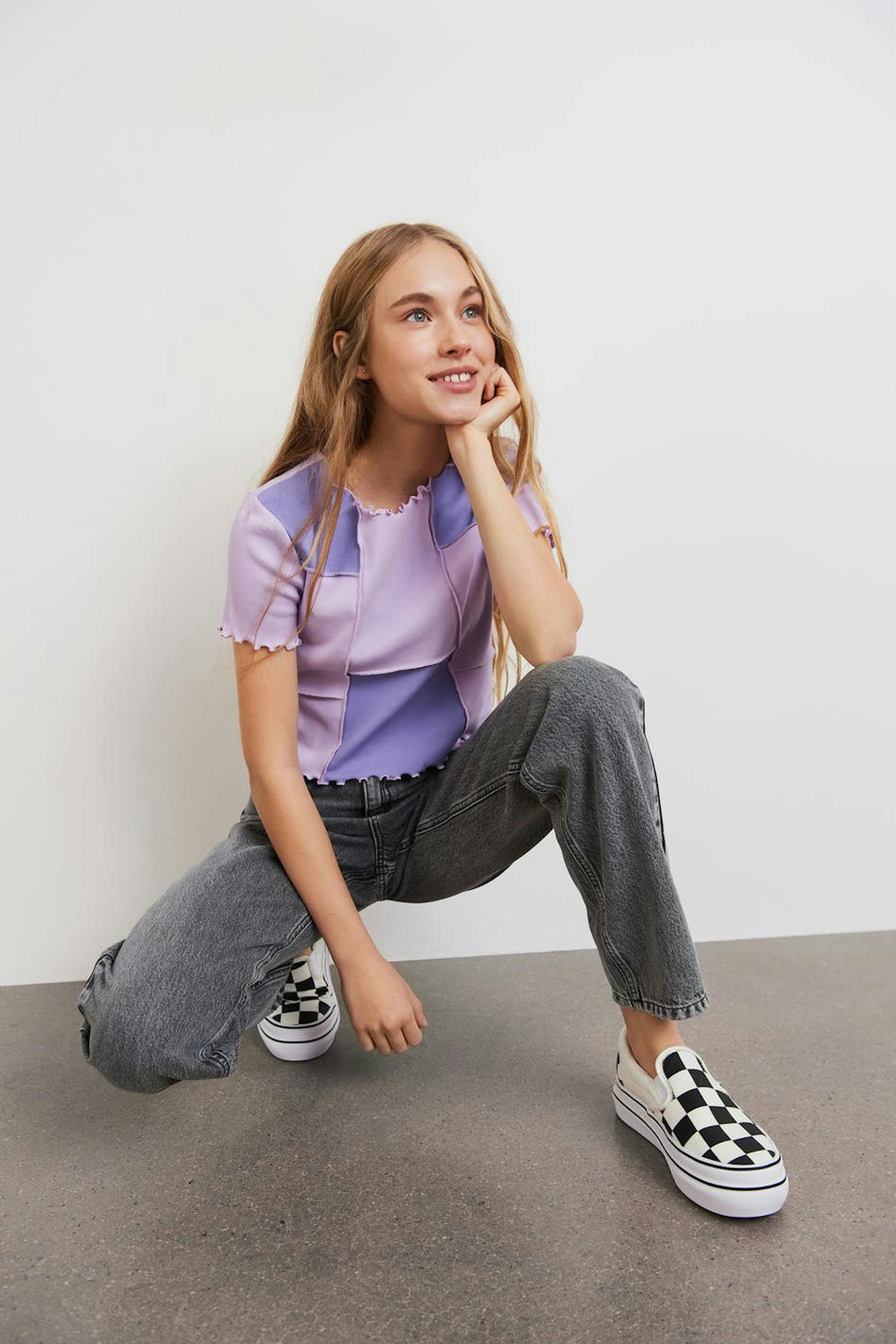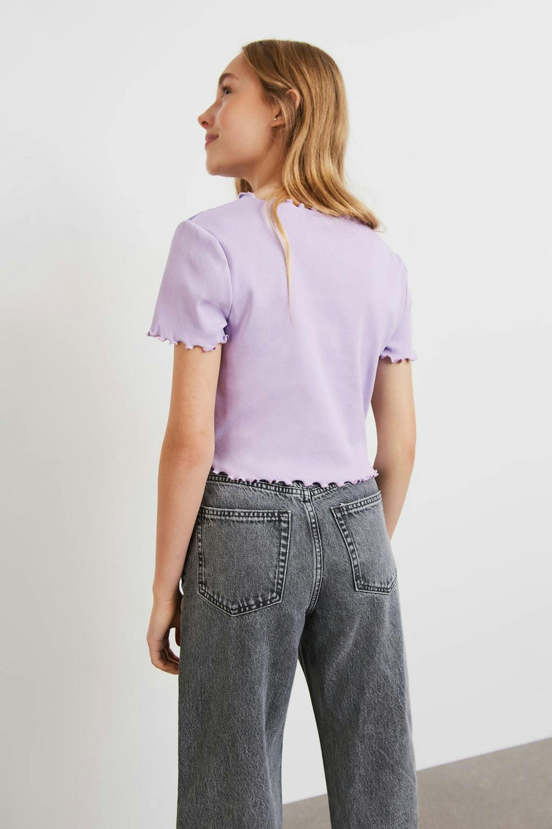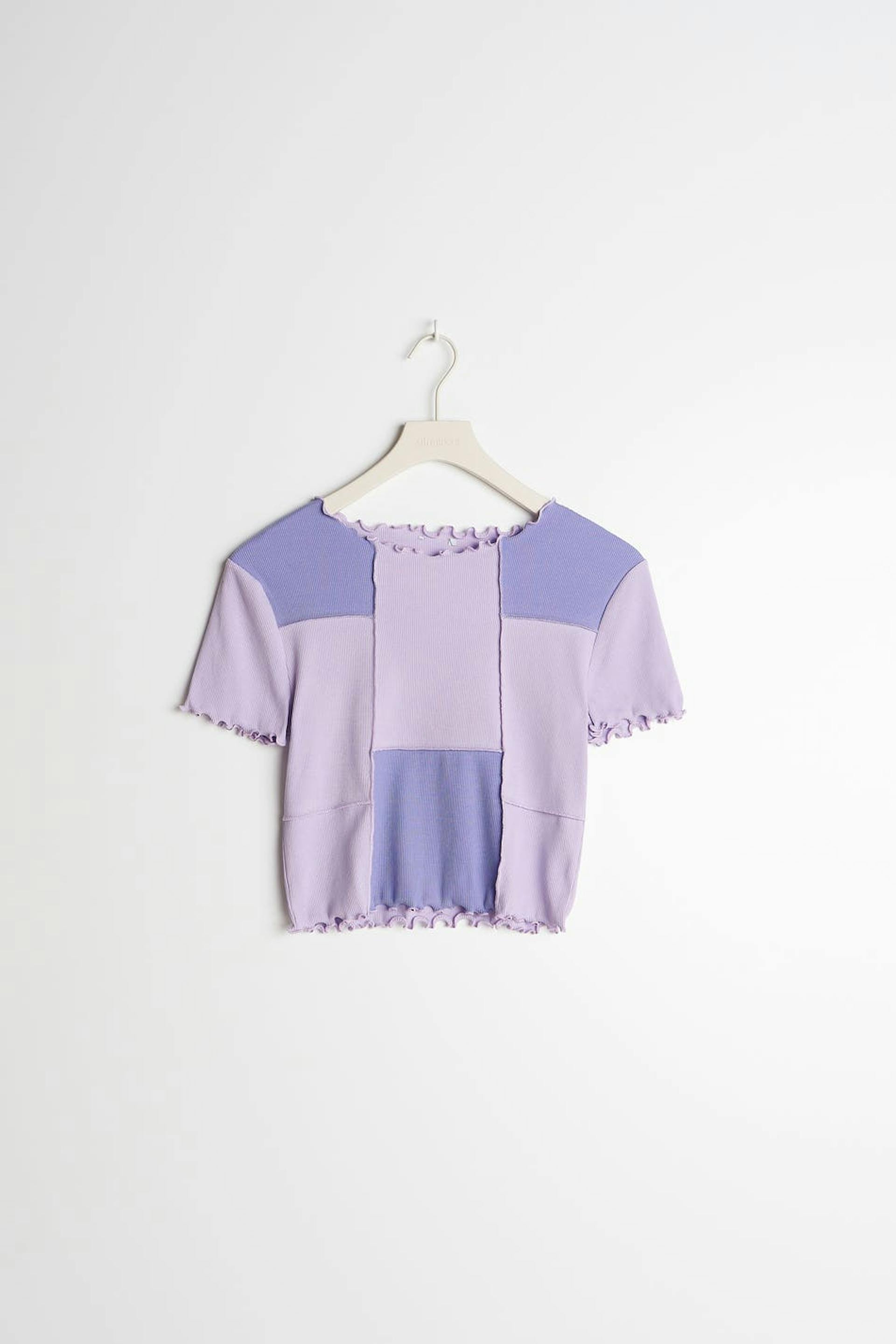 Topje van uit ons Young-assortiment met korte mouwen met nauwsluitende pasvorm. Het topje is paars en heeft een opgelapt ontwerp met decoratieve naden. Het heeft een afgesneden lengte, geribbelde kwaliteit en gegolfde zoom met smalle details met franjes aan de onderkant en aan de halslijn.