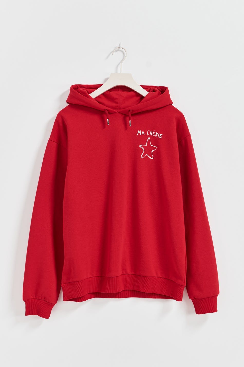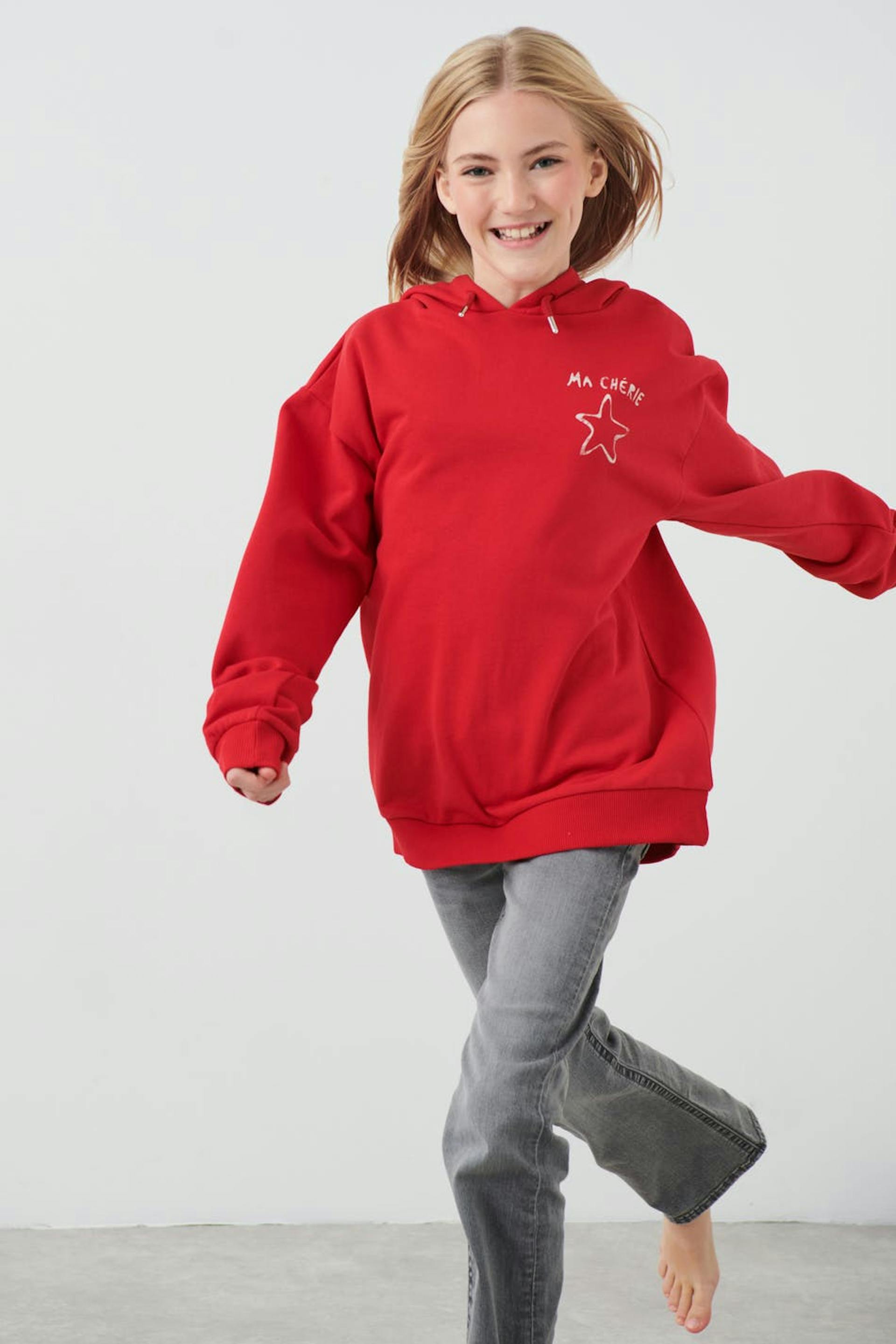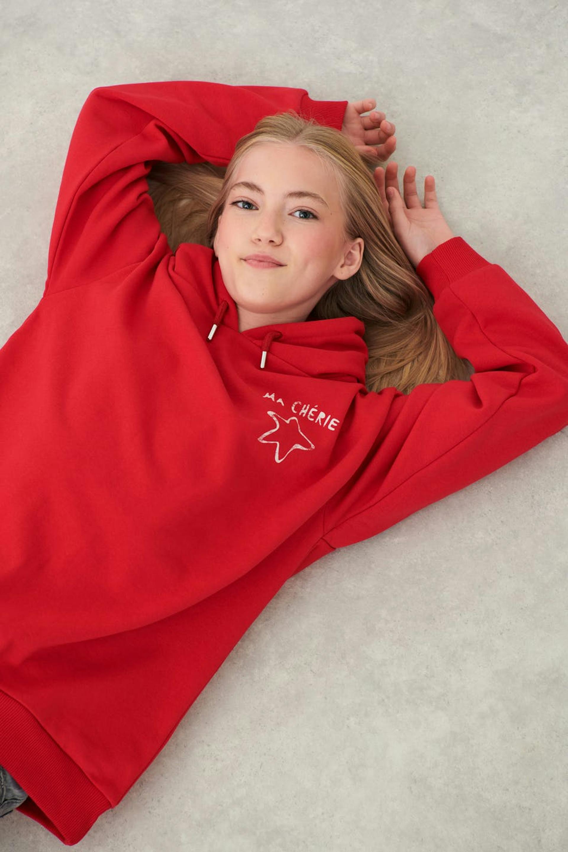 Hoodie van zachte jersey met een overmaatse pasvorm. De hoodie is rood en heeft print aan de voorkant. Het heeft capuchon met trekkoord en ribbels aan de mouwuiteinden en aan de onderkant.