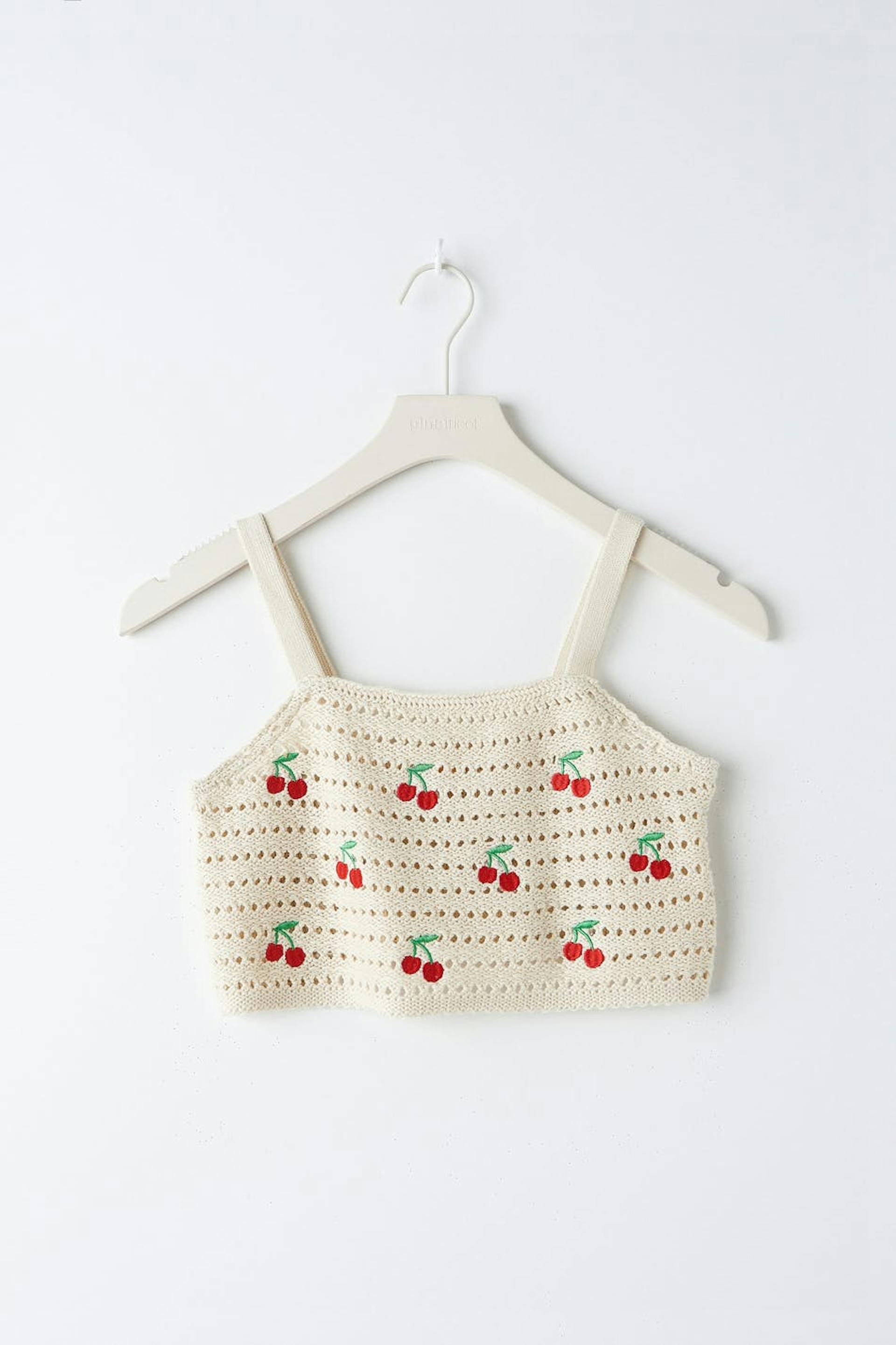 Gebreide tank met geborduurde details aan de voorkant. De tank is beige en heeft een afgesneden lengte.
