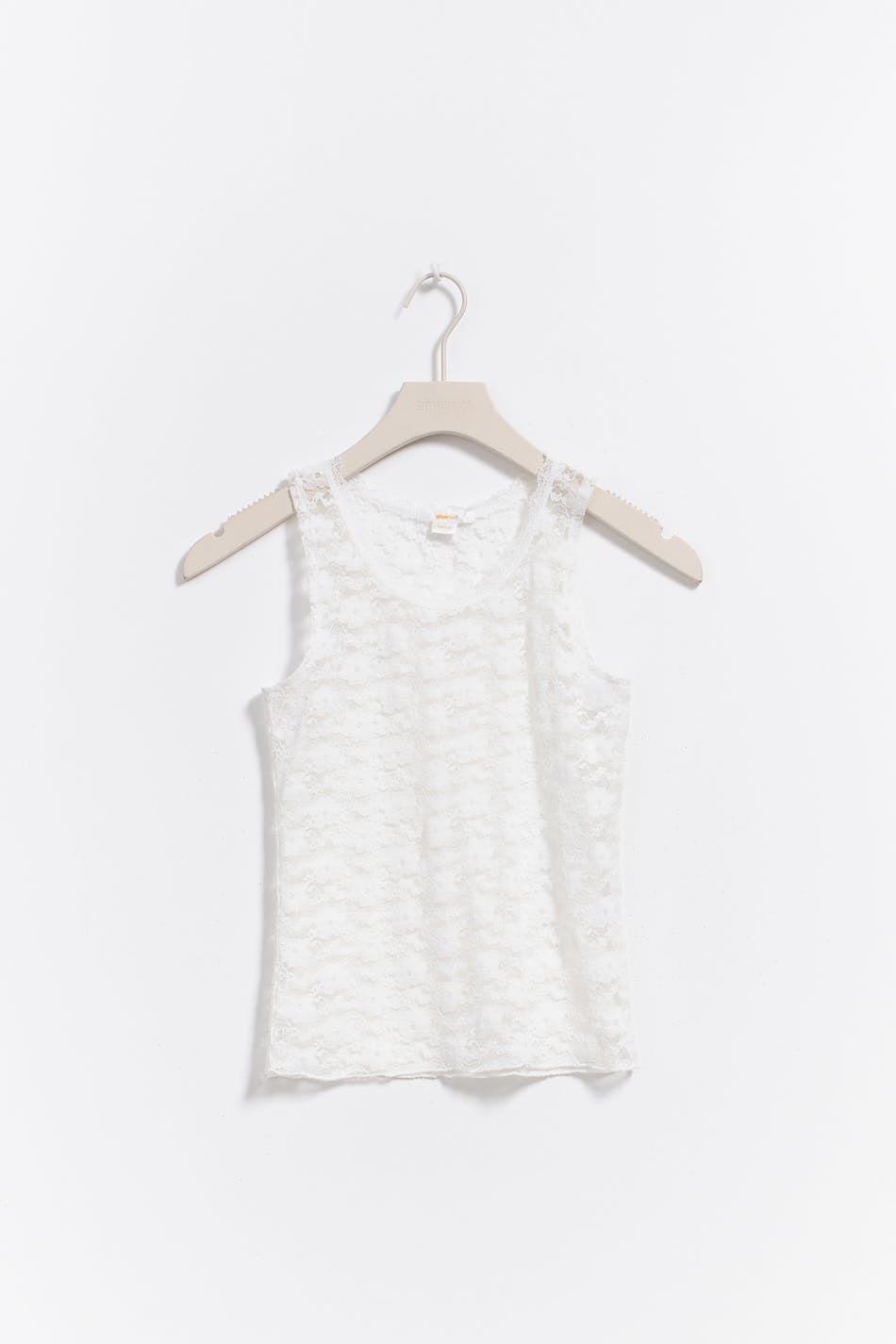 Hemdje van kant met nauwsluitende pasvorm. Het hemdje is wit en heeft ronde halslijn.