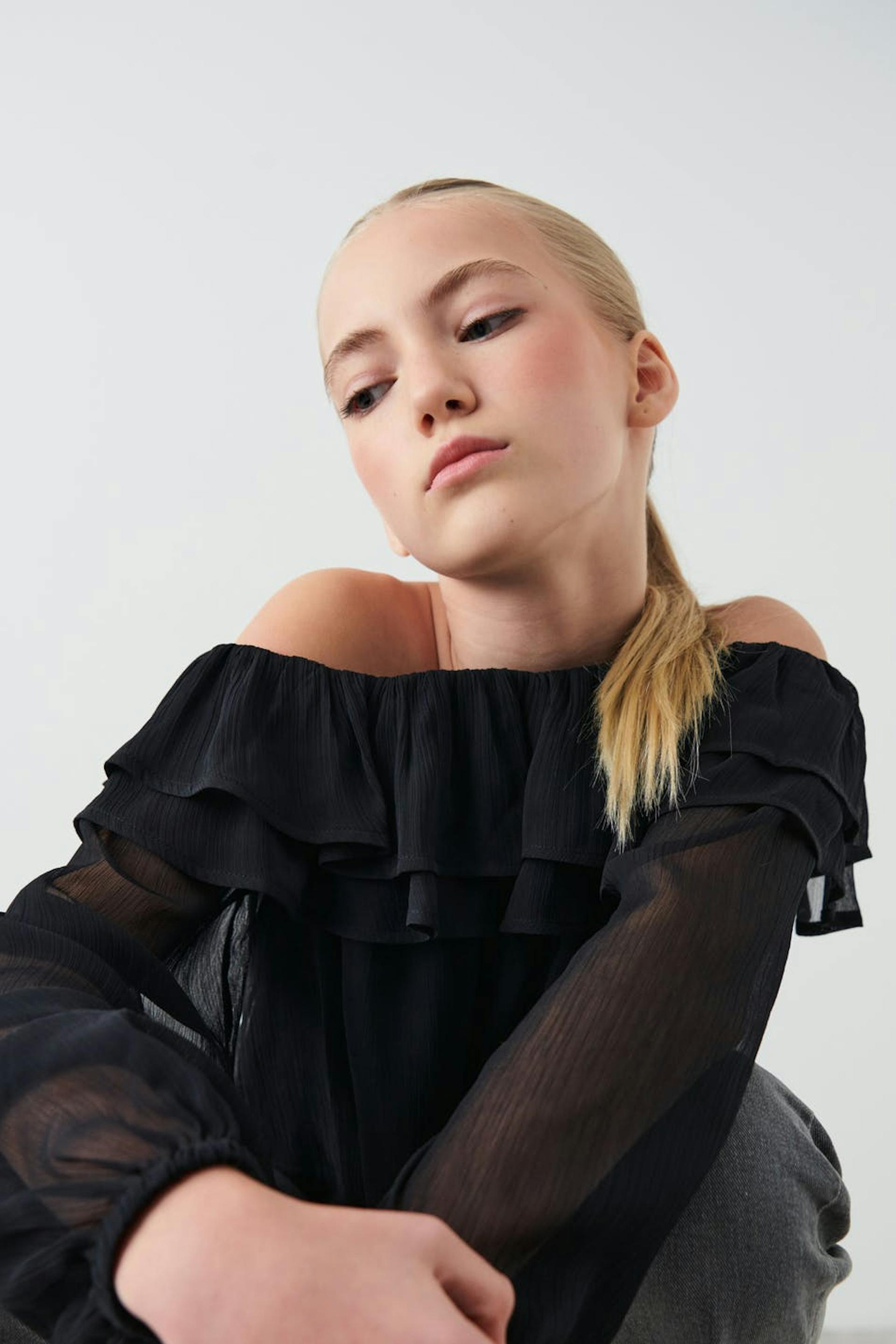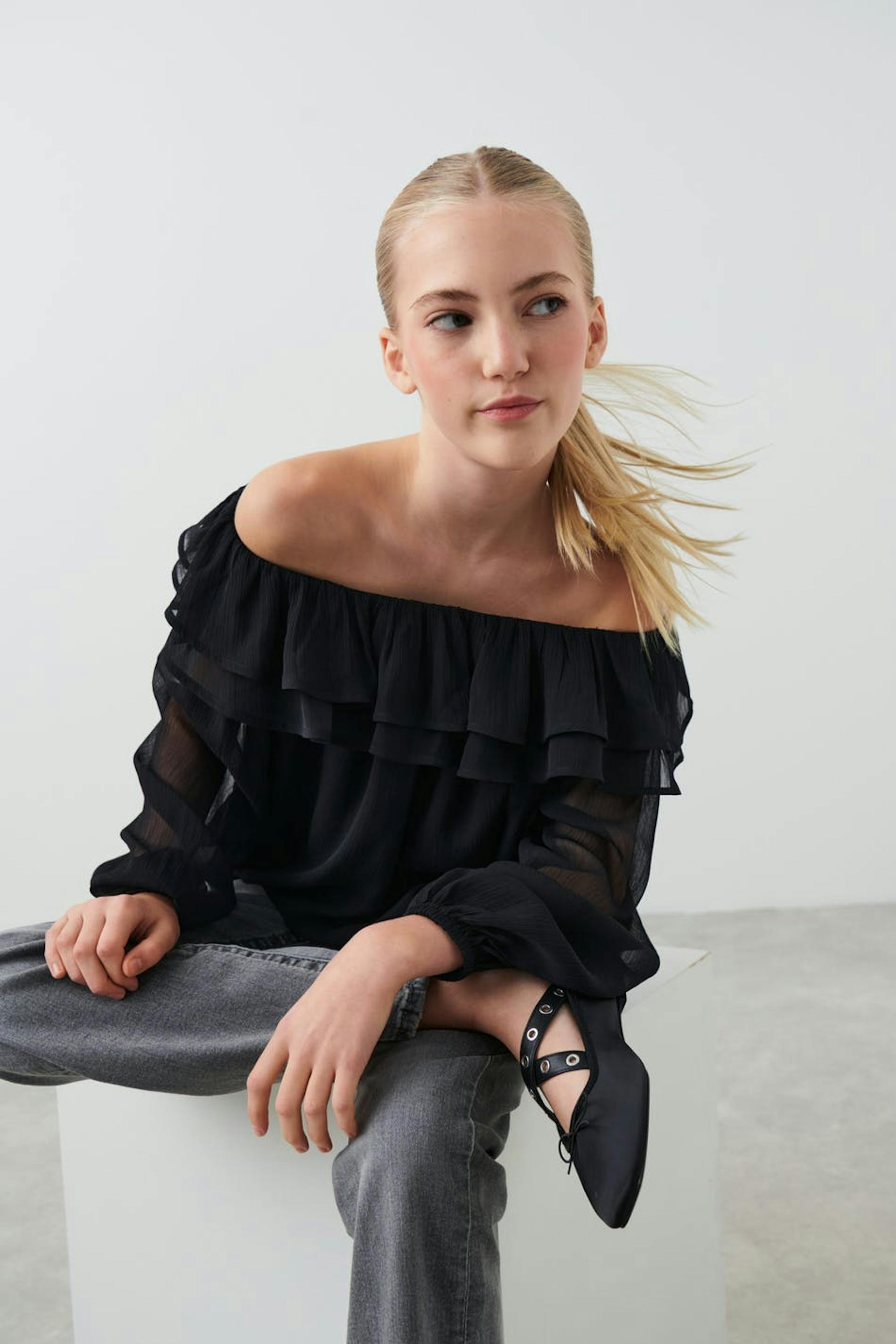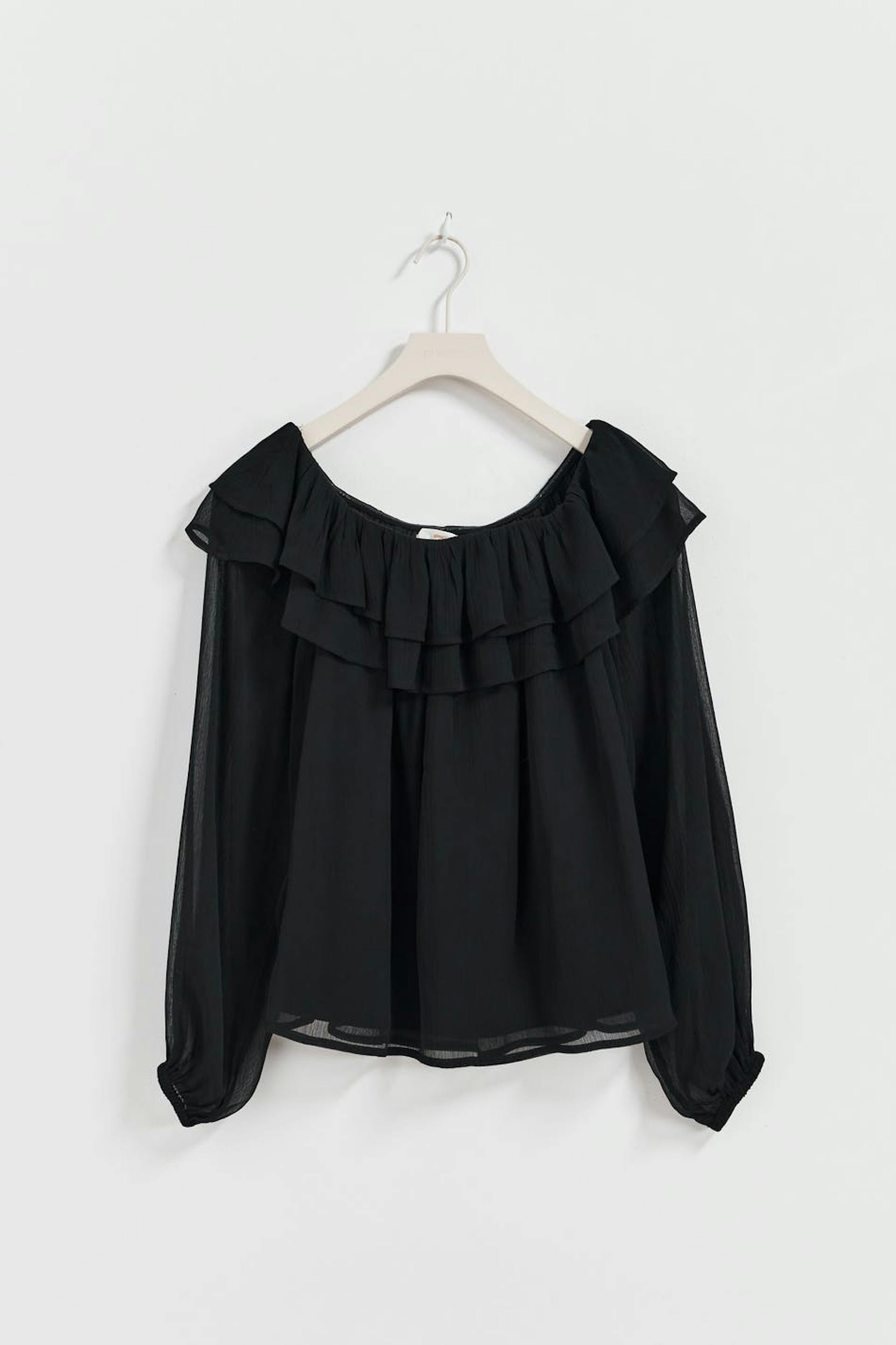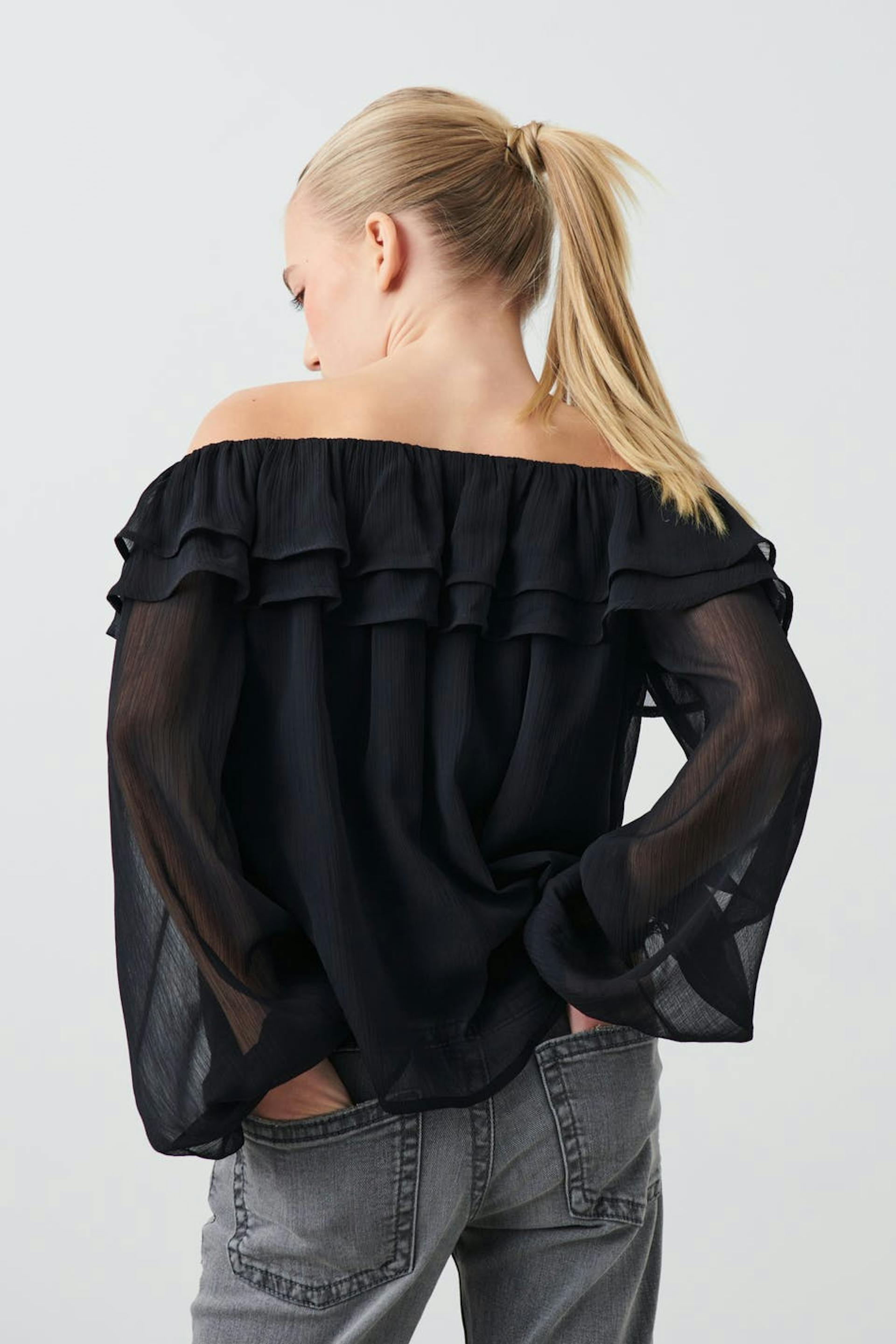Blote schouder blouse met ruches aan de halslijn. De bloes is zwart en heeft lange pofmouw.