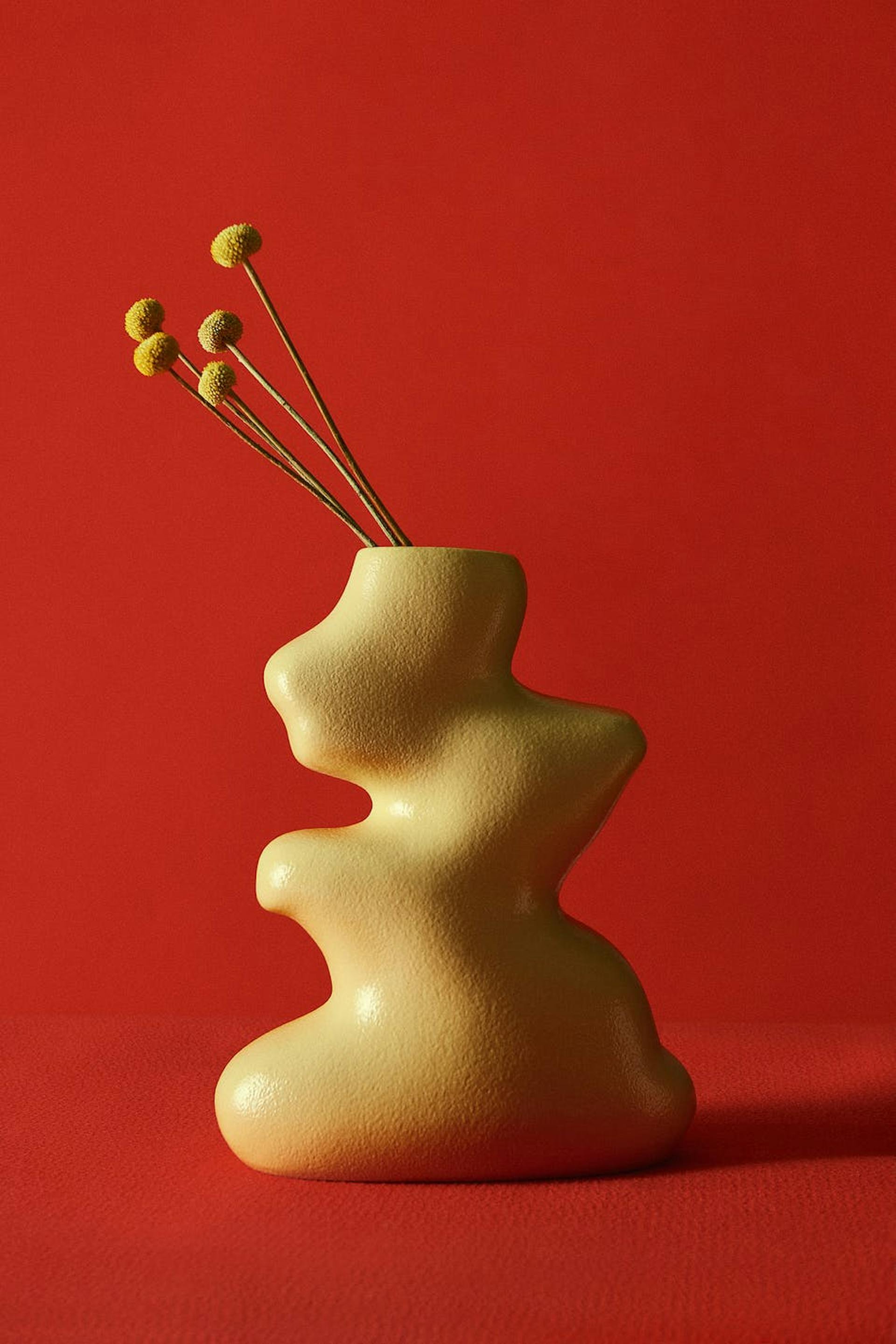 Hobnob X Gina Tricot. Keramisk vase med et unikt design. Vasen er gul og har en asymmetrisk form.