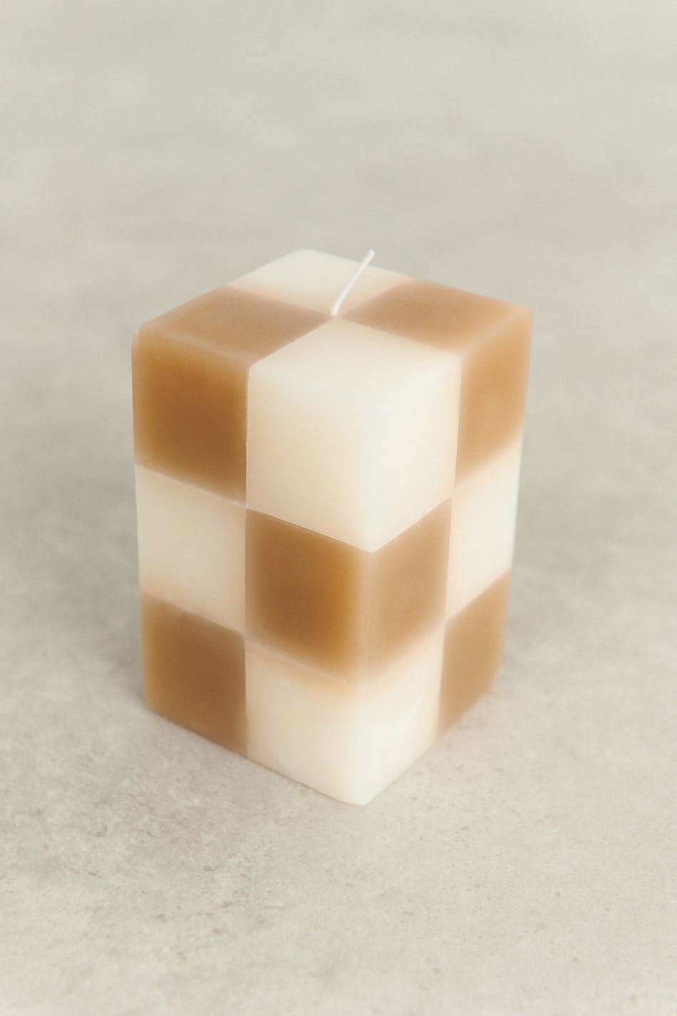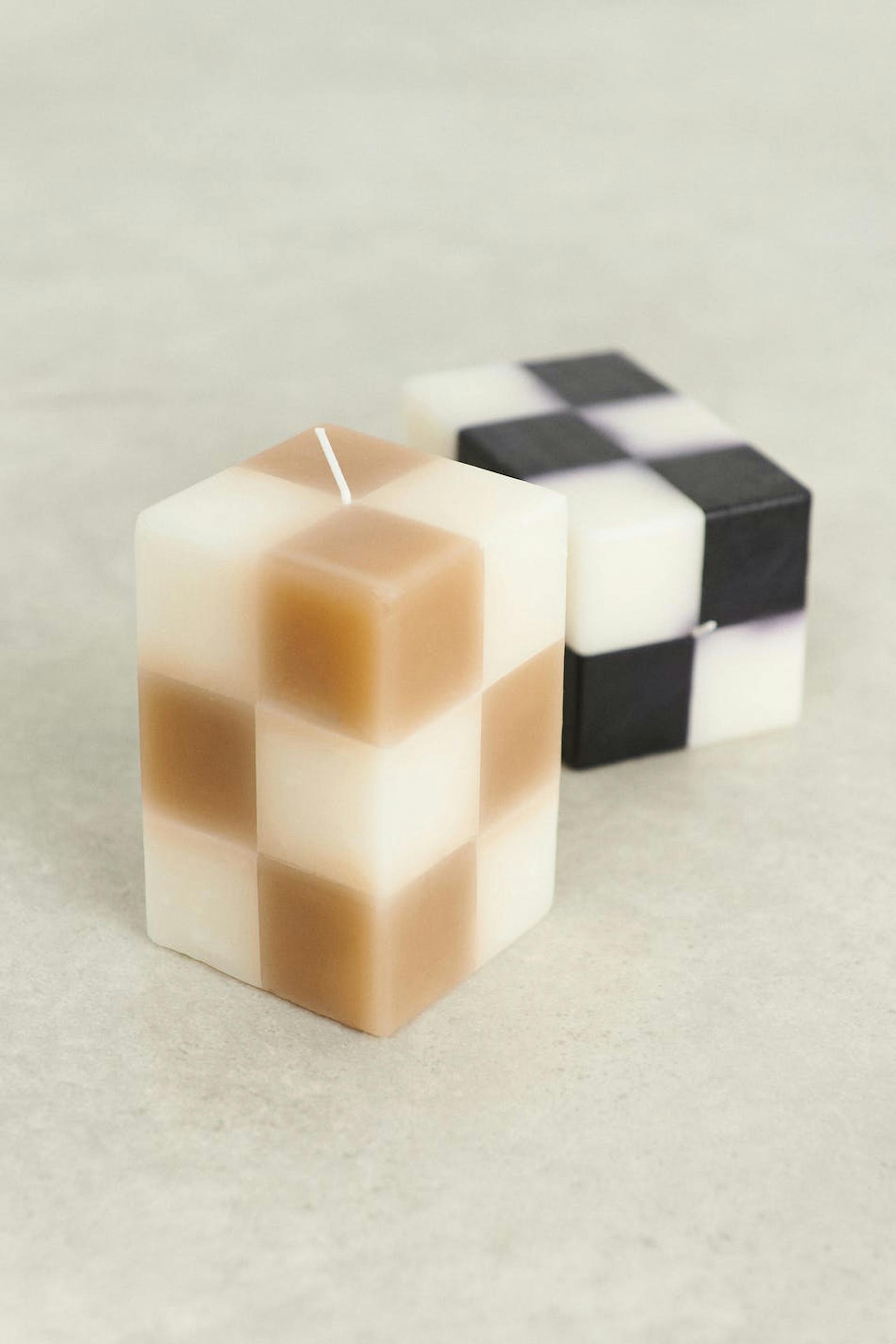 Firkantet lys fra Gina Home med sjakkrutete mønster. Lyset er beige og hvitt.