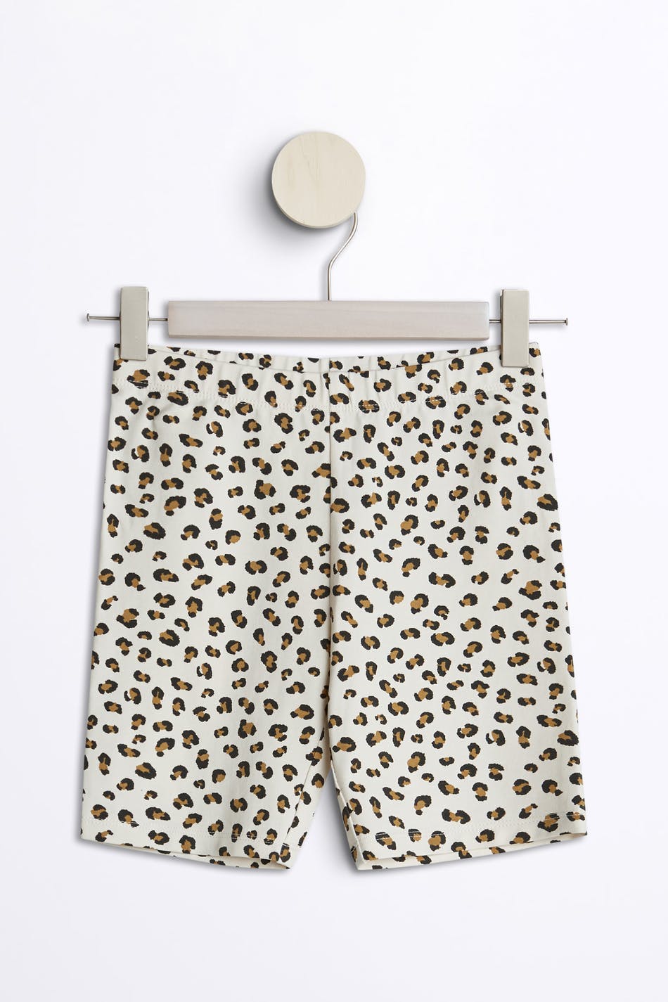 Kort sykkelshorts for babyer. Shortsen er beige og leopardmønstret. Den er laget av jersey.